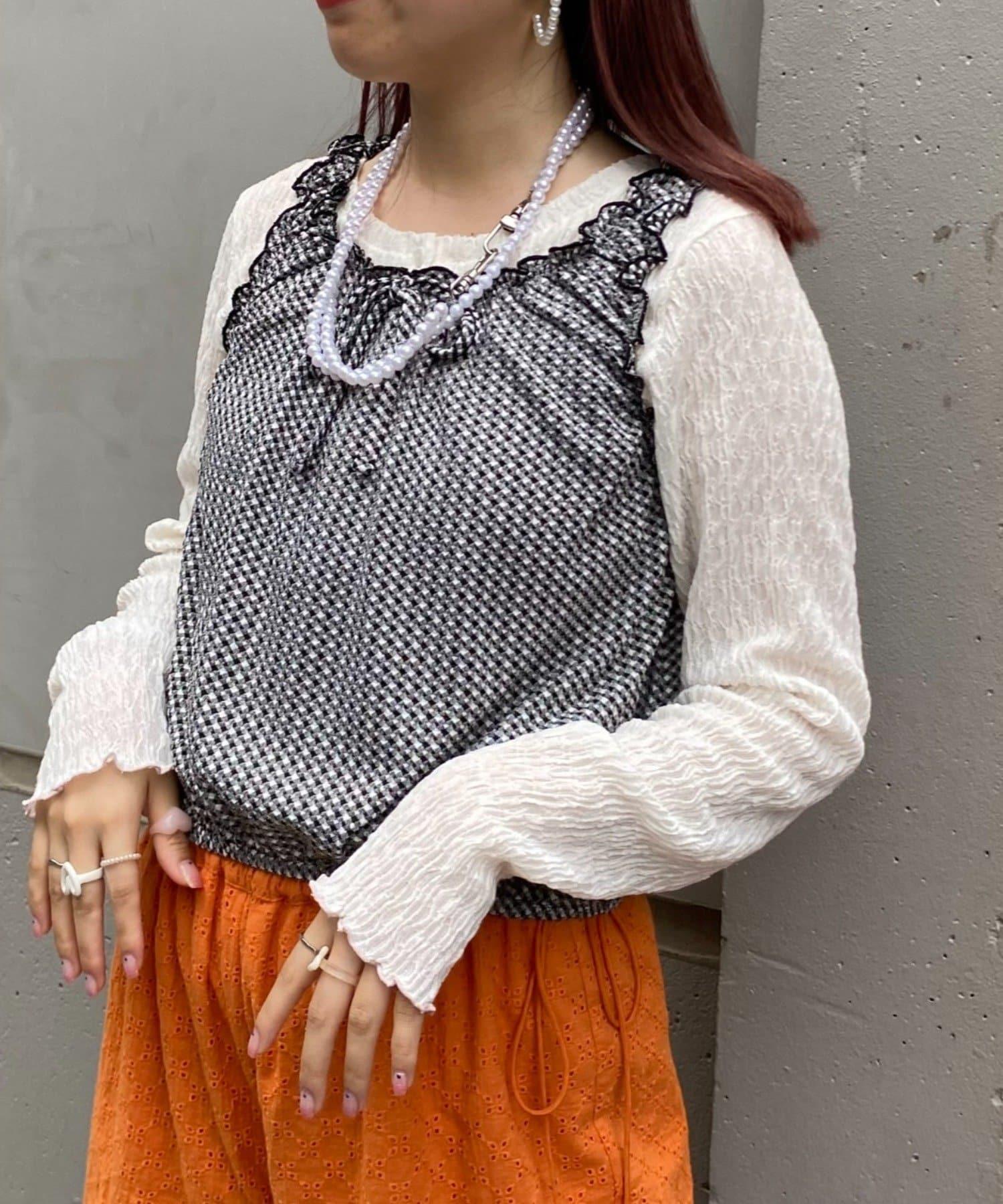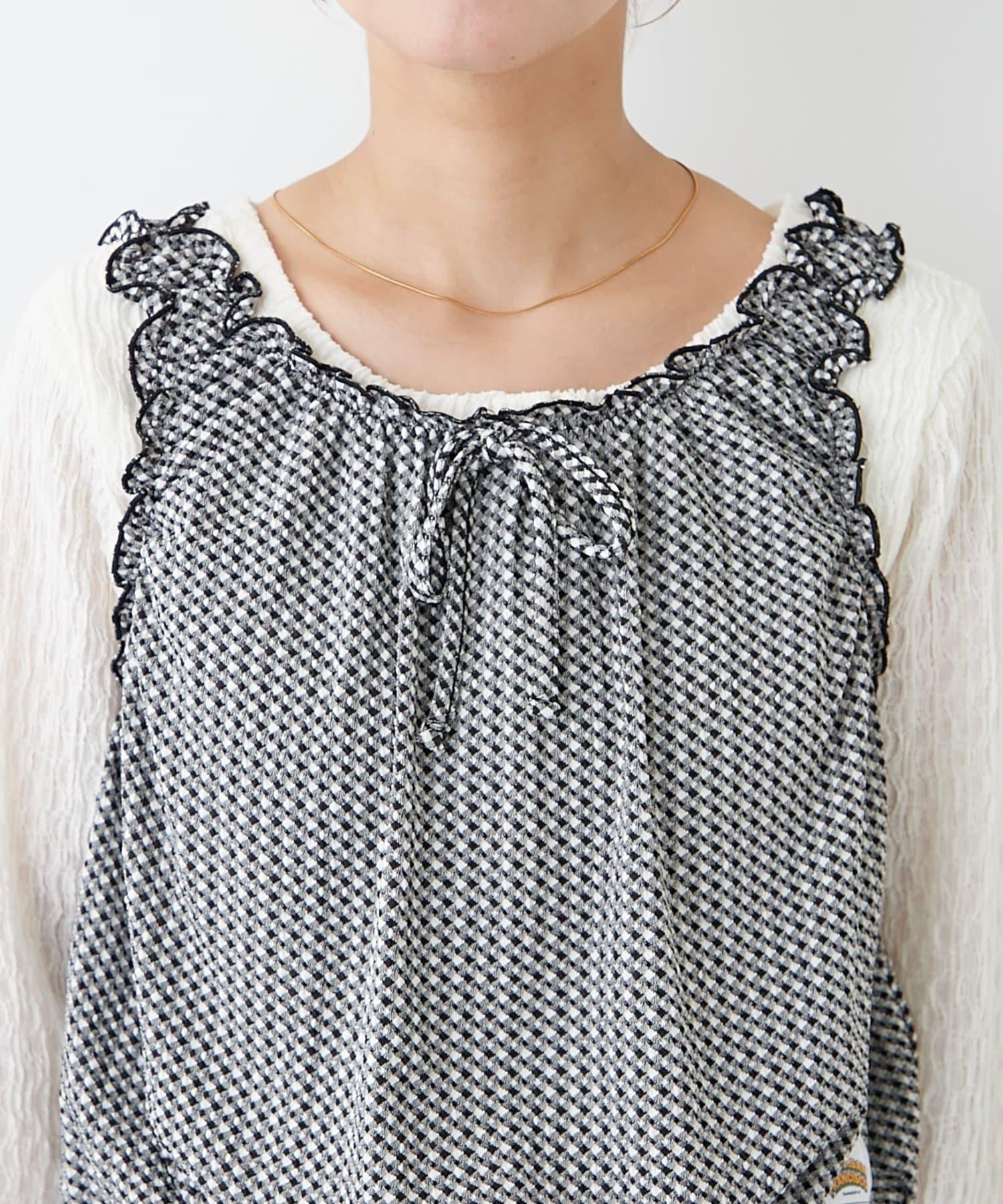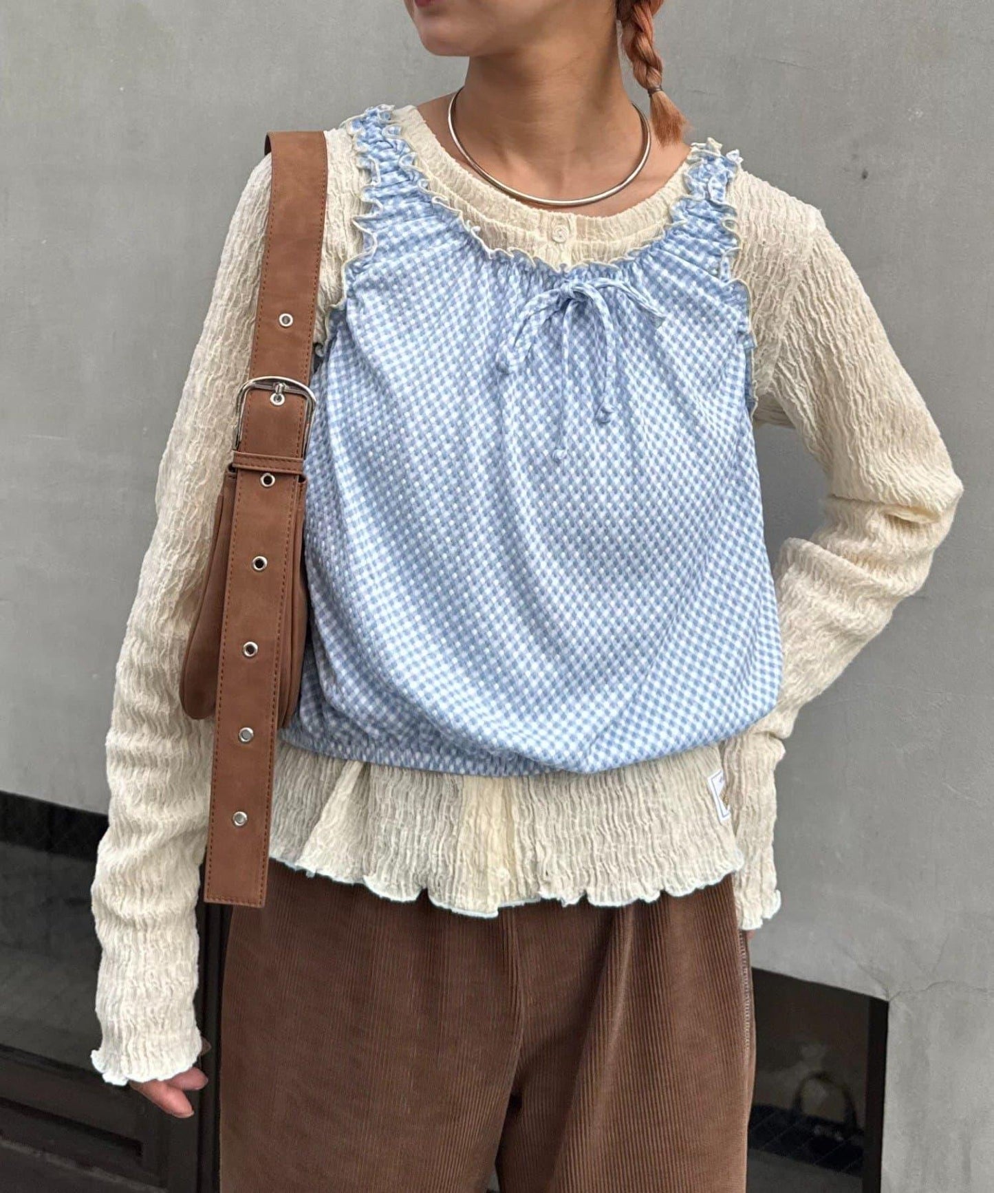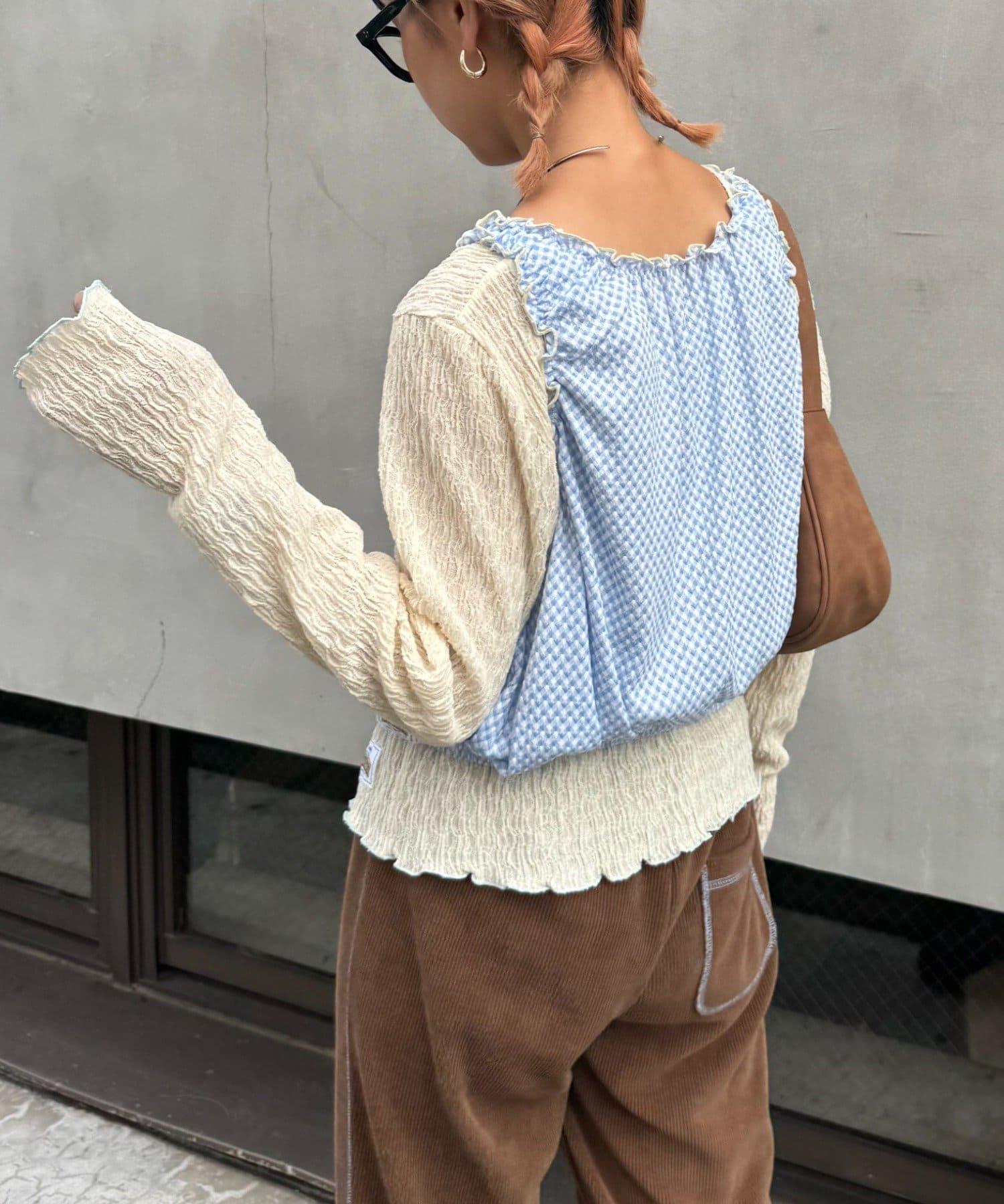 略帶透明感的白色剪裁縫製套裝搭配格紋格子氣球上衣,只需一件單品就能完成造型。