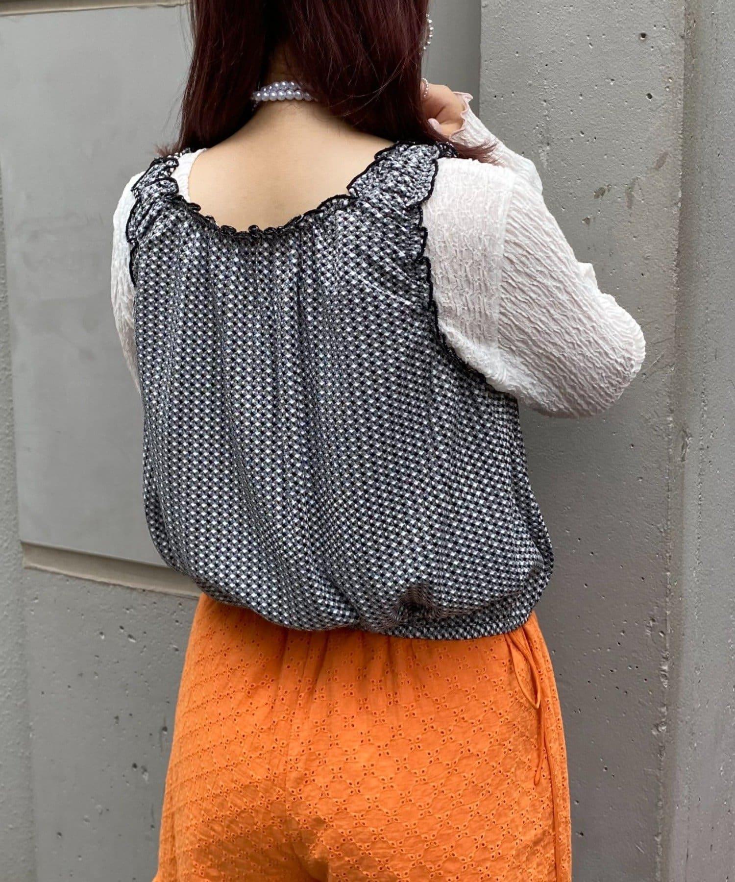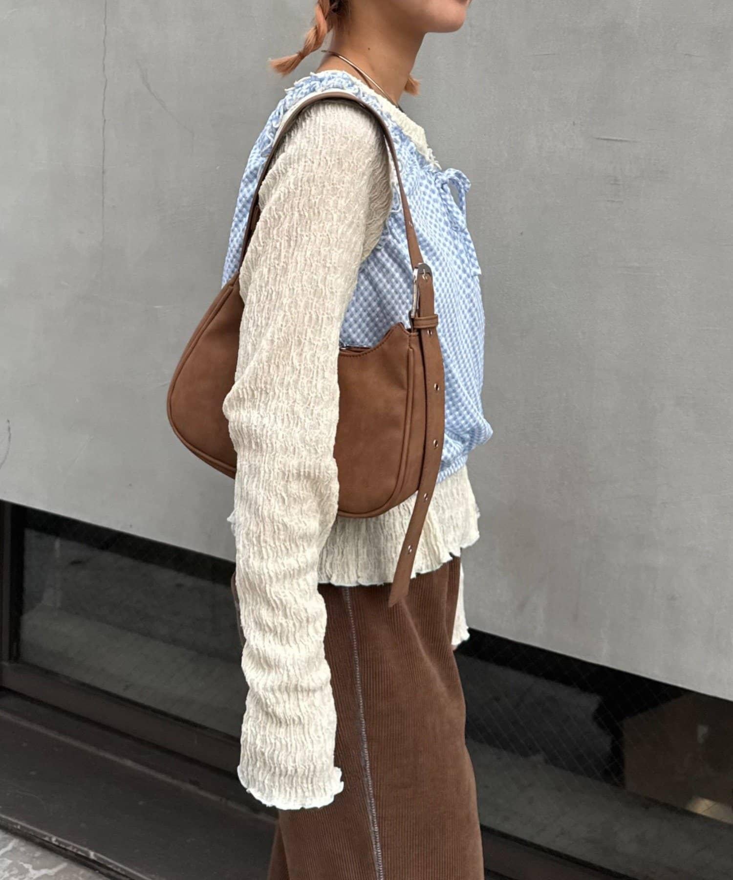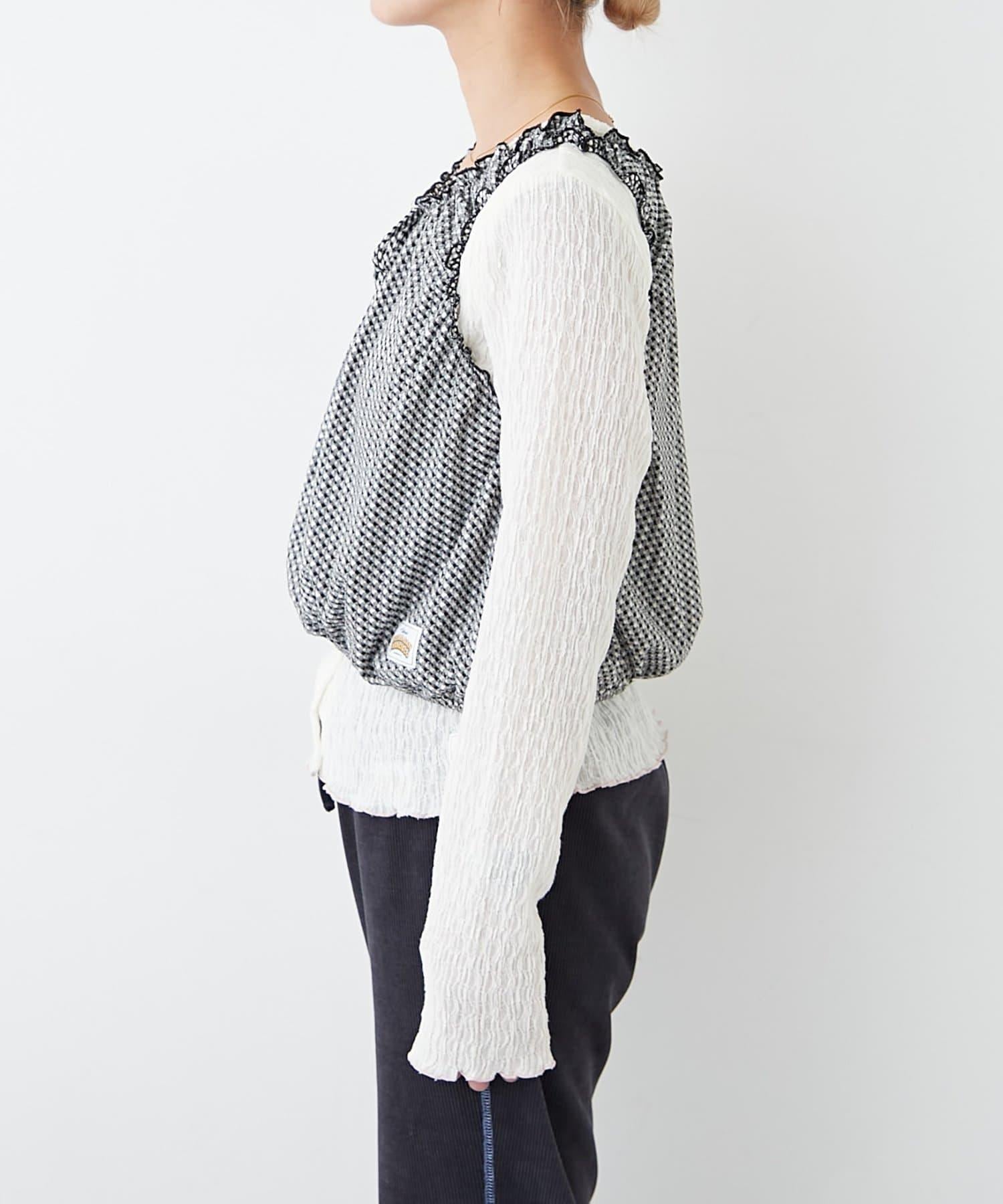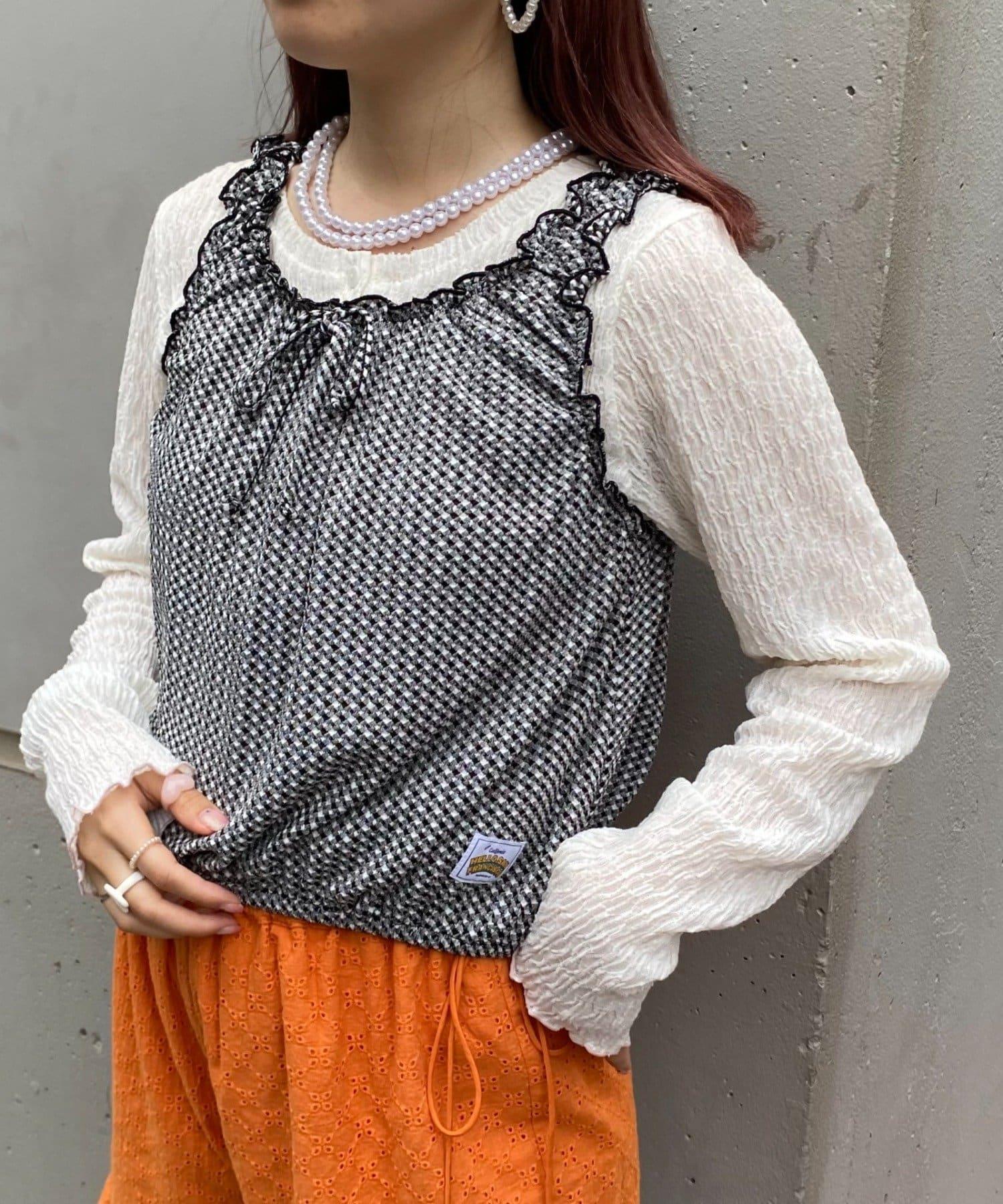 略帶透明感的白色剪裁縫製套裝搭配格紋格子氣球上衣,只需一件單品就能完成造型。