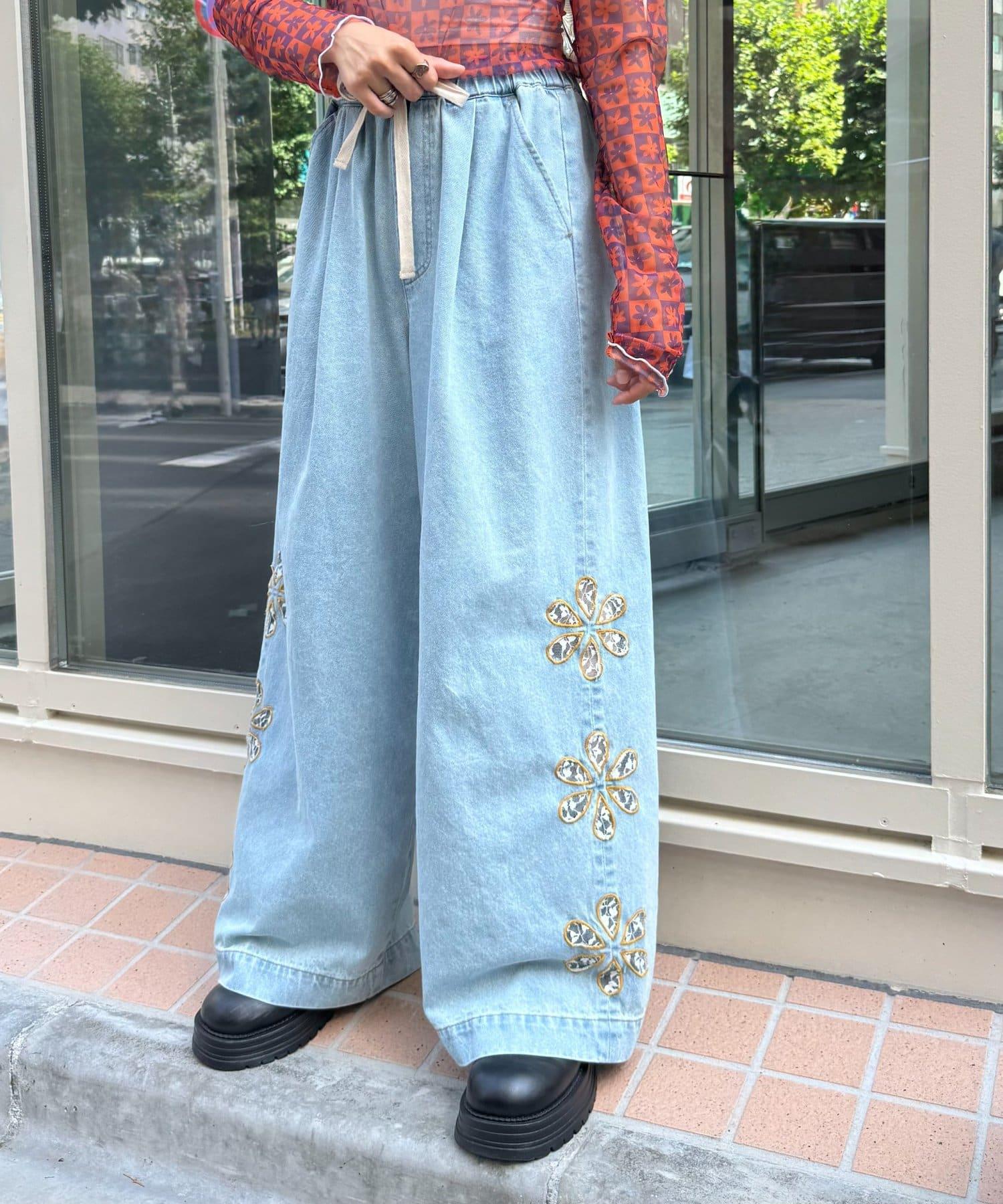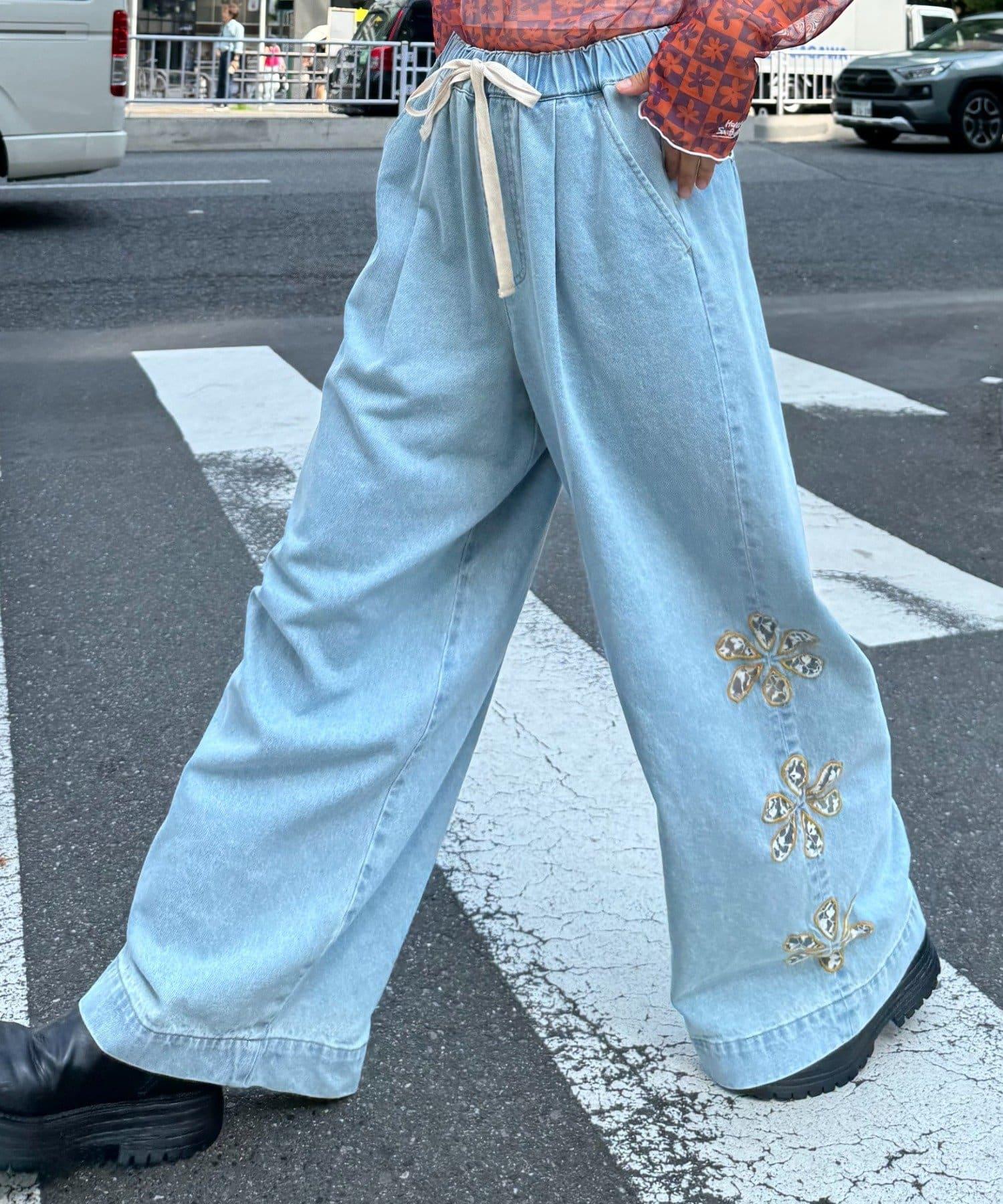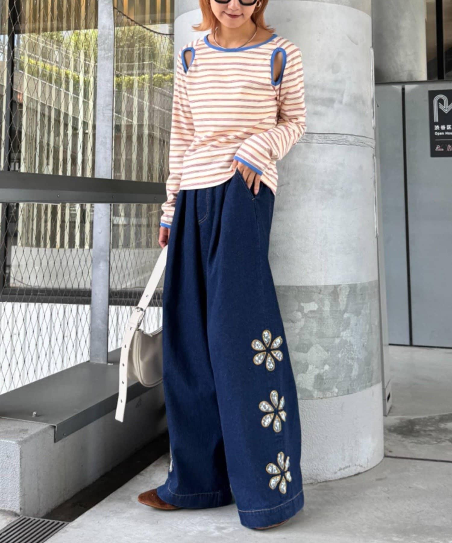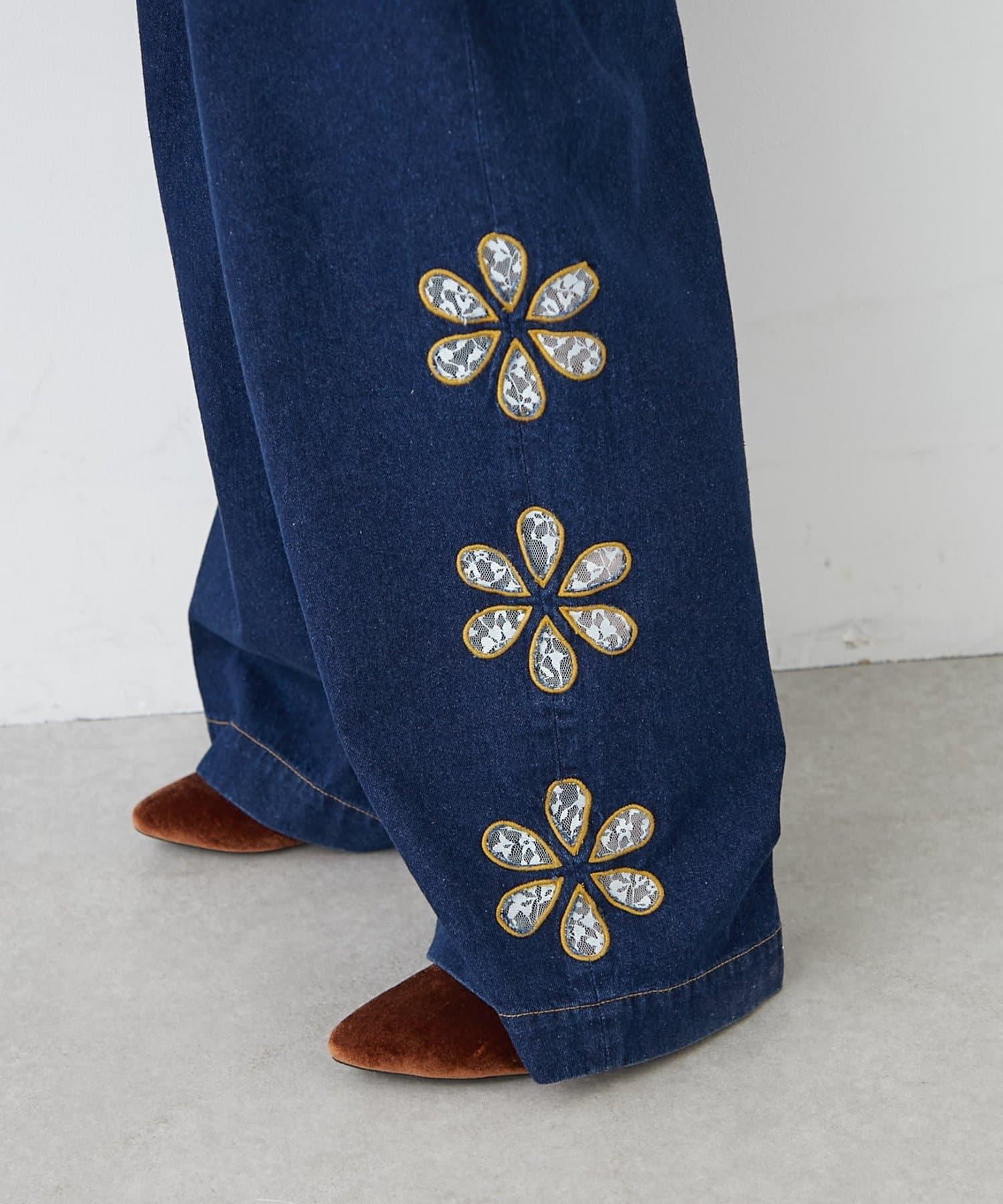 寬大的牛仔面料,側面有醒目的花朵剪裁設計,並鑲嵌有蕾絲花邊。