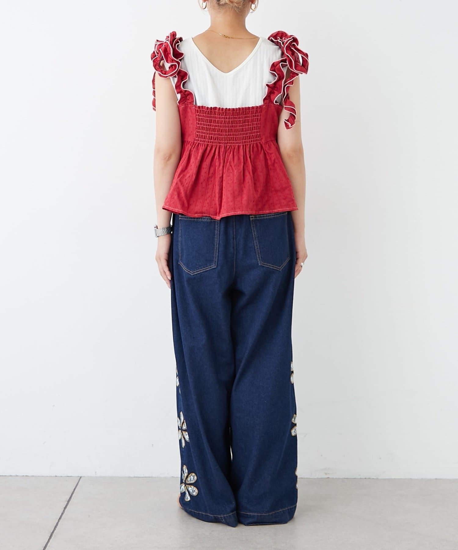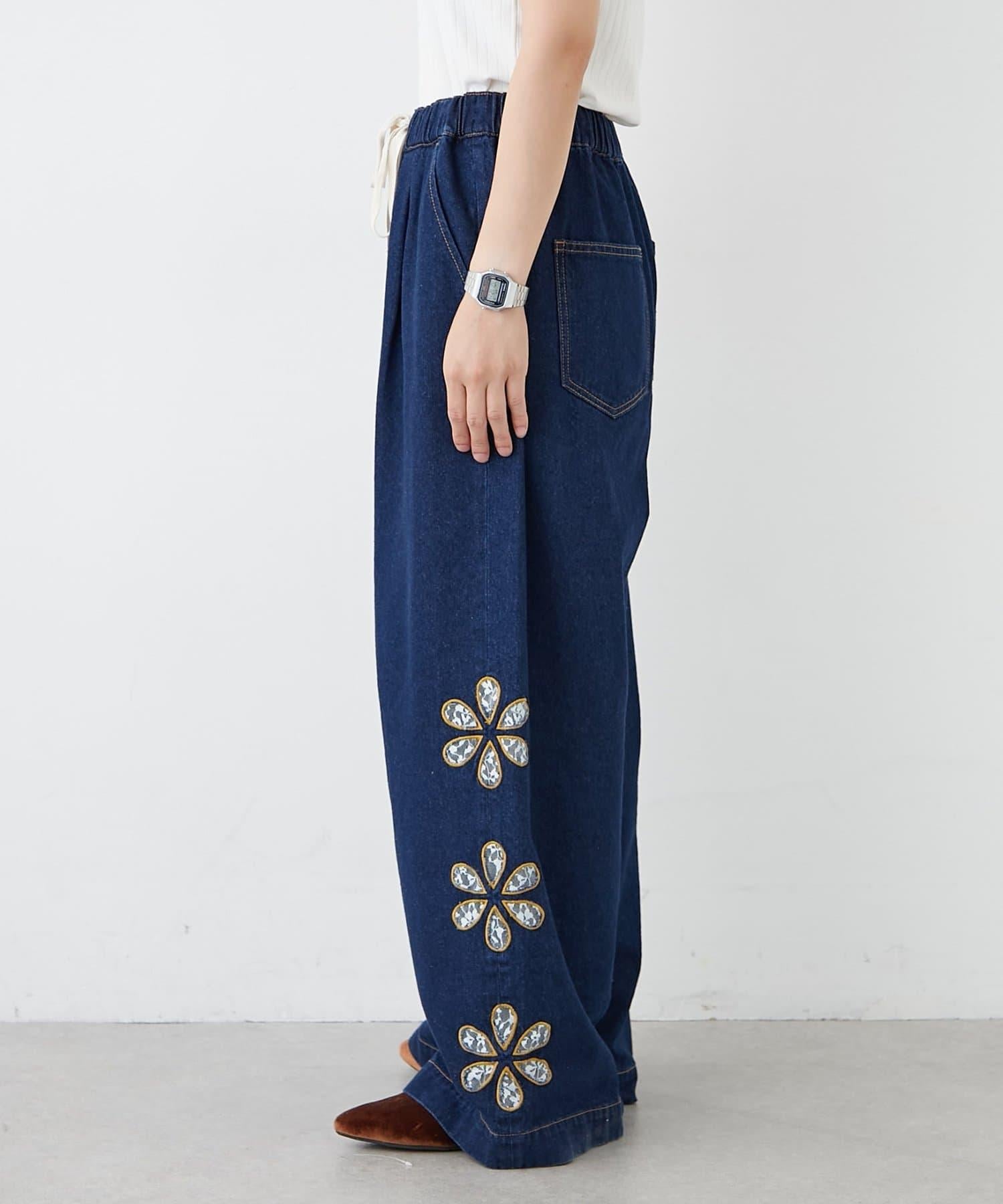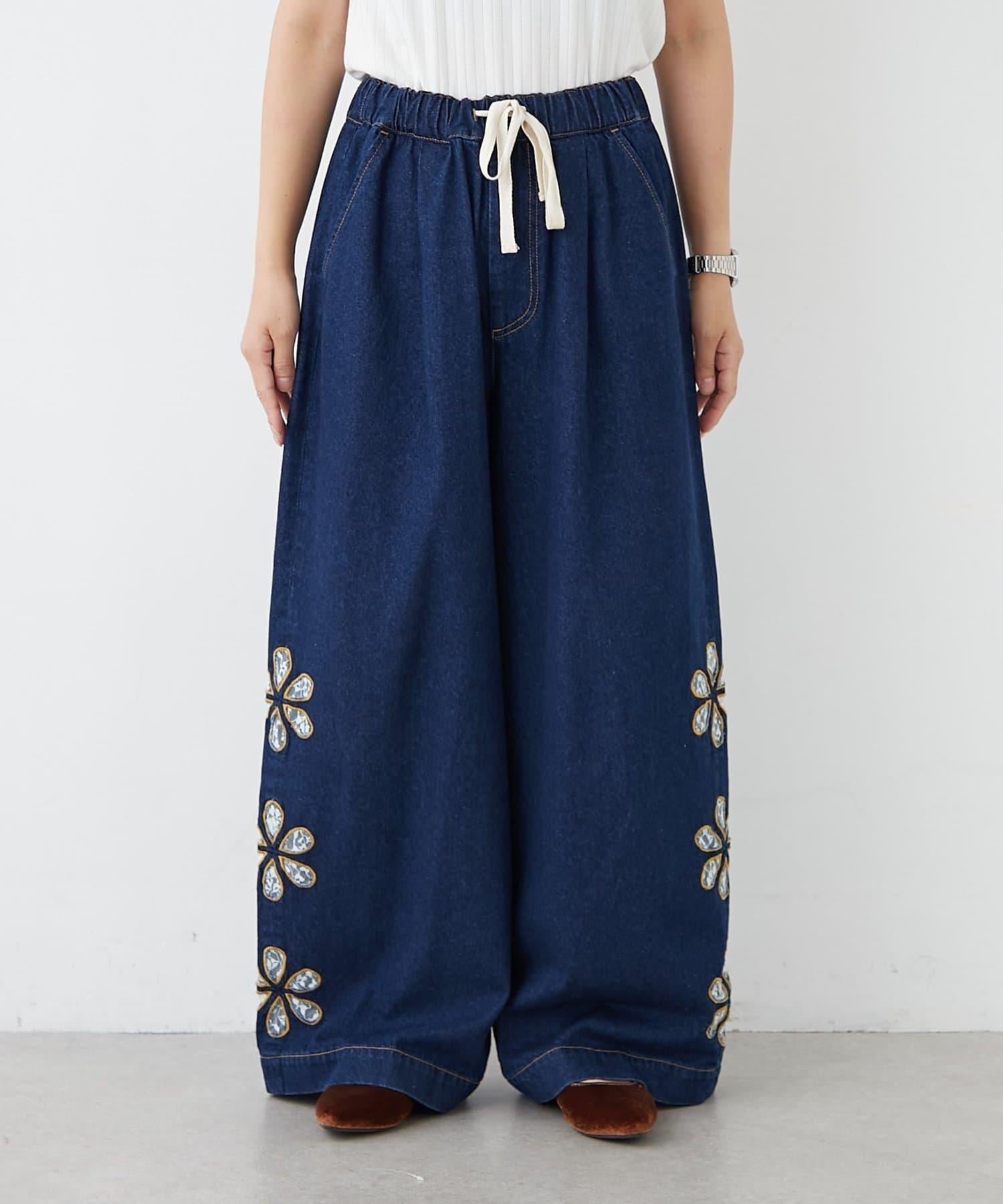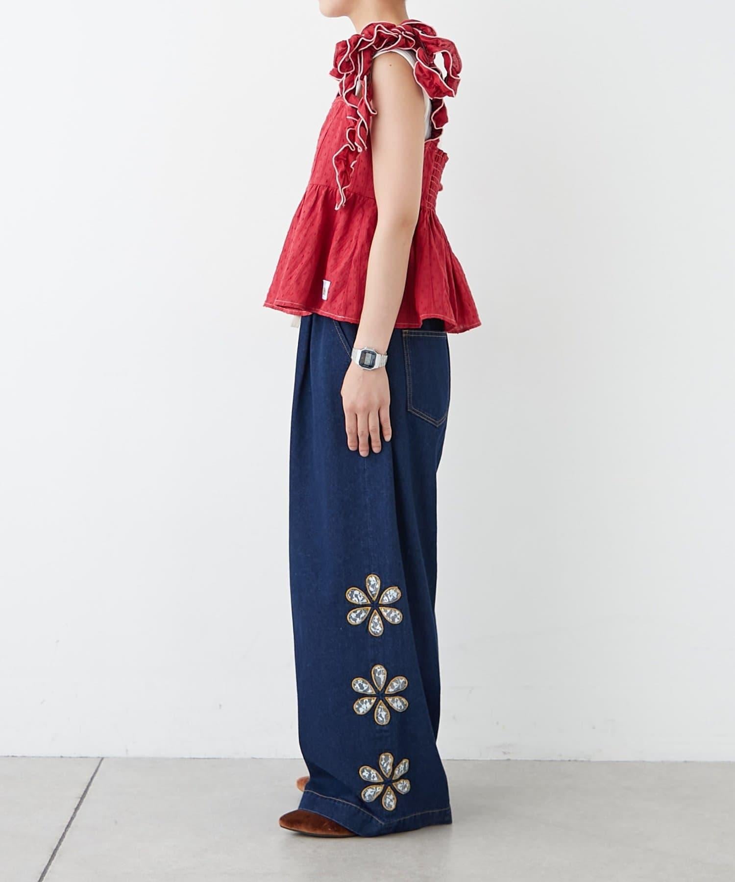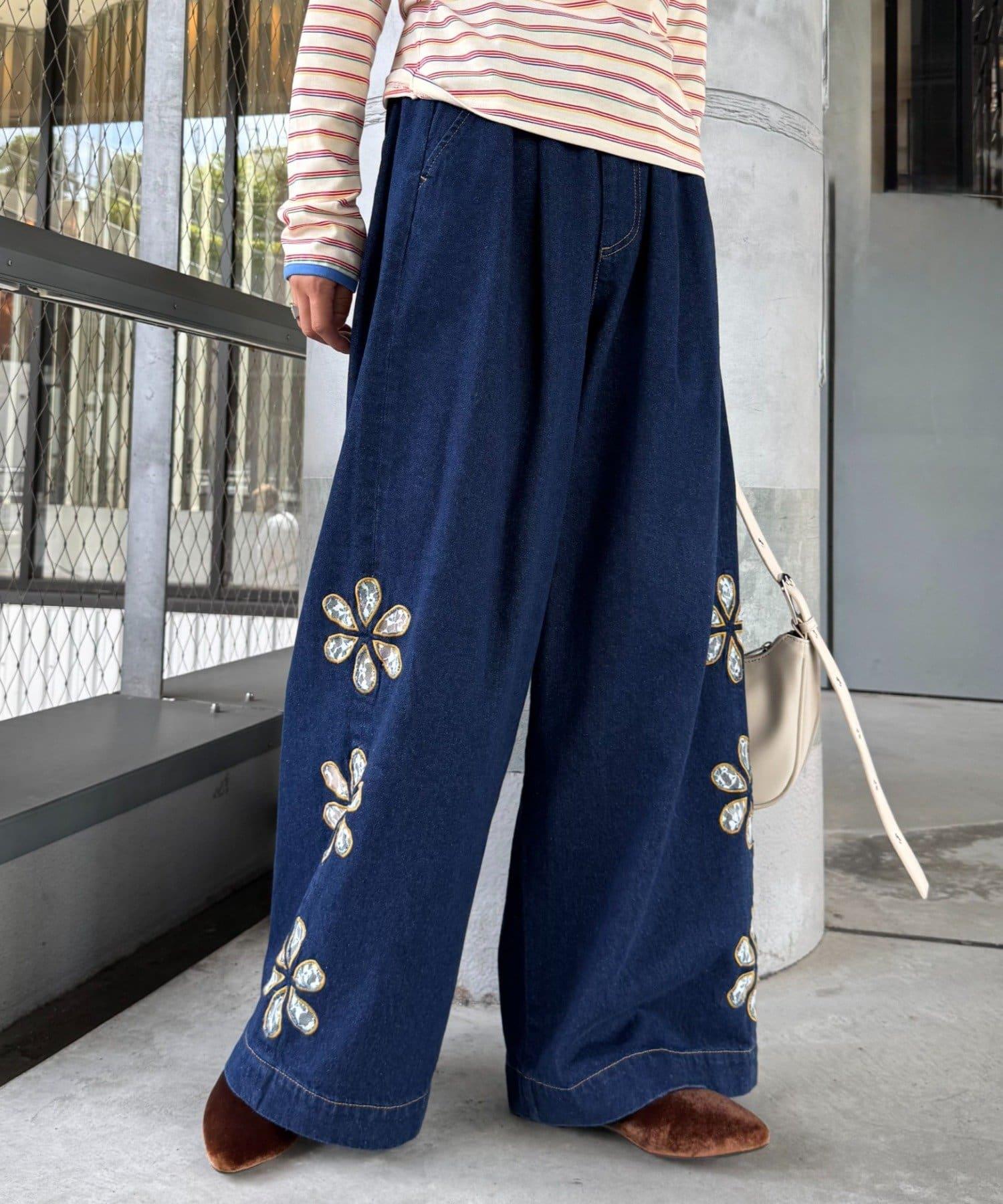 寬大的牛仔面料,側面有醒目的花朵剪裁設計,並鑲嵌有蕾絲花邊。