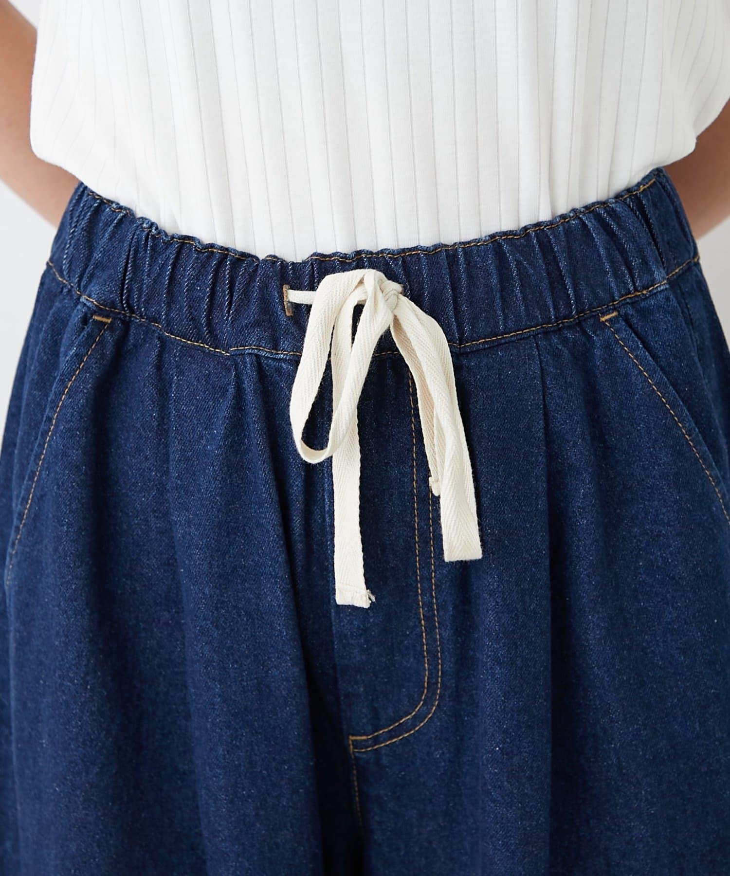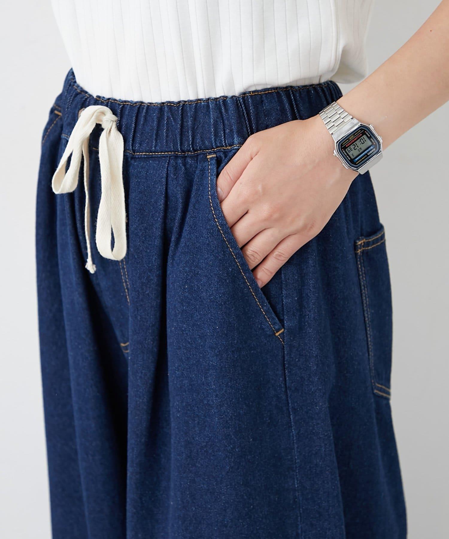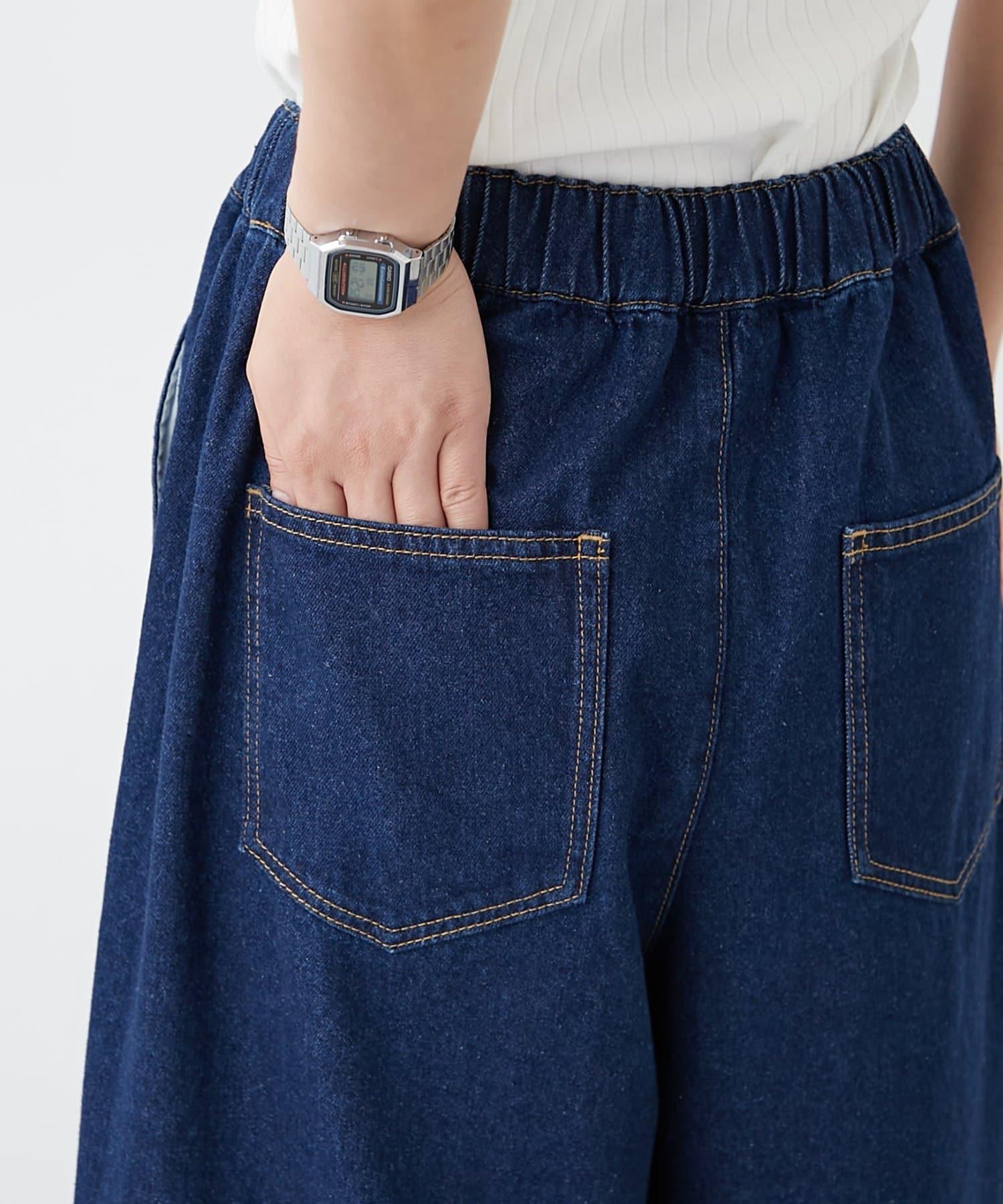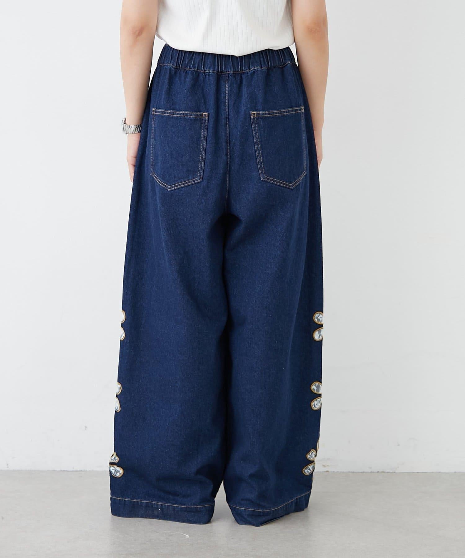 寬大的牛仔面料,側面有醒目的花朵剪裁設計,並鑲嵌有蕾絲花邊。