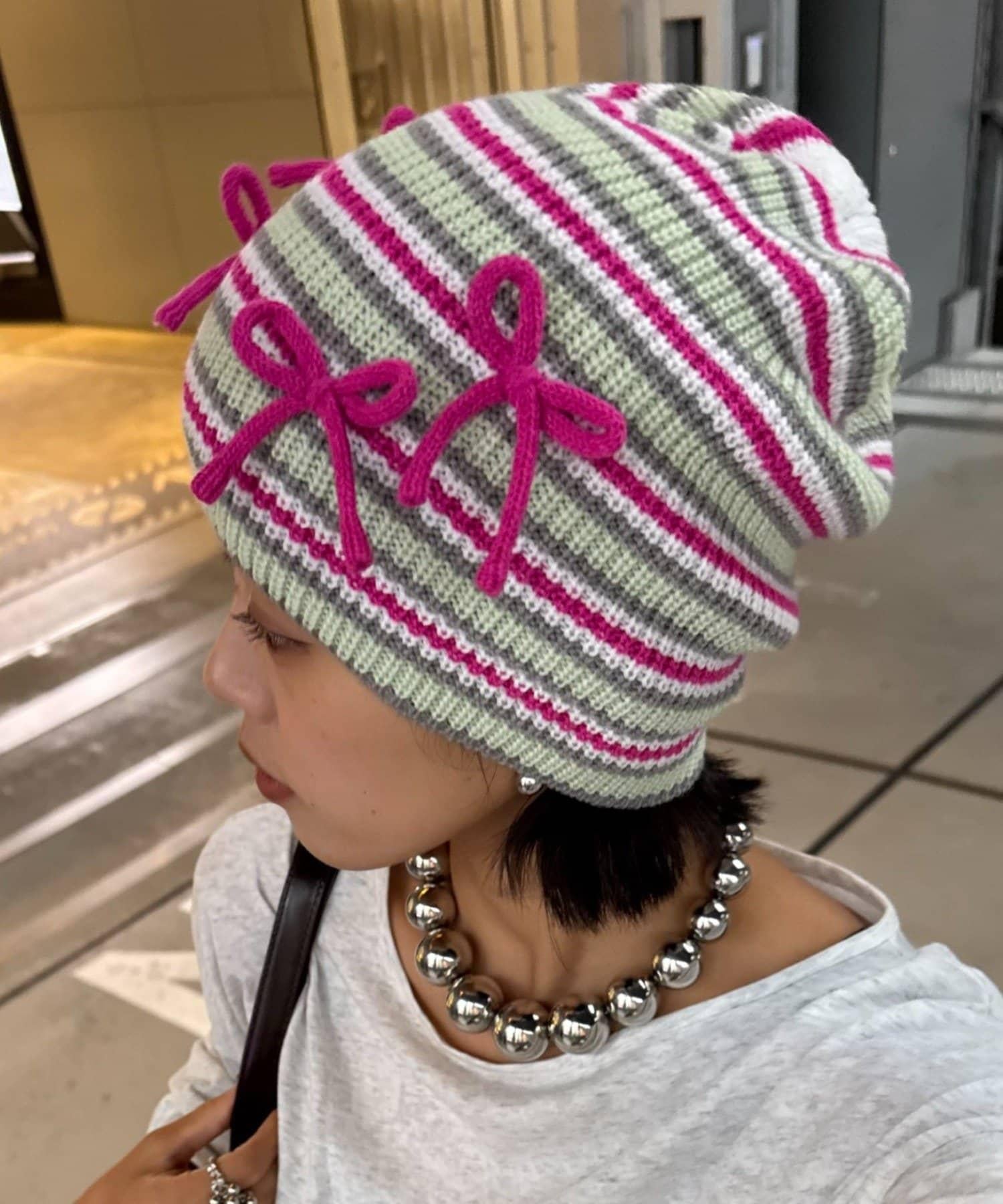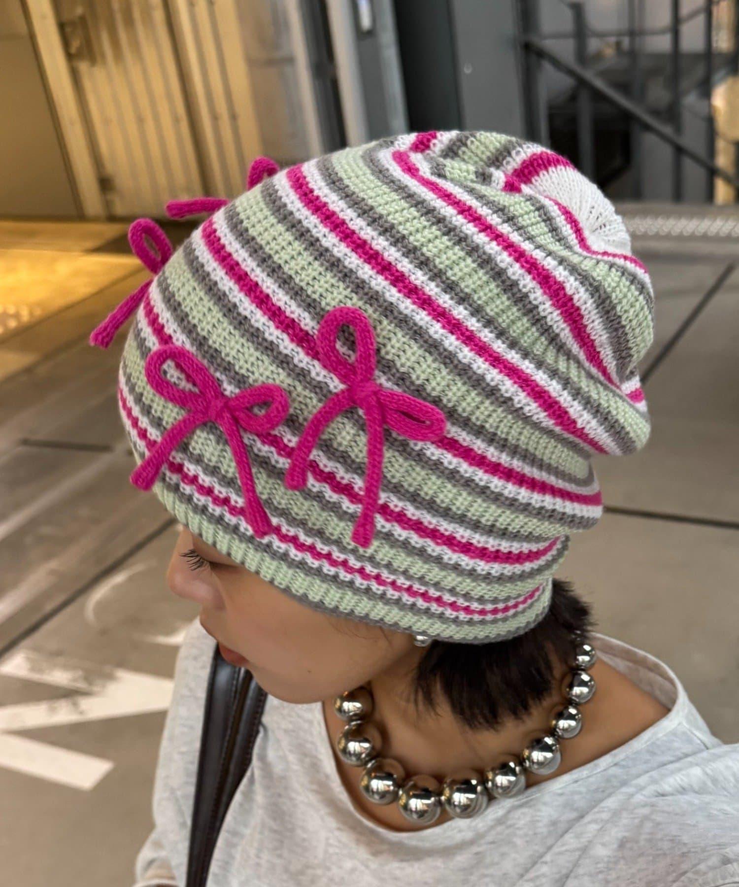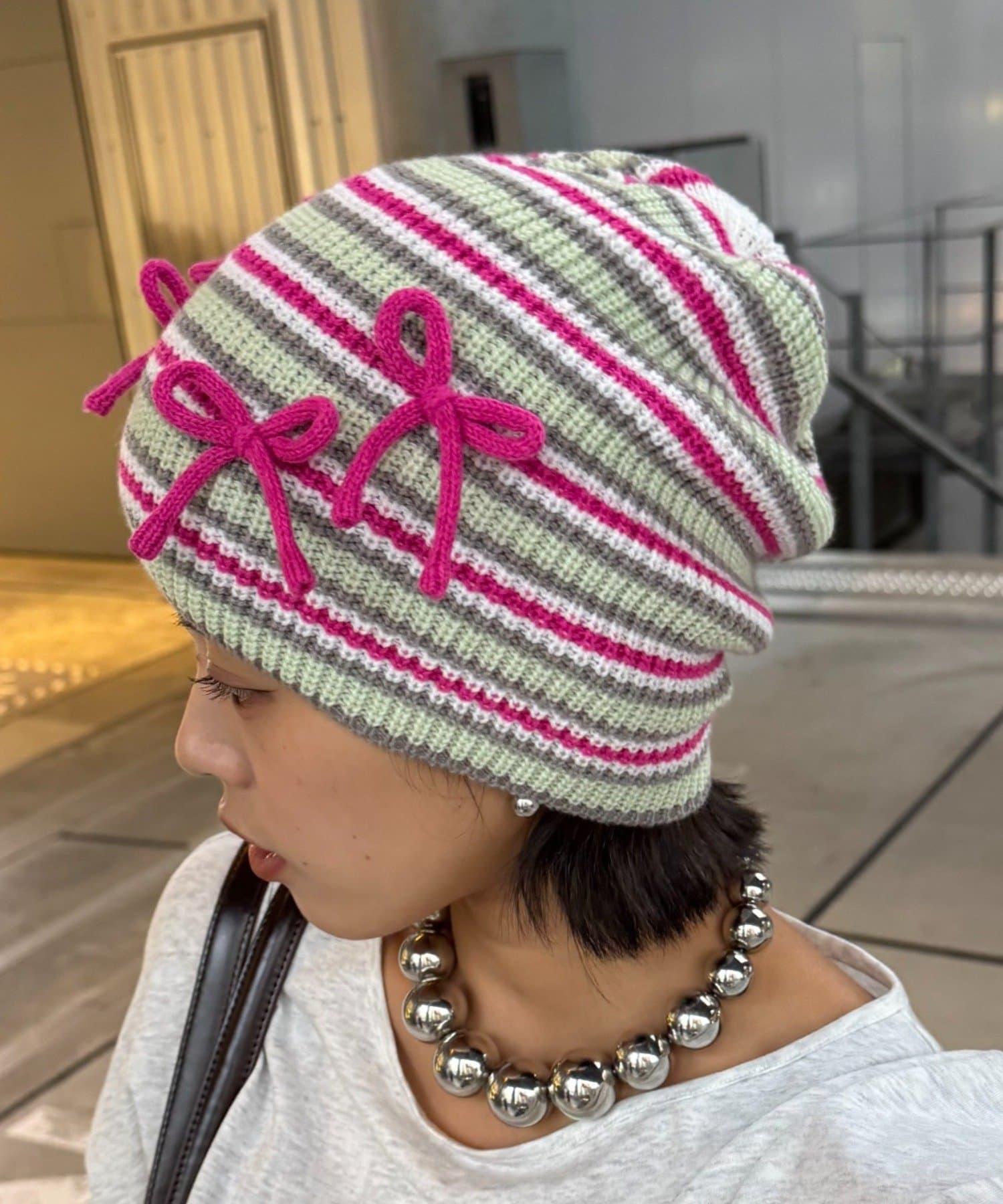 ★【HELLO.SANFRANCISCO/ハローサンフランシスコ】帶蝴蝶結多色條紋針織帽