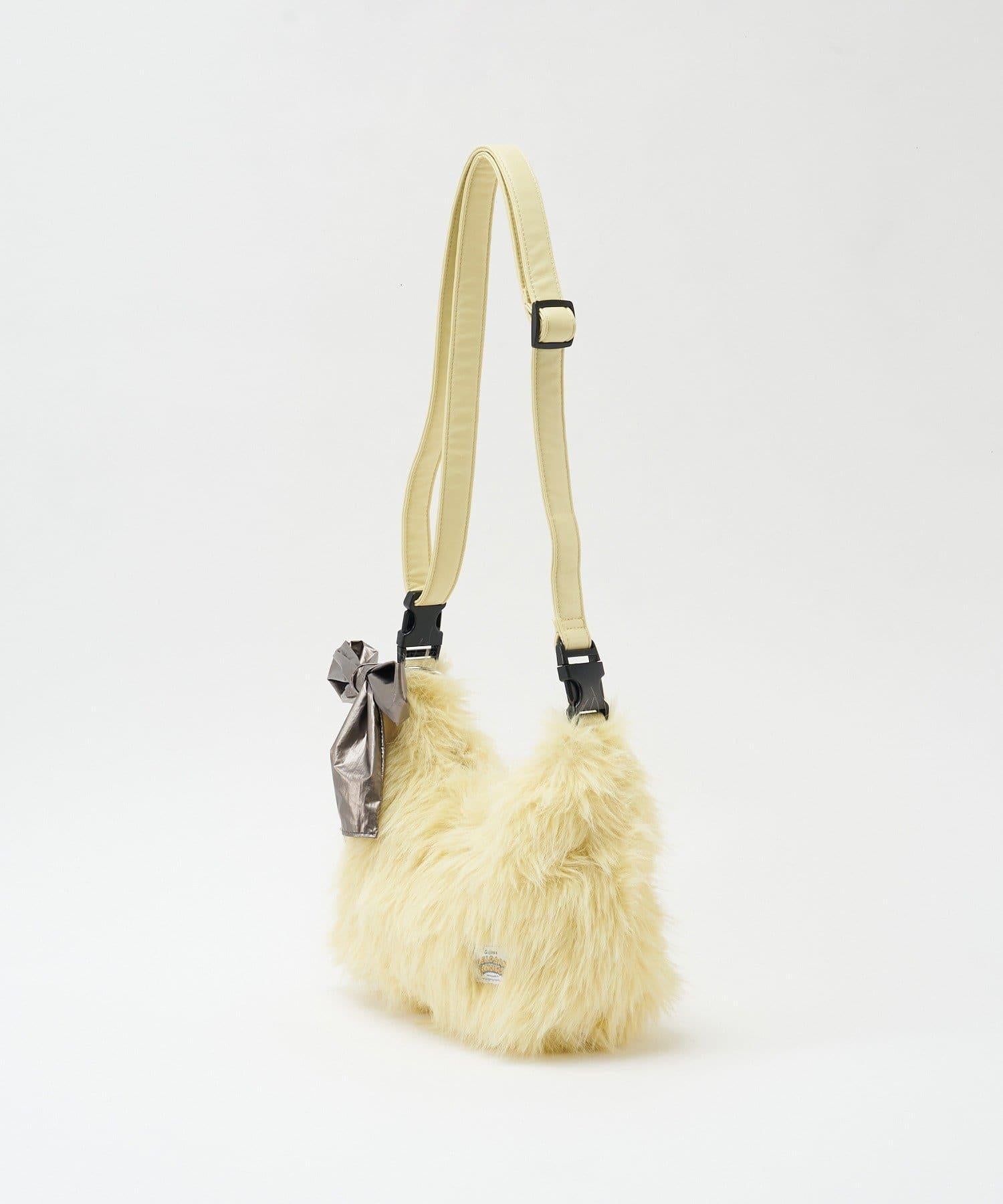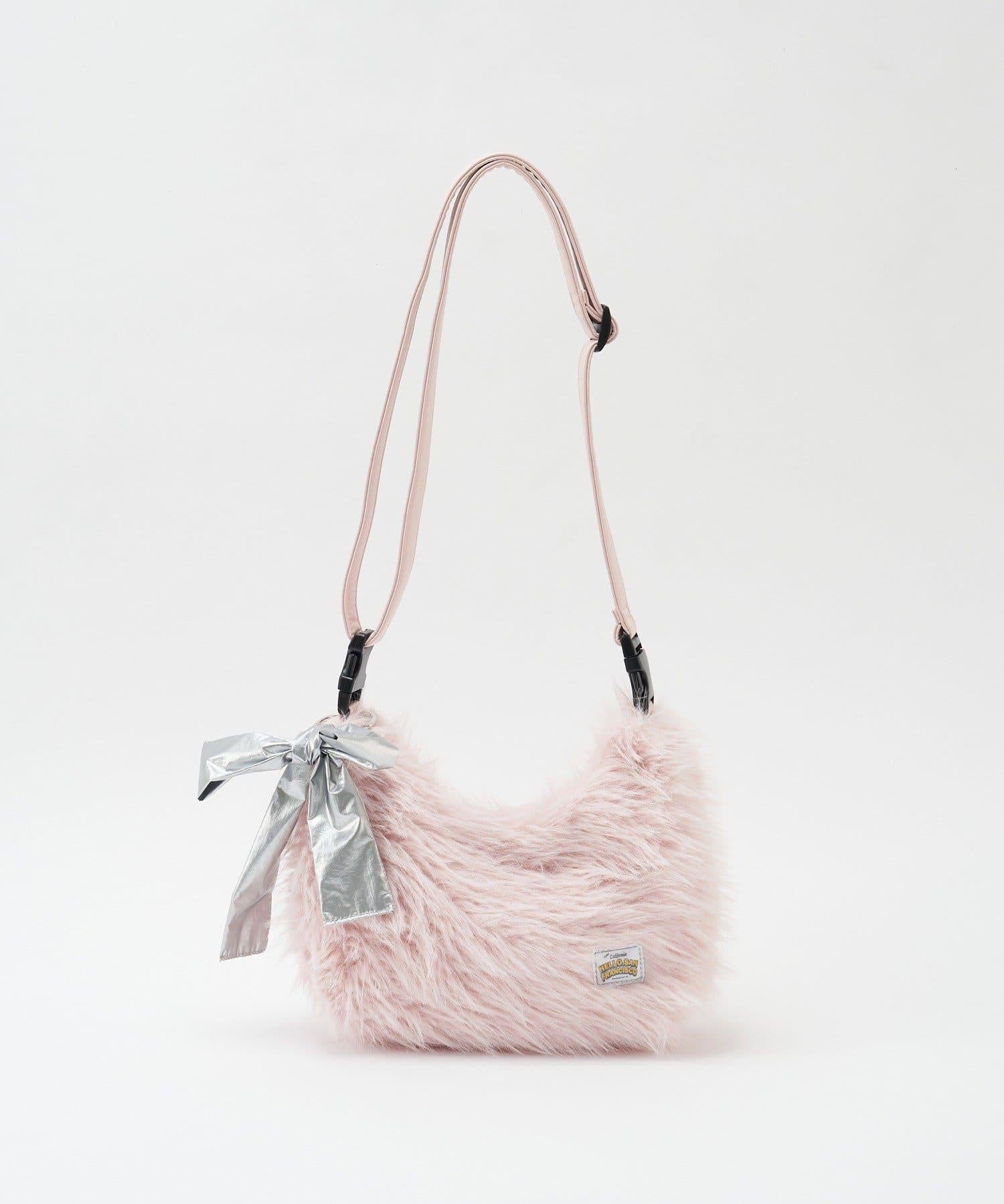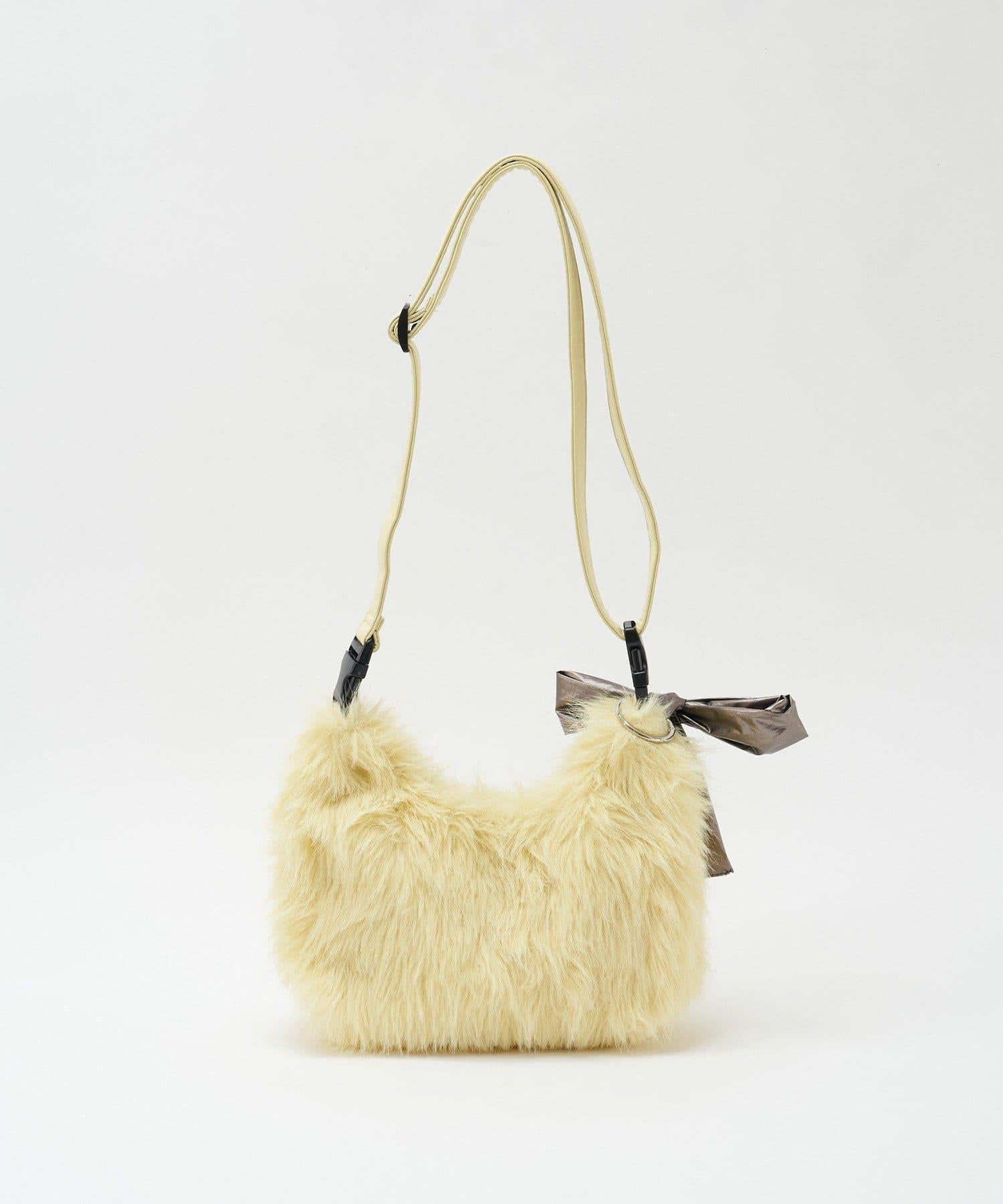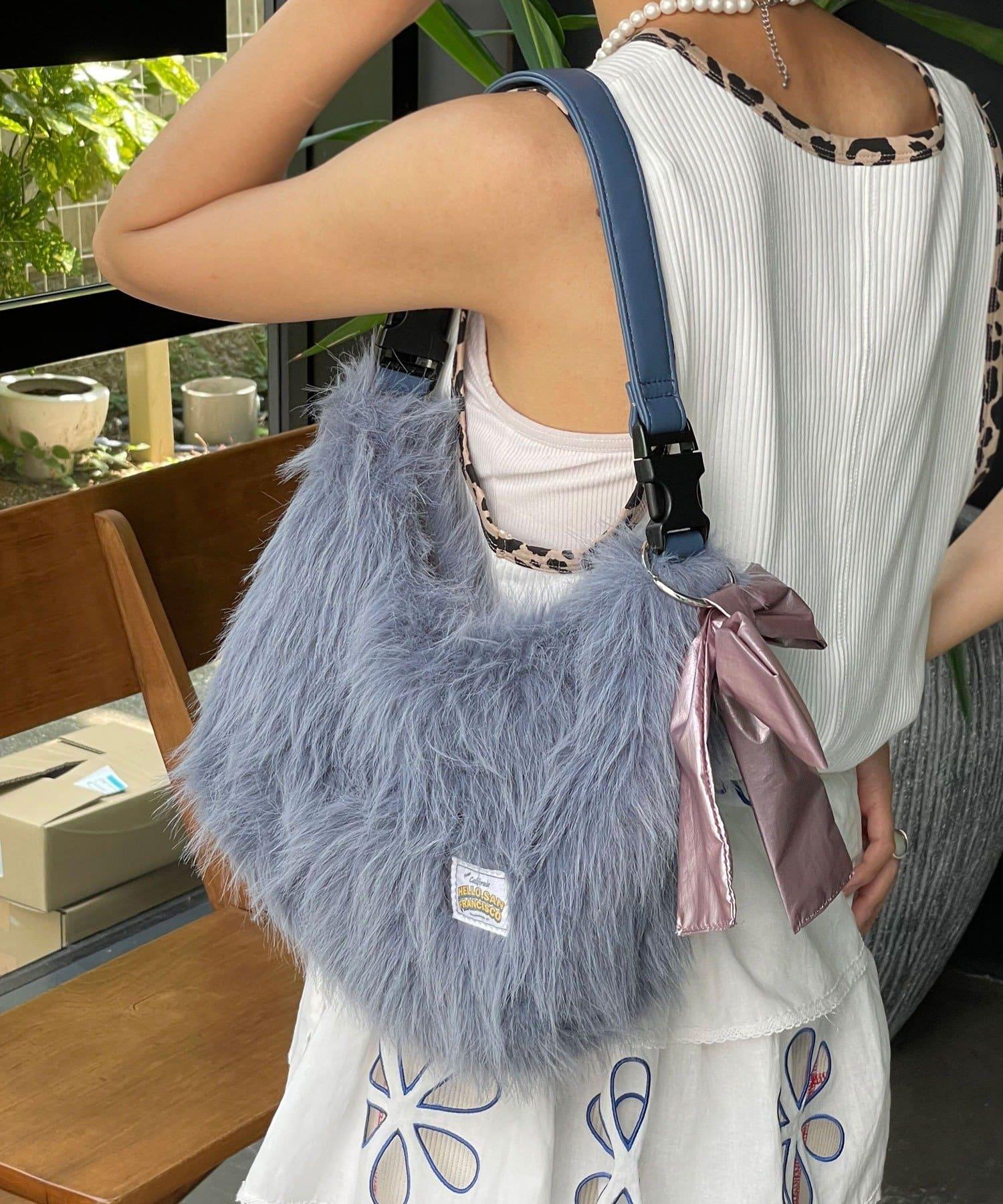 這是一款多向手袋,採用柔軟的皮草材質,飾有金屬絲帶吊飾。