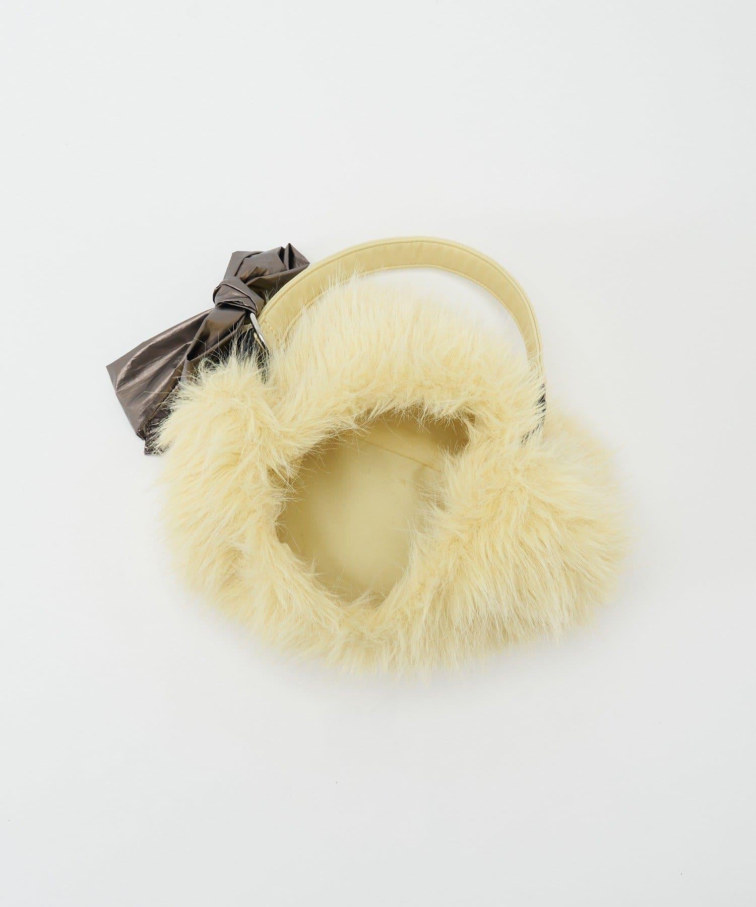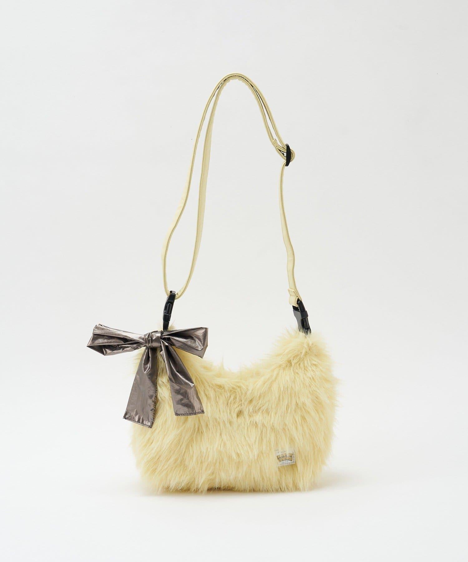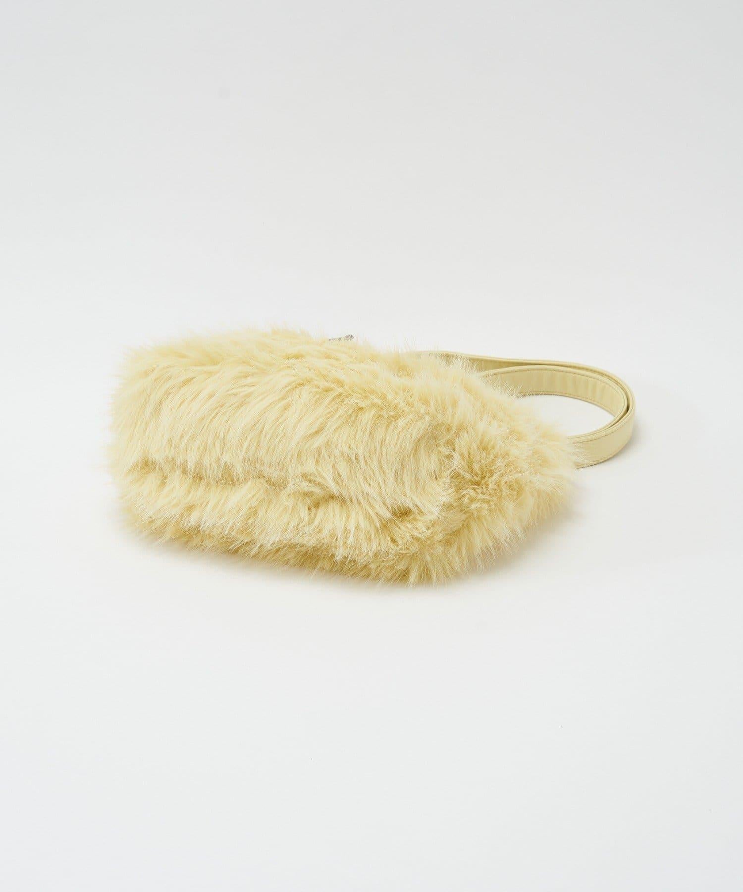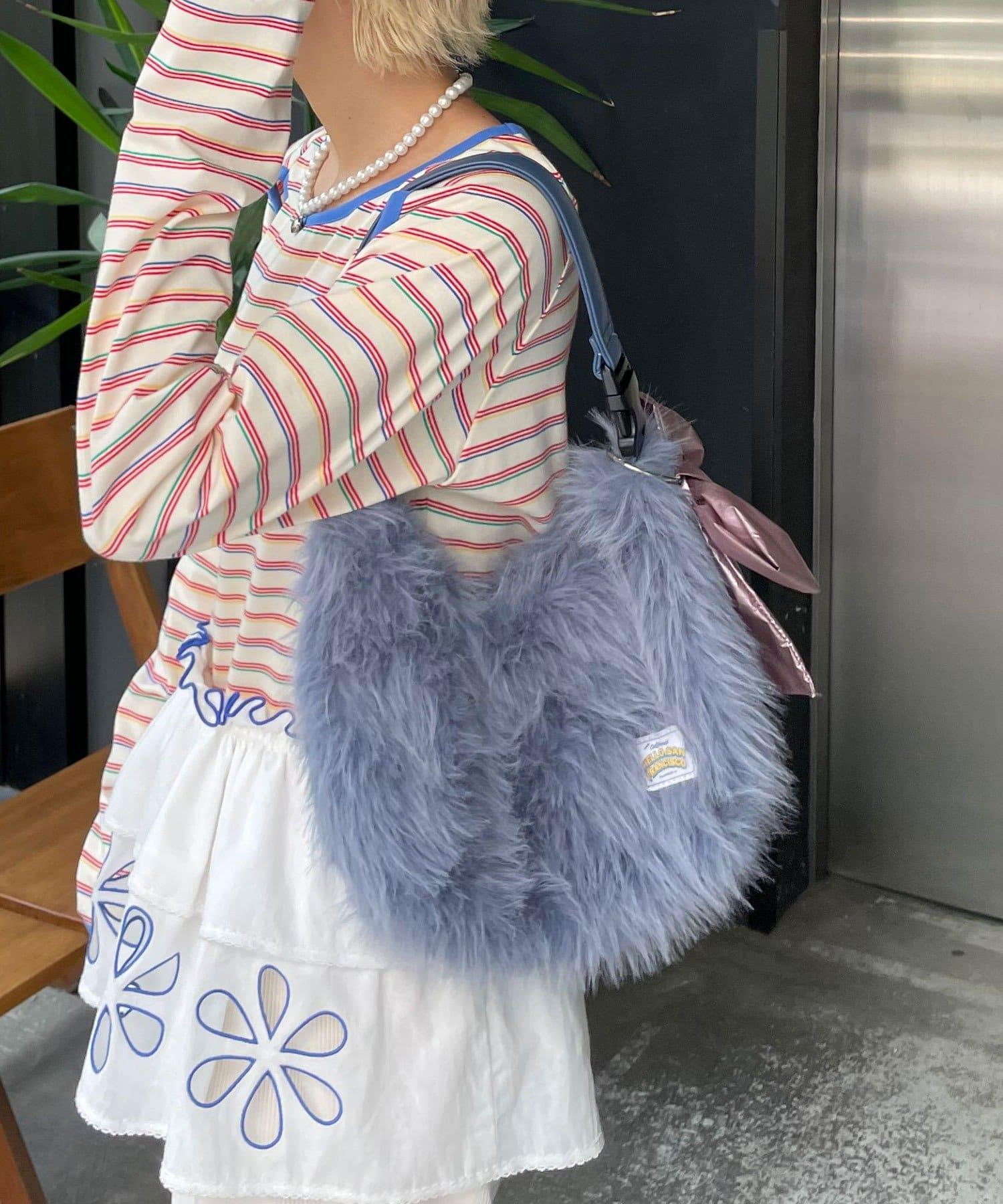 這是一款多向手袋,採用柔軟的皮草材質,飾有金屬絲帶吊飾。