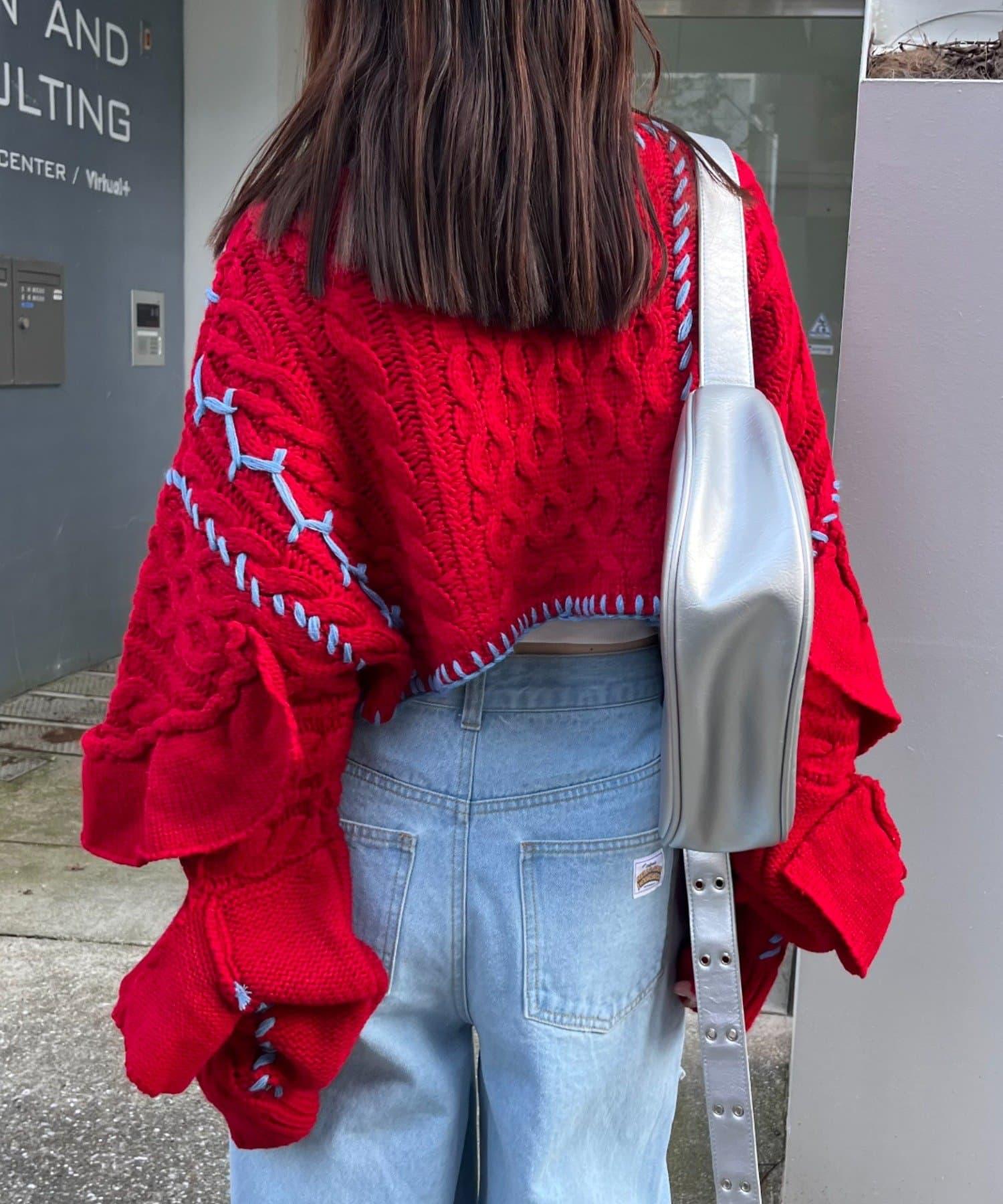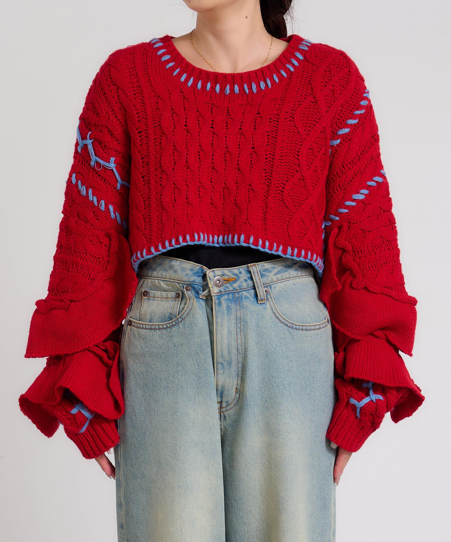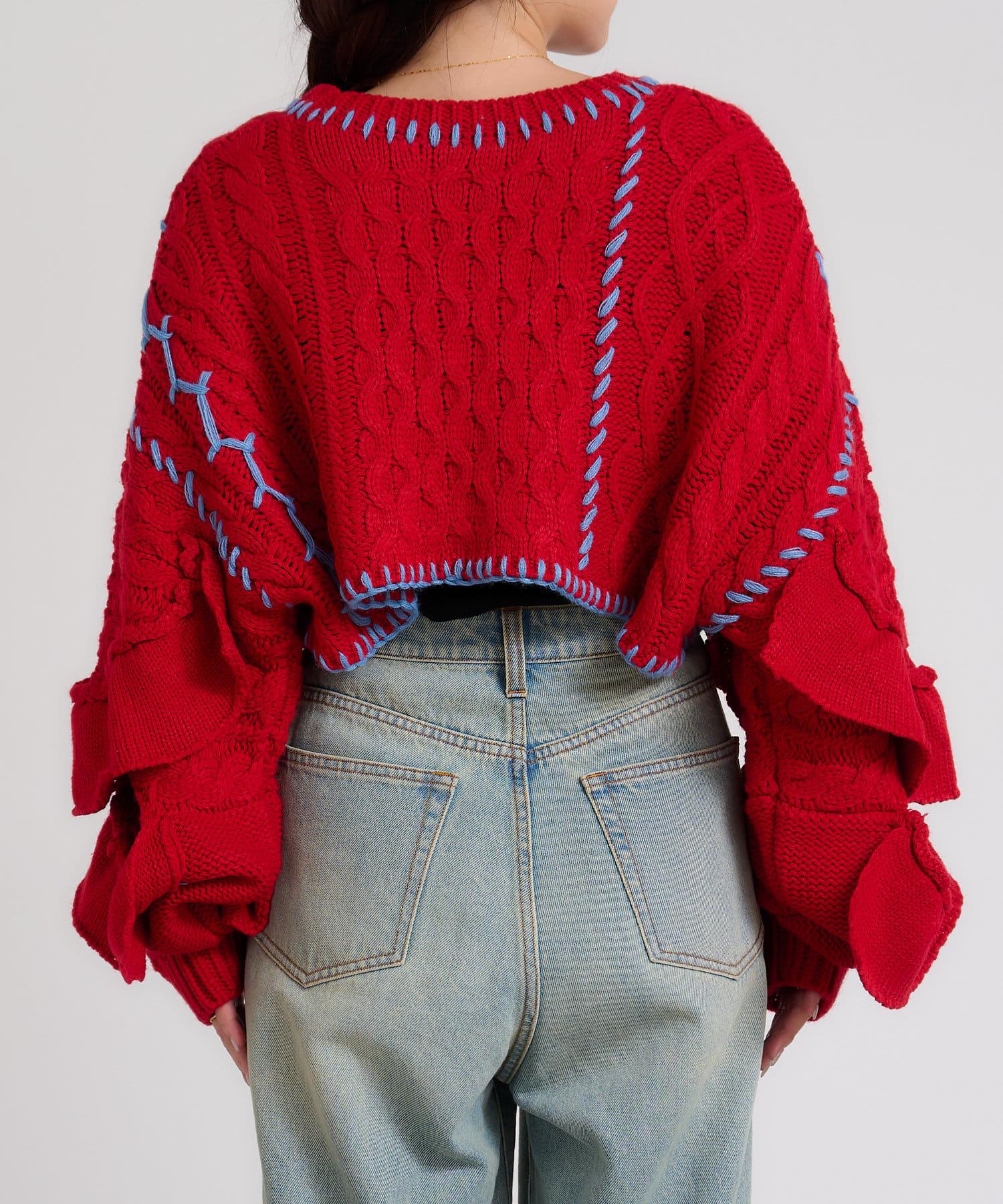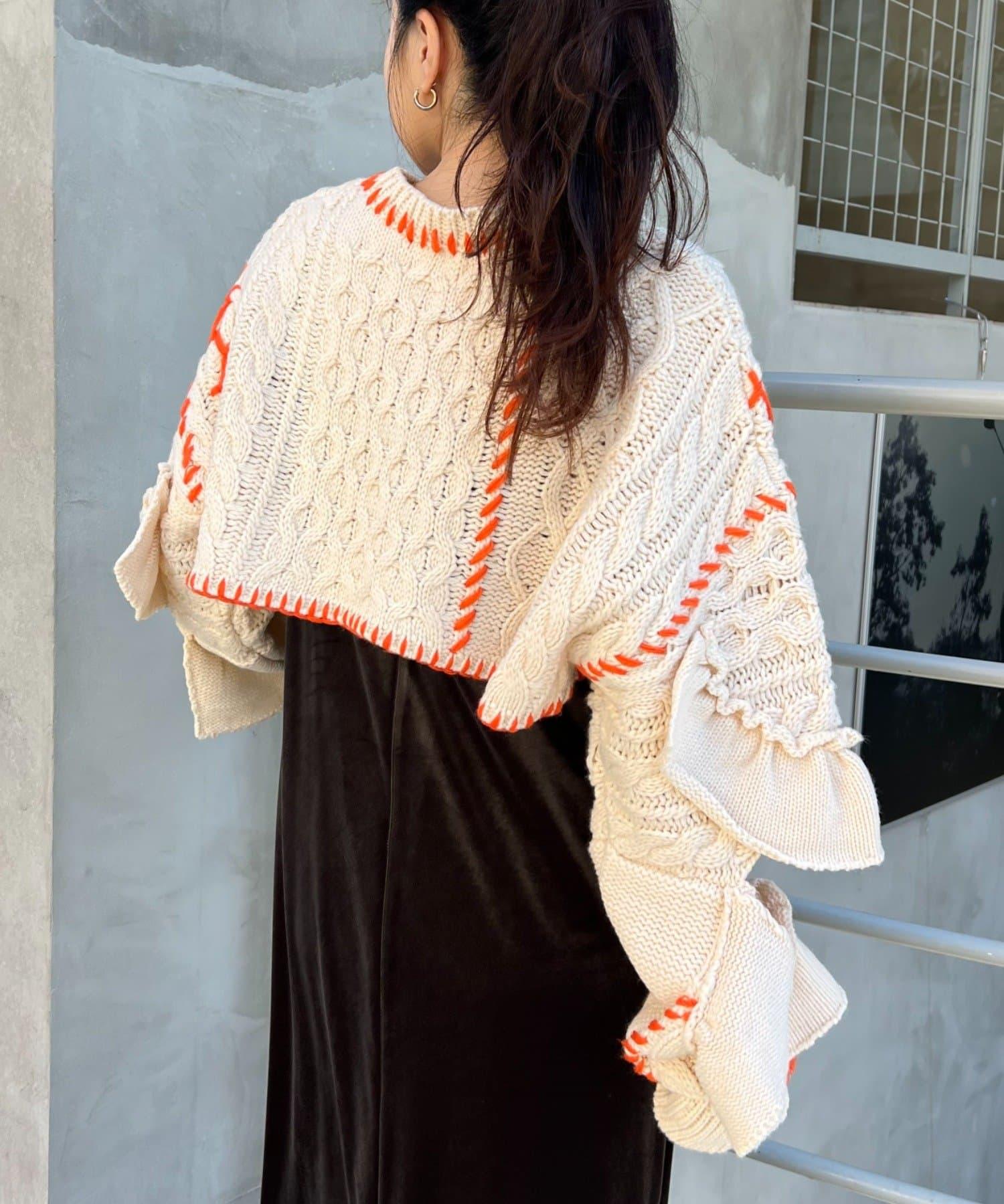 短款針織衫上的荷葉邊和手工縫線是一款時尚單品。