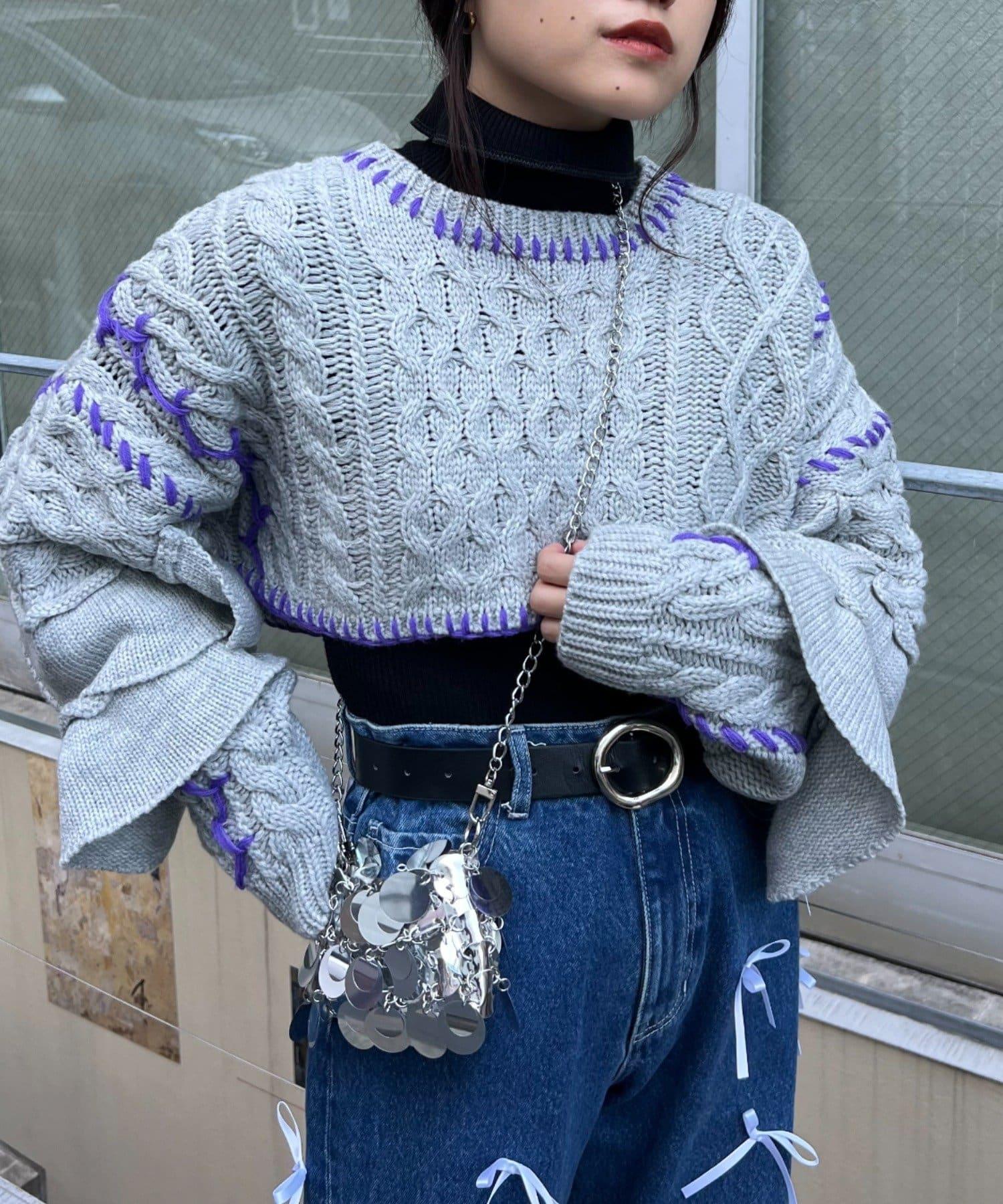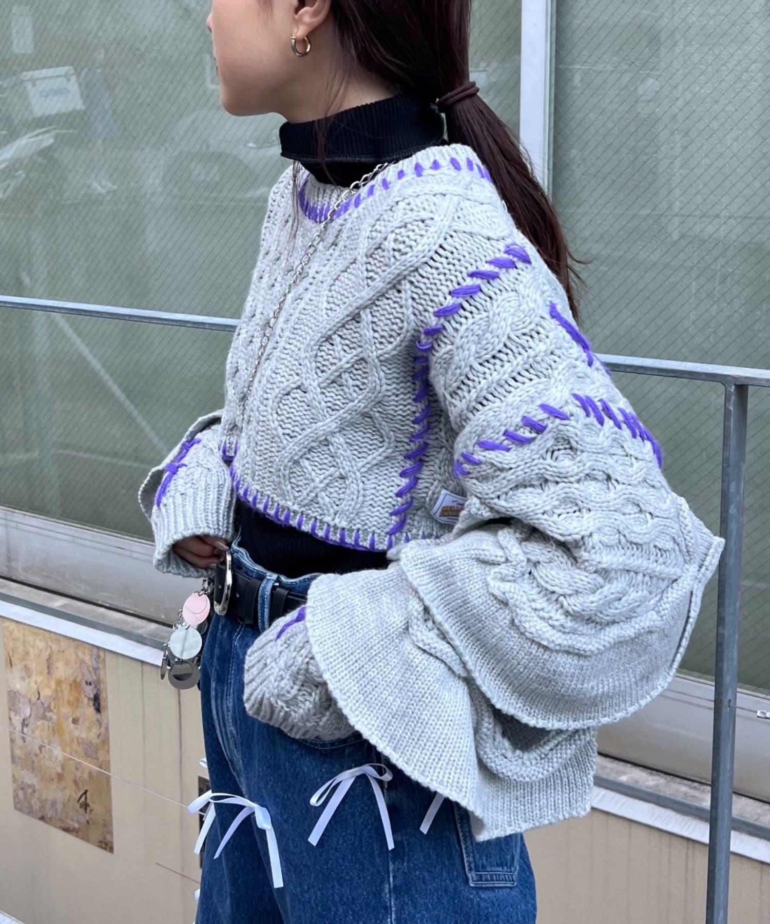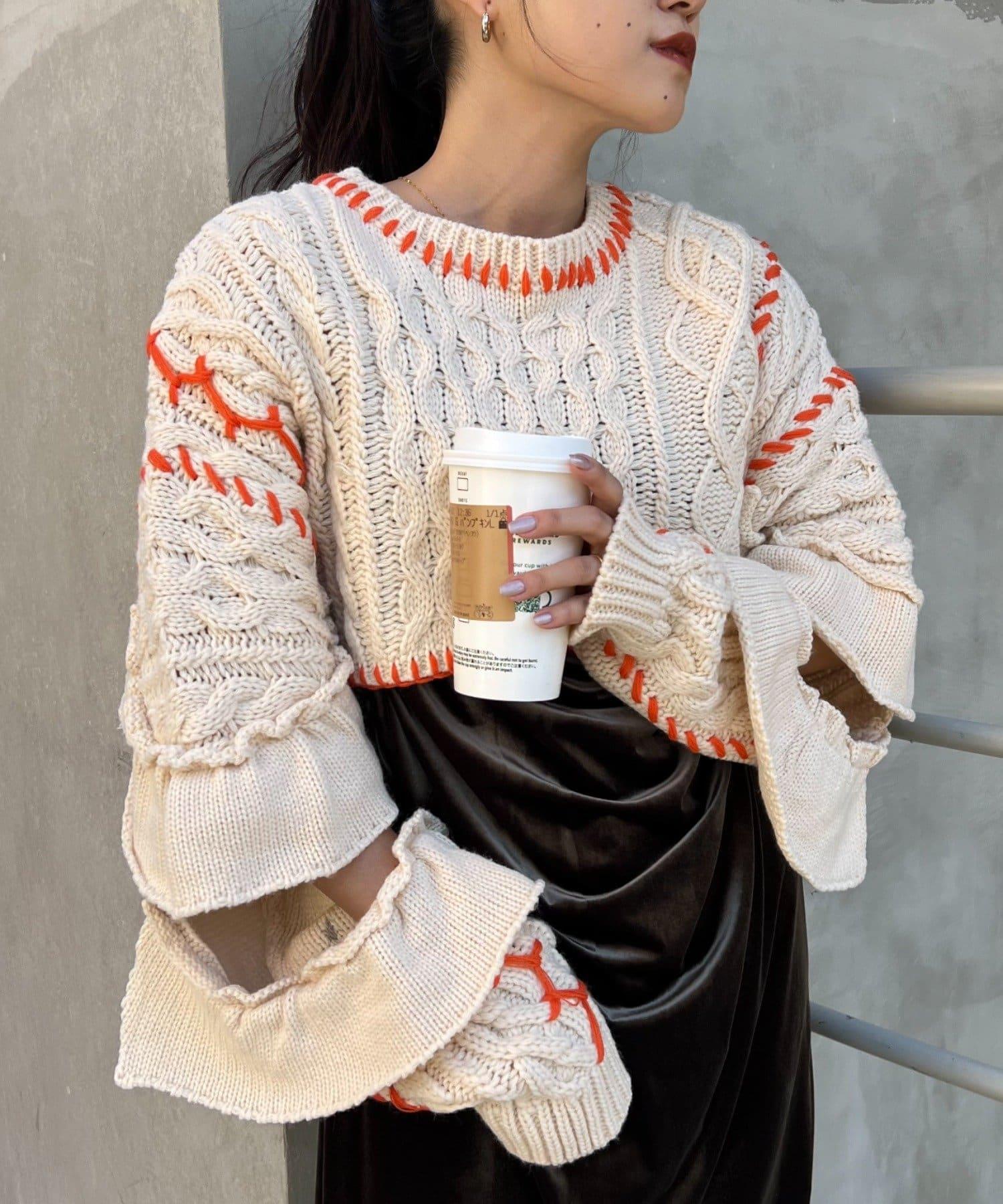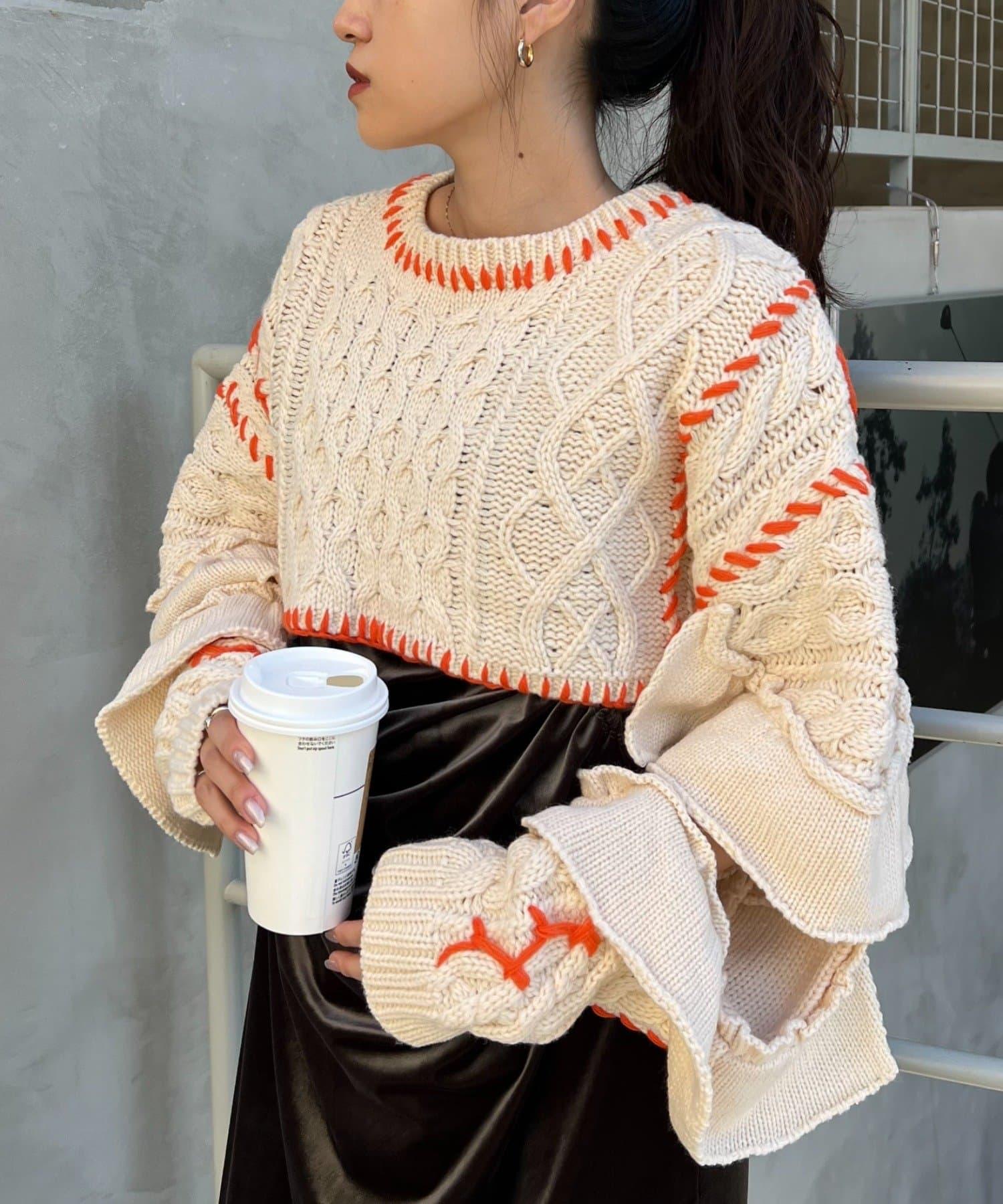 短款針織衫上的荷葉邊和手工縫線是一款時尚單品。