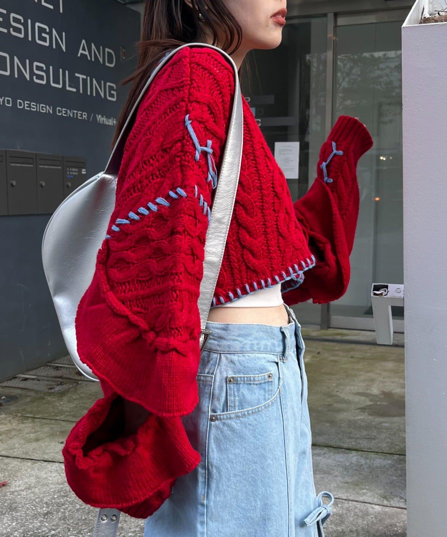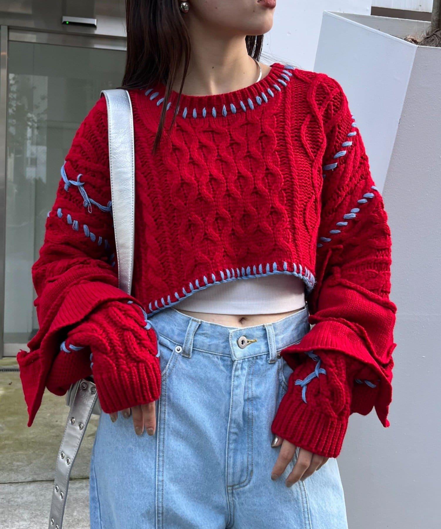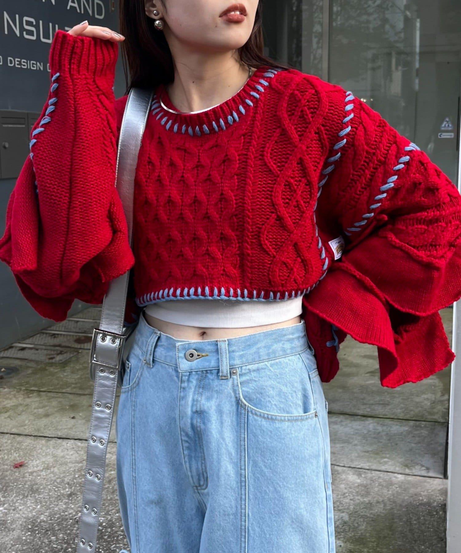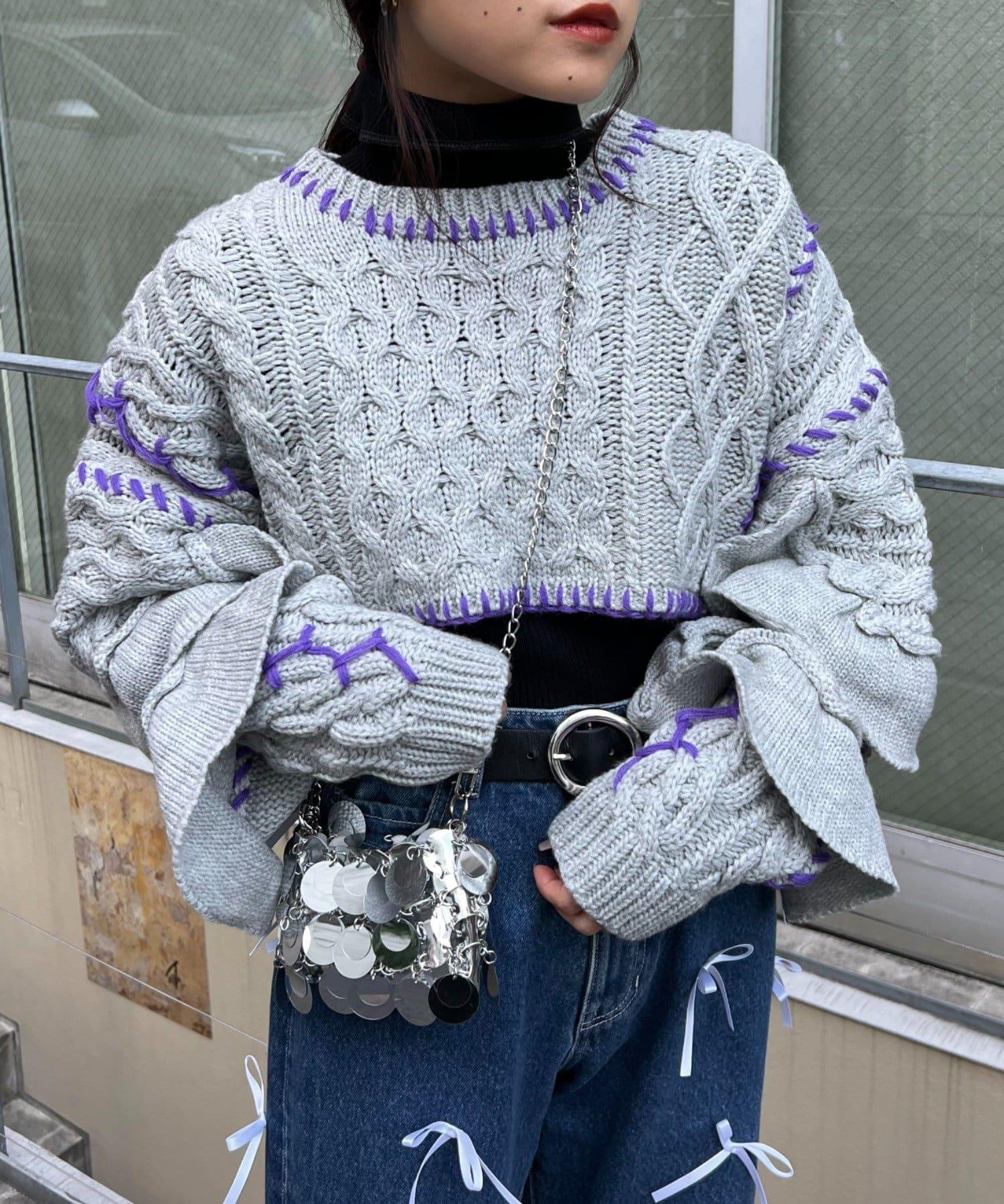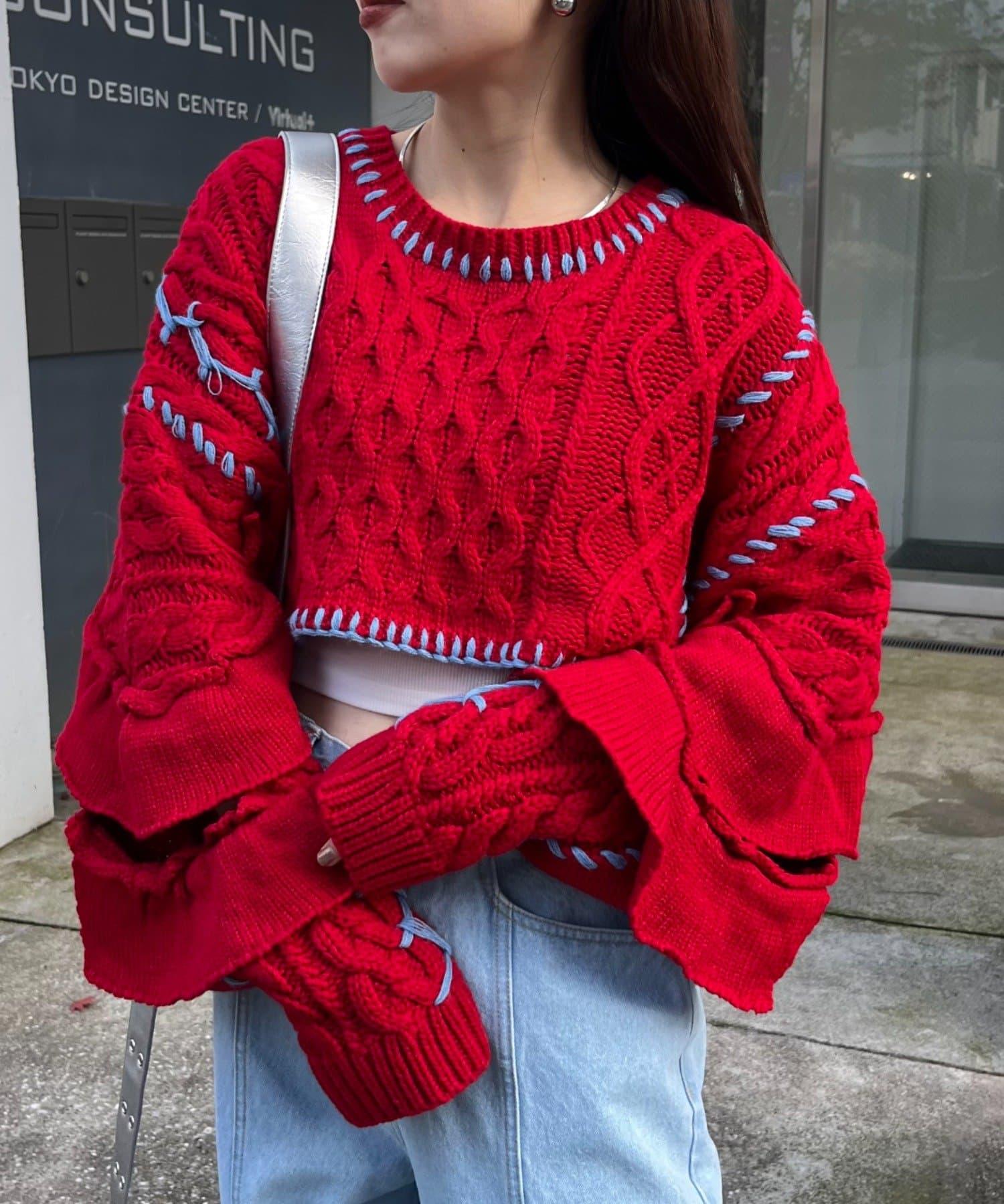 短款針織衫上的荷葉邊和手工縫線是一款時尚單品。
