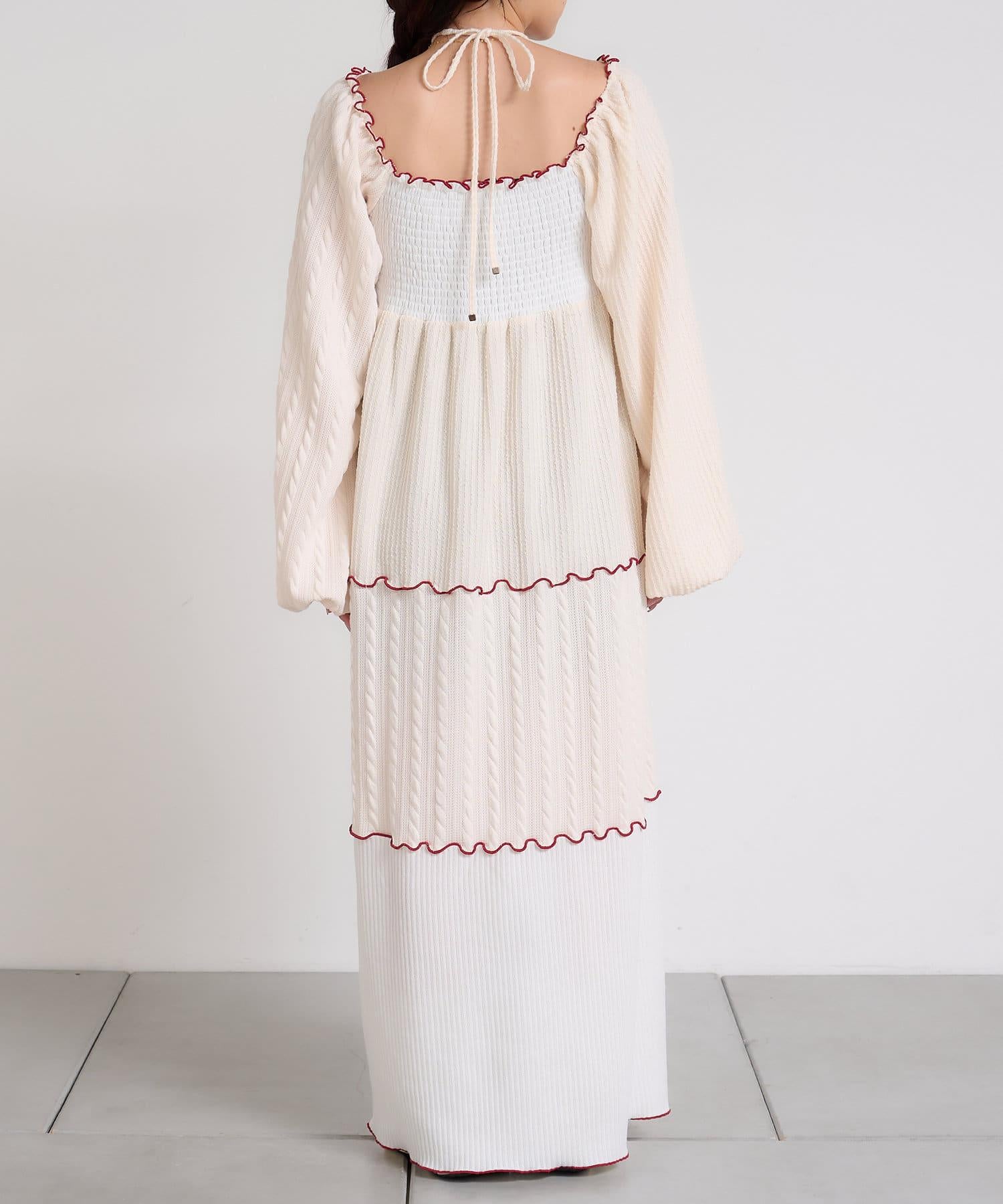 引人注目的連身裙,領口採用與色彩相協調的圓潤時尚的露肩設計。