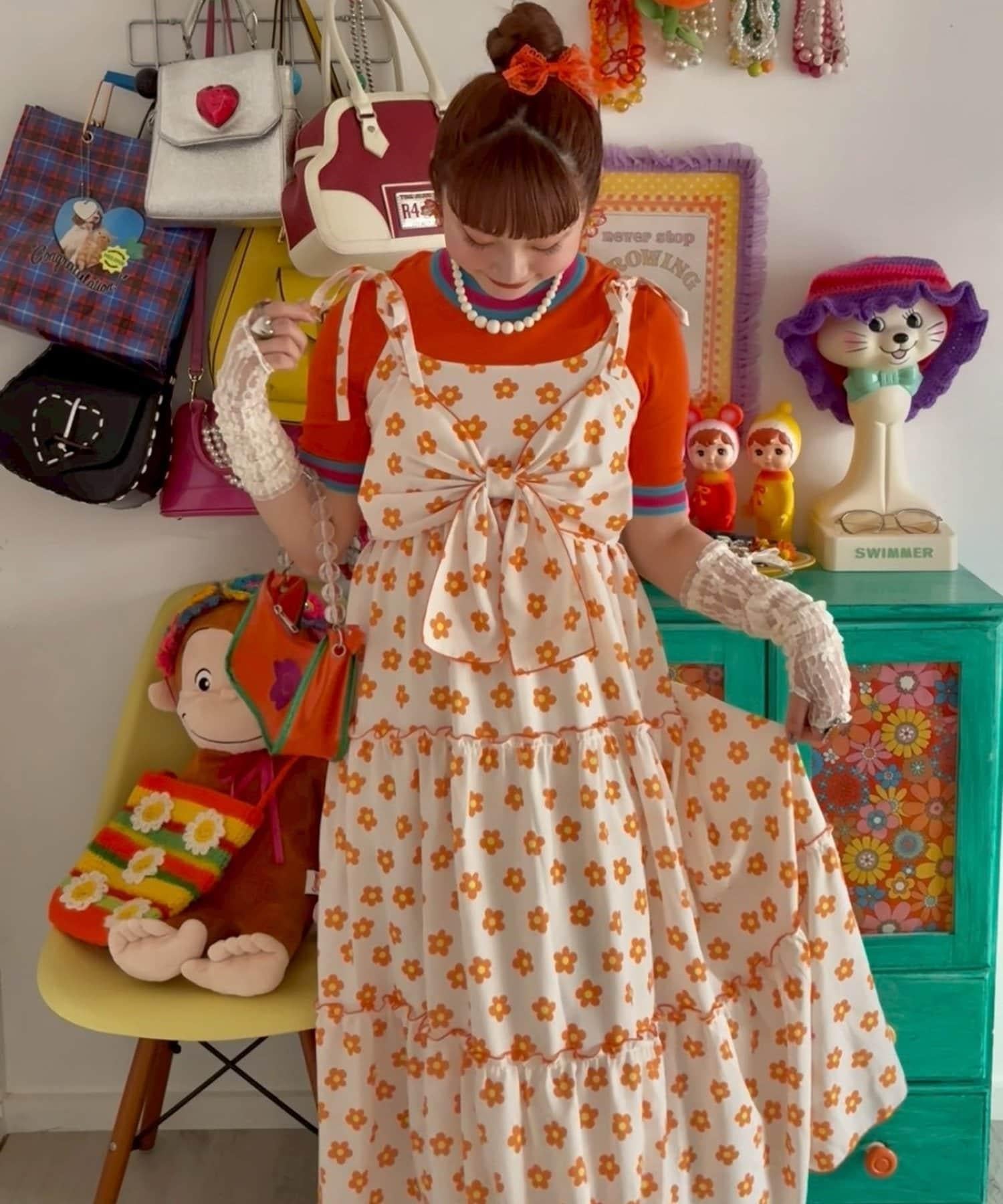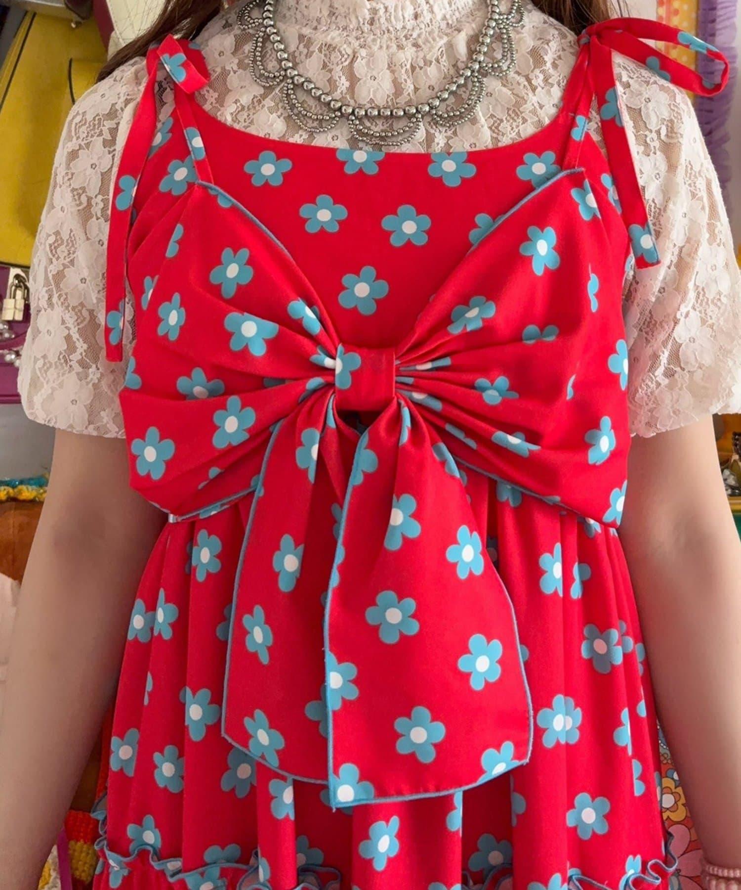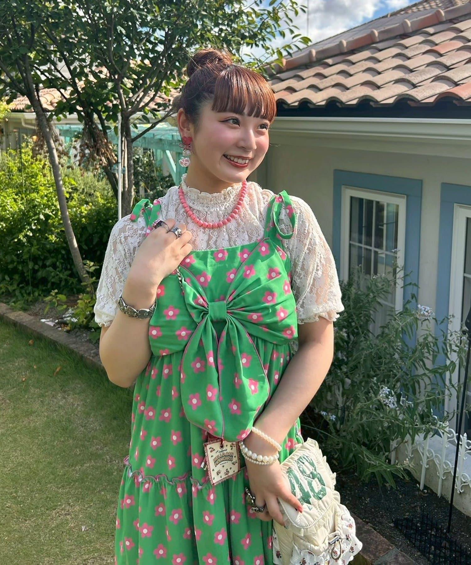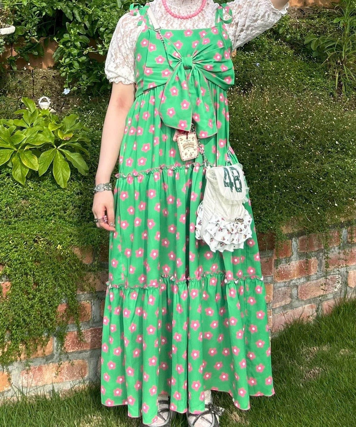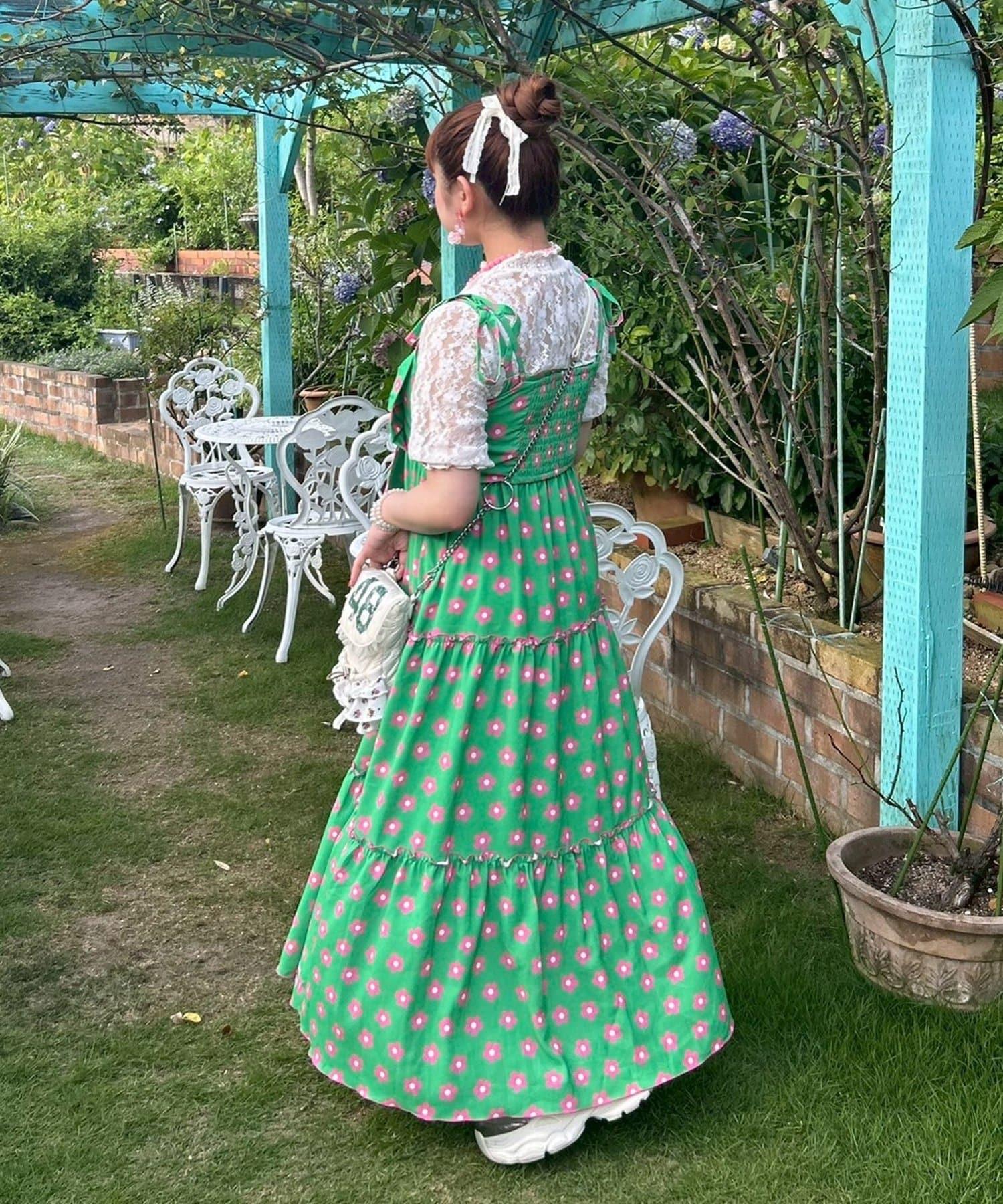 復古流行的花朵圖案,胸前的大絲帶是一大亮點!