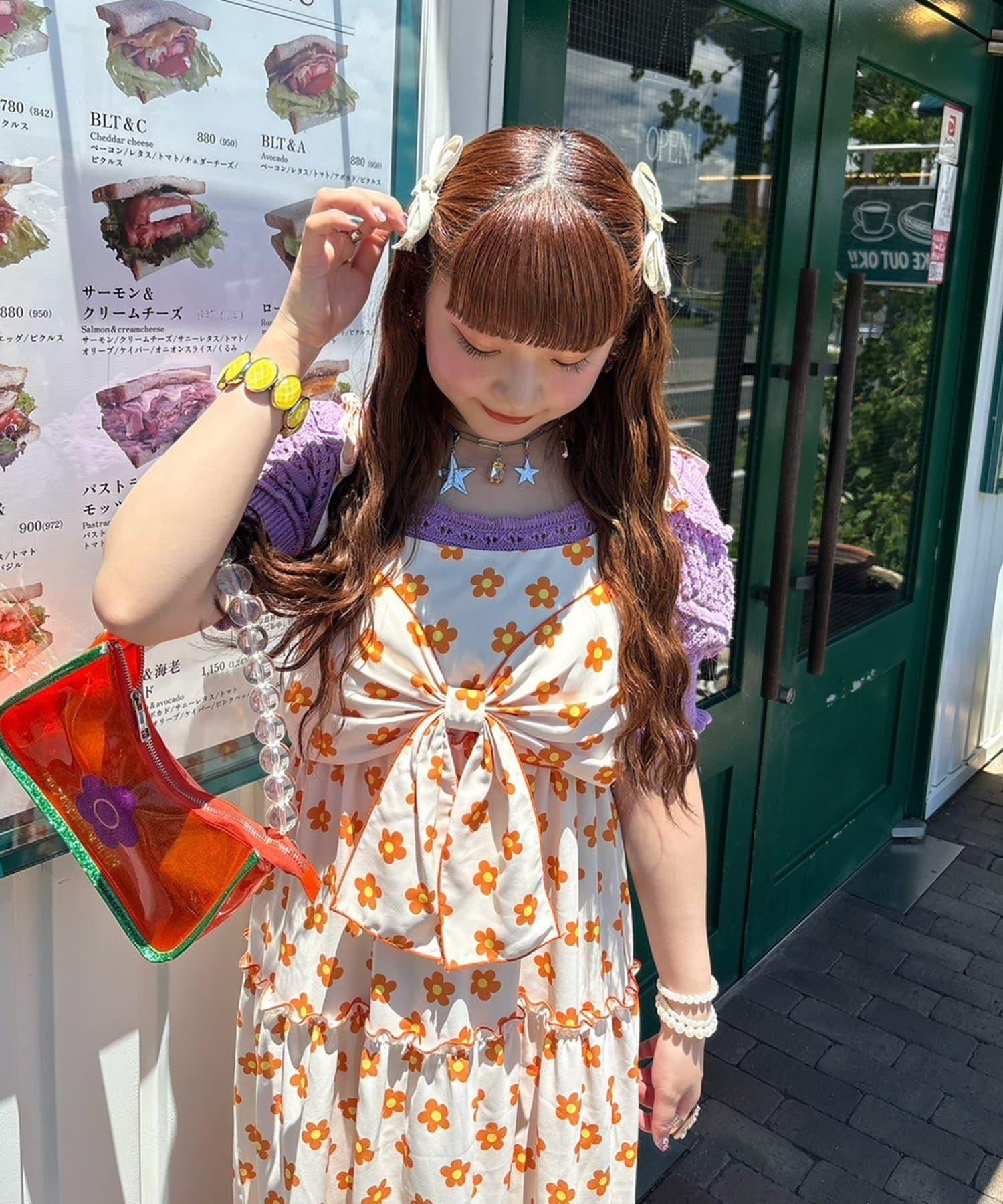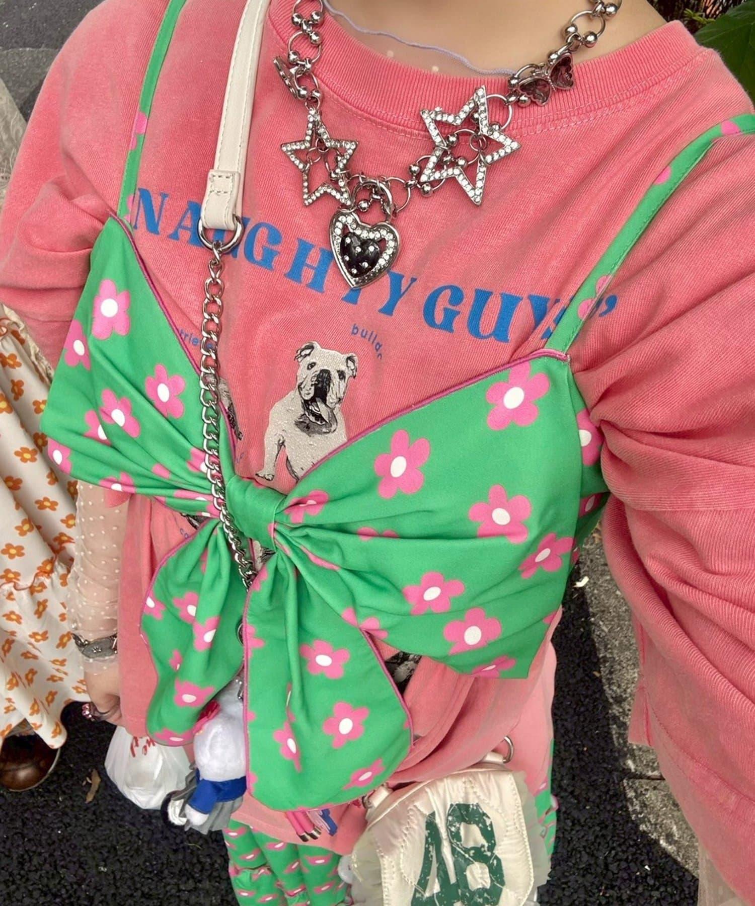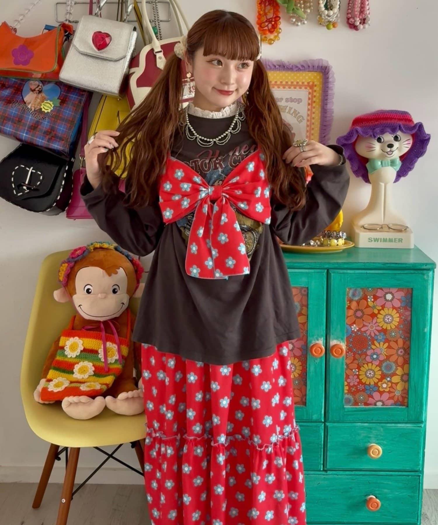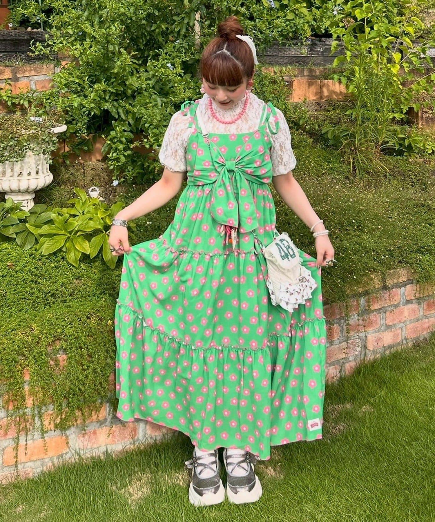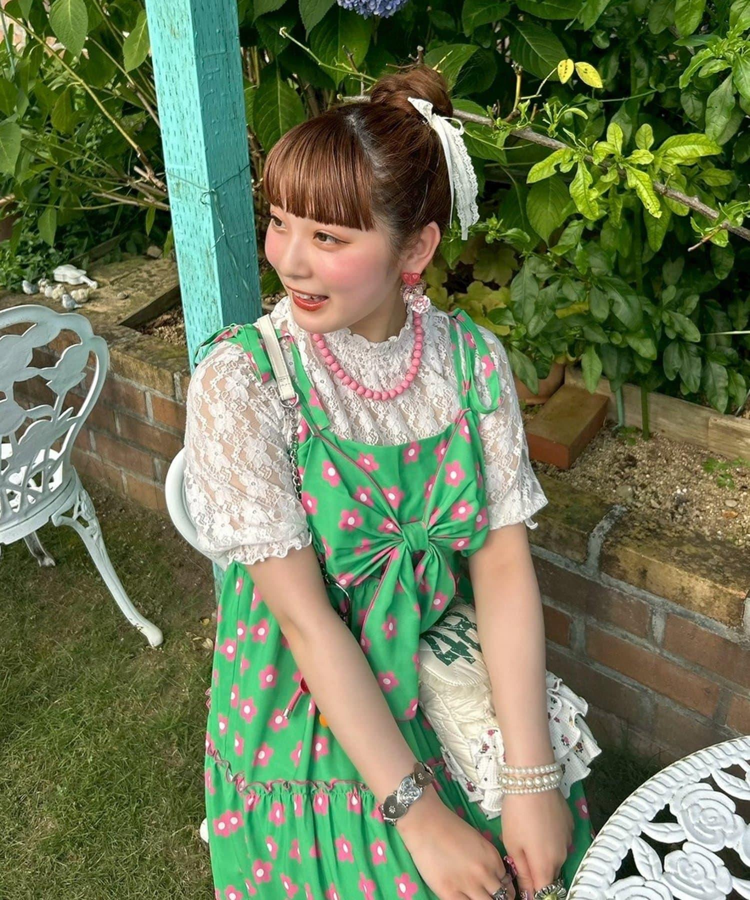 復古流行的花朵圖案,胸前的大絲帶是一大亮點!
