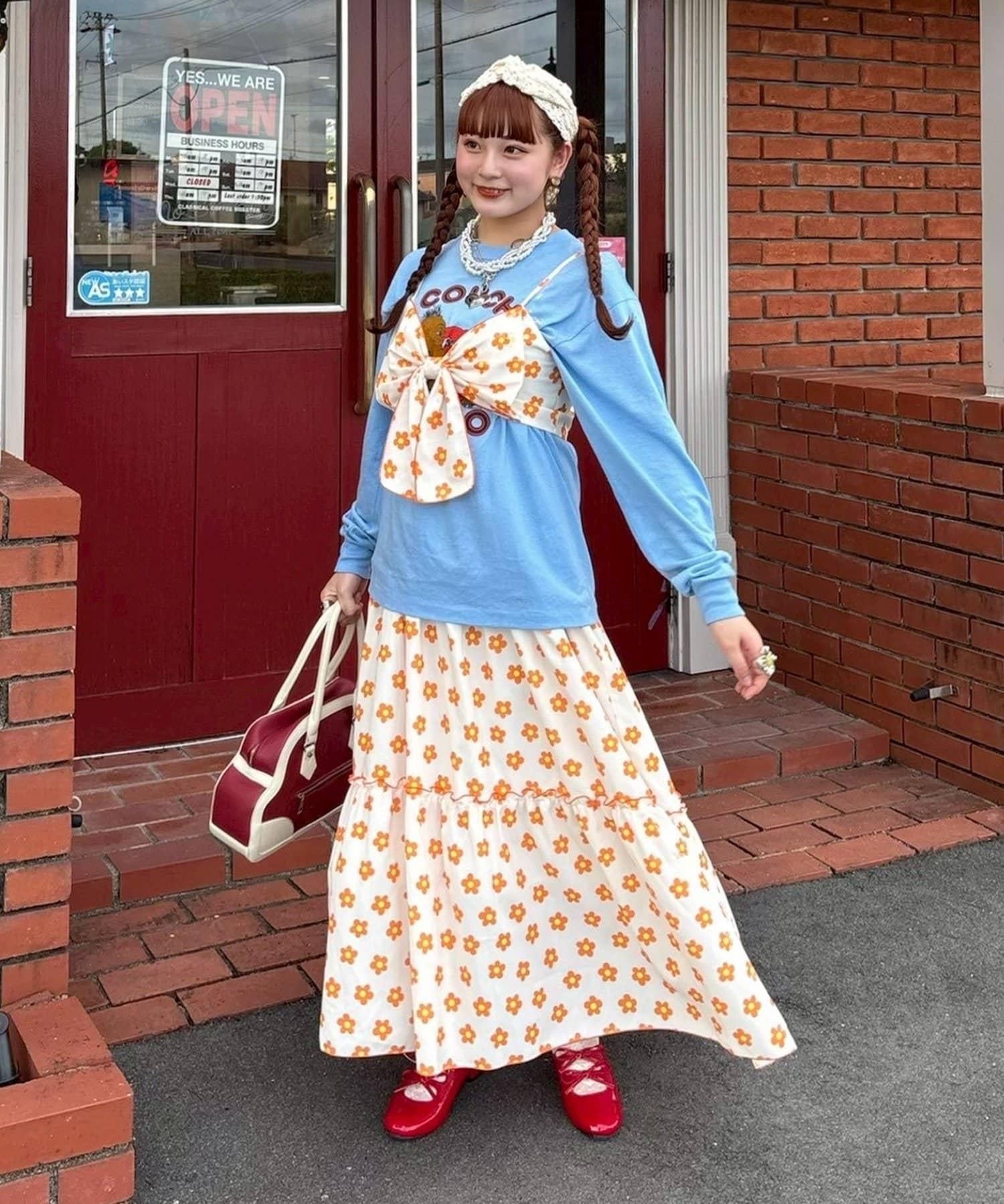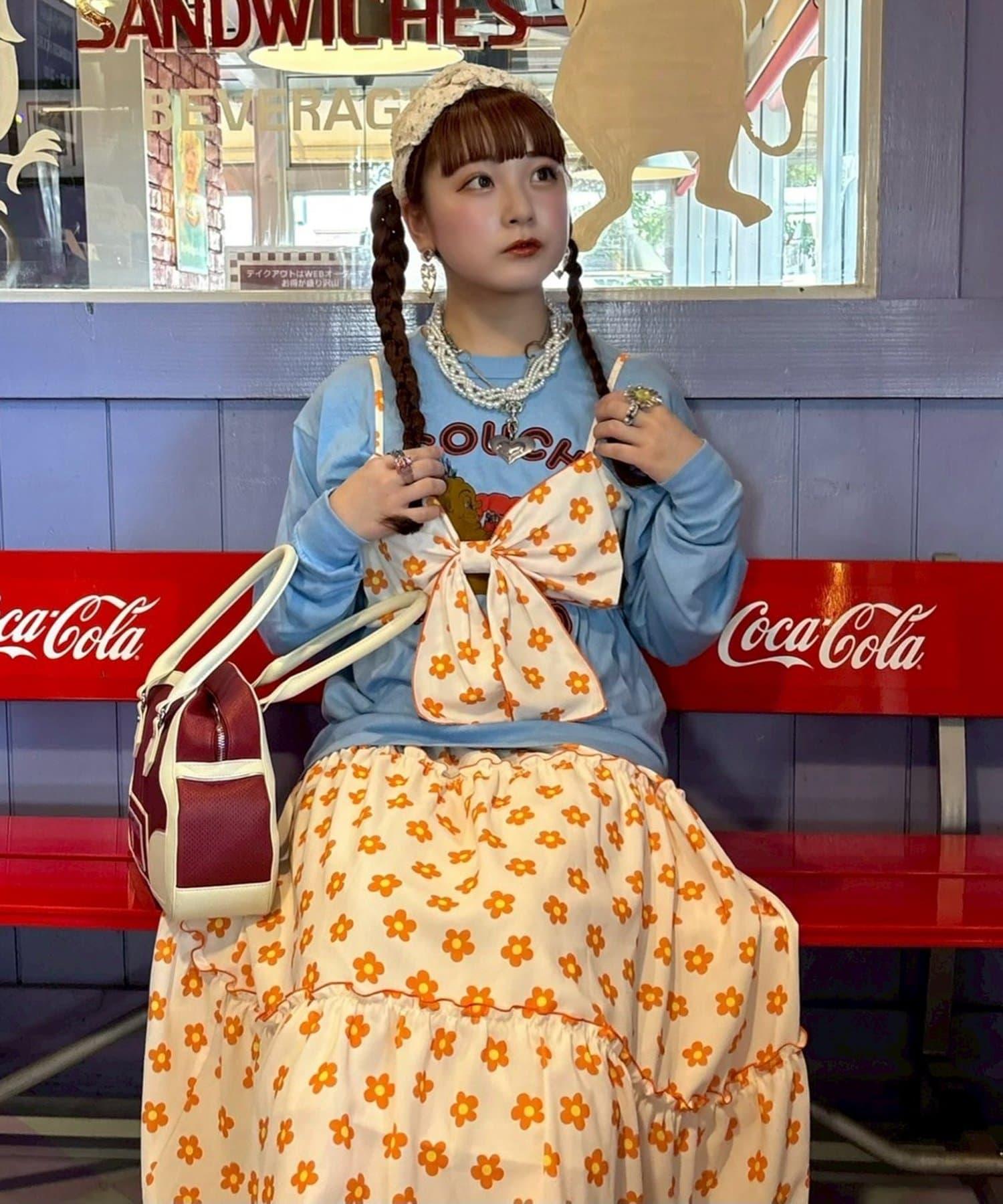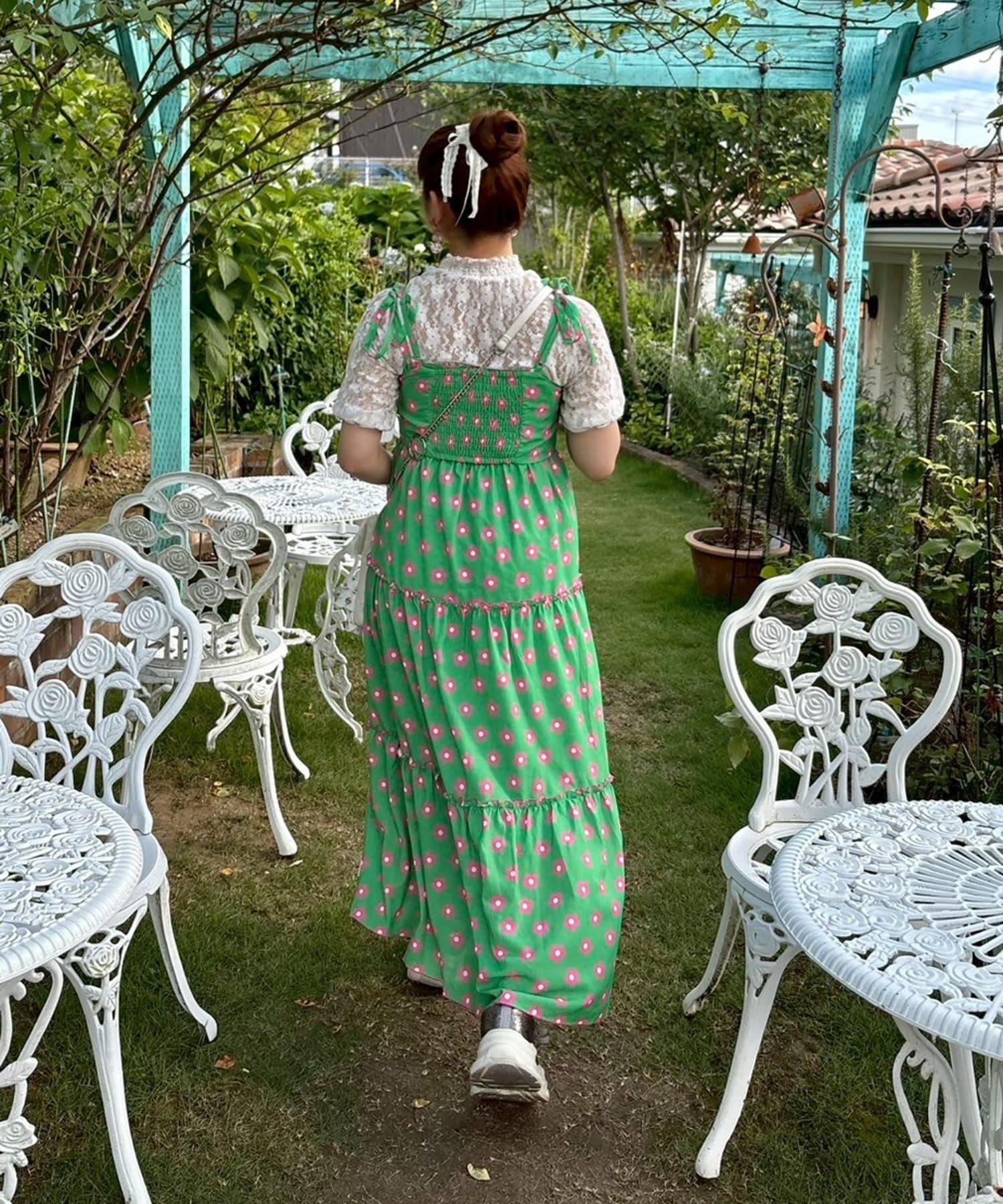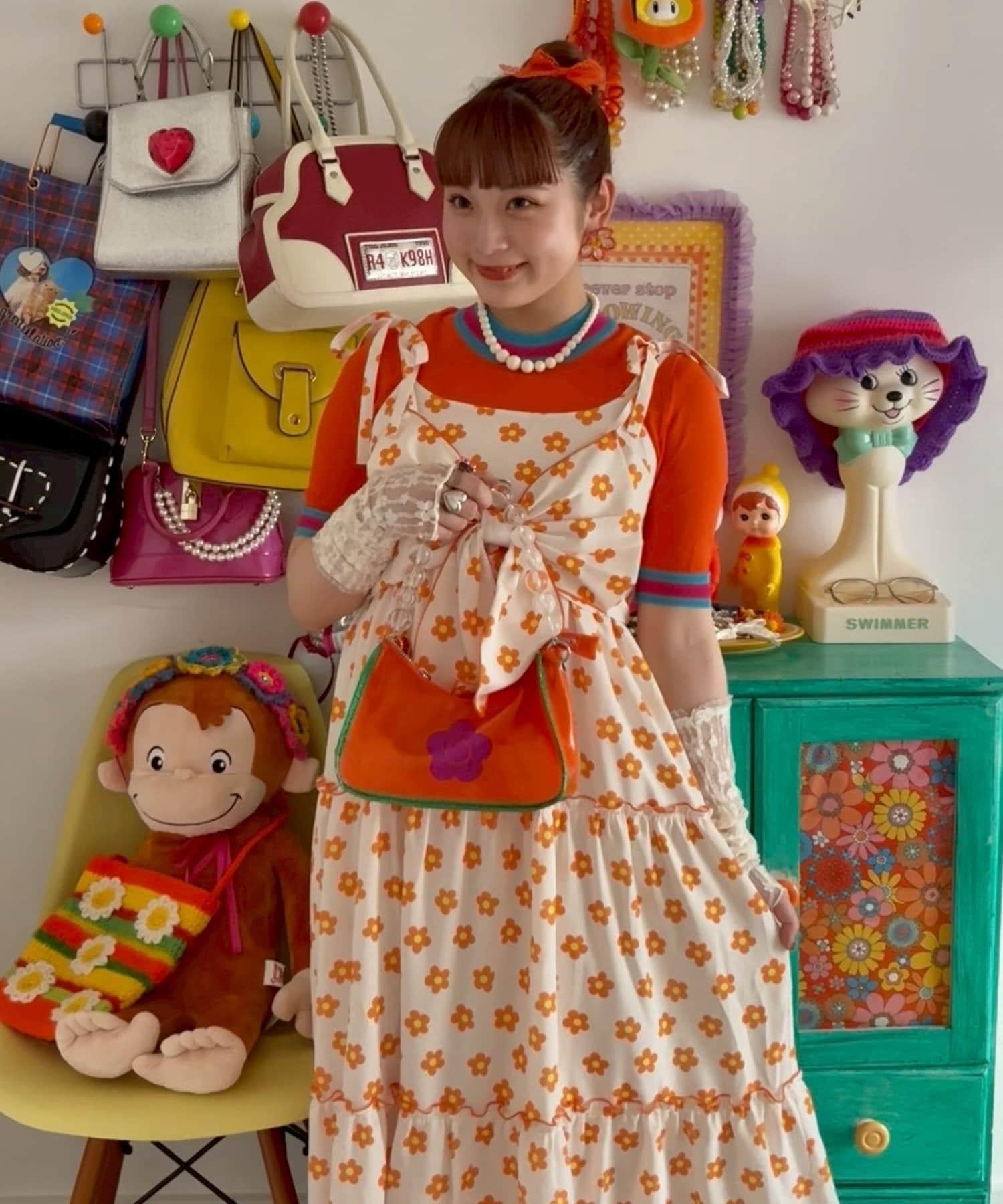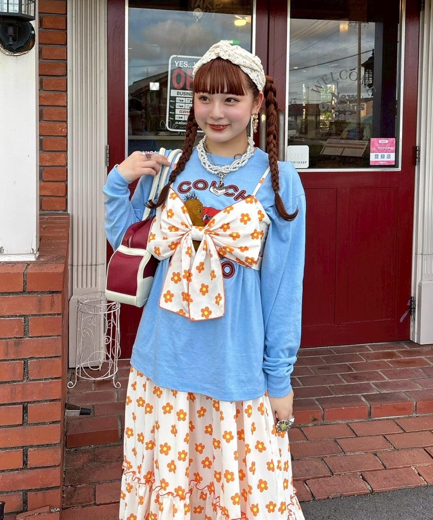 復古流行的花朵圖案,胸前的大絲帶是一大亮點!