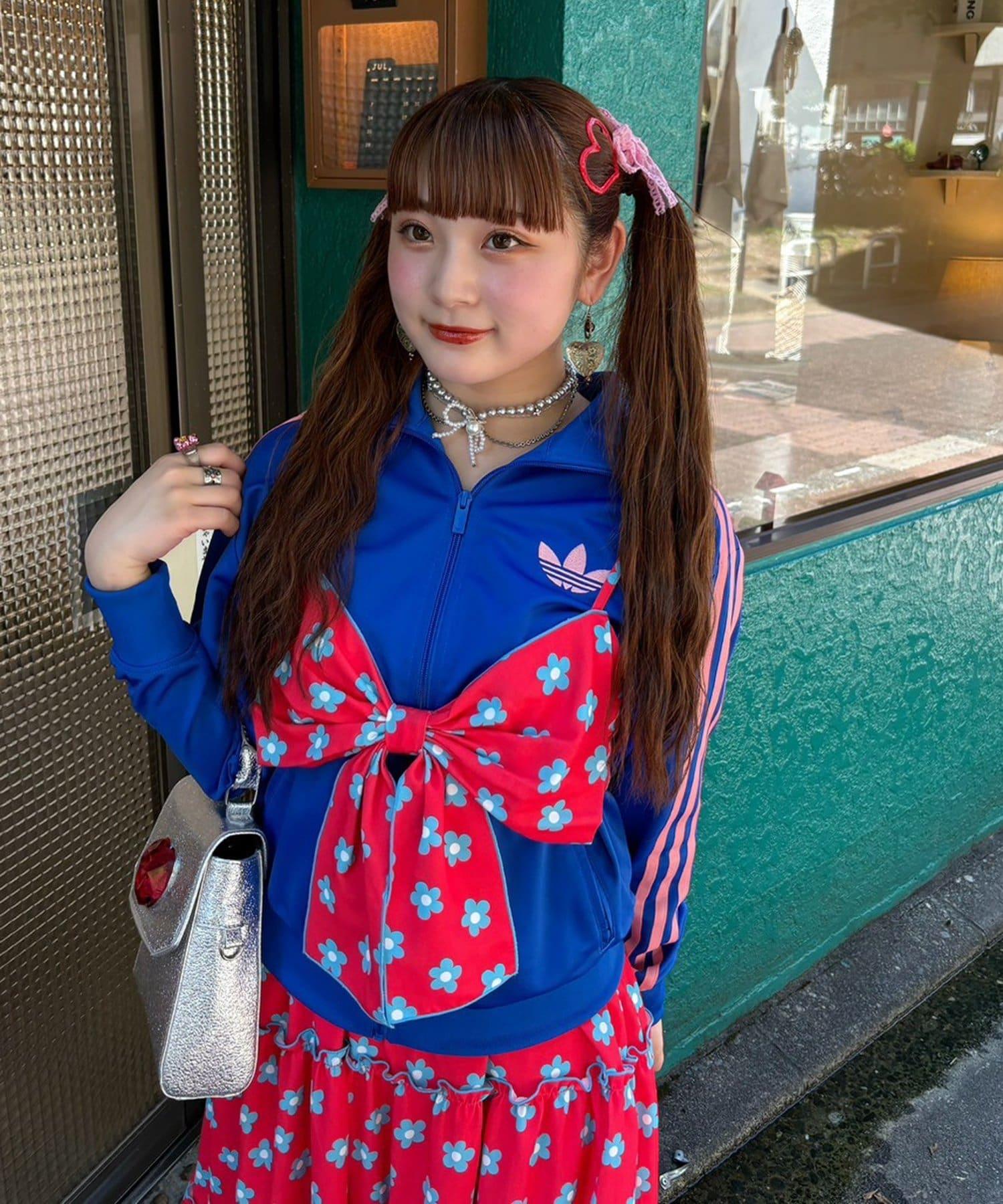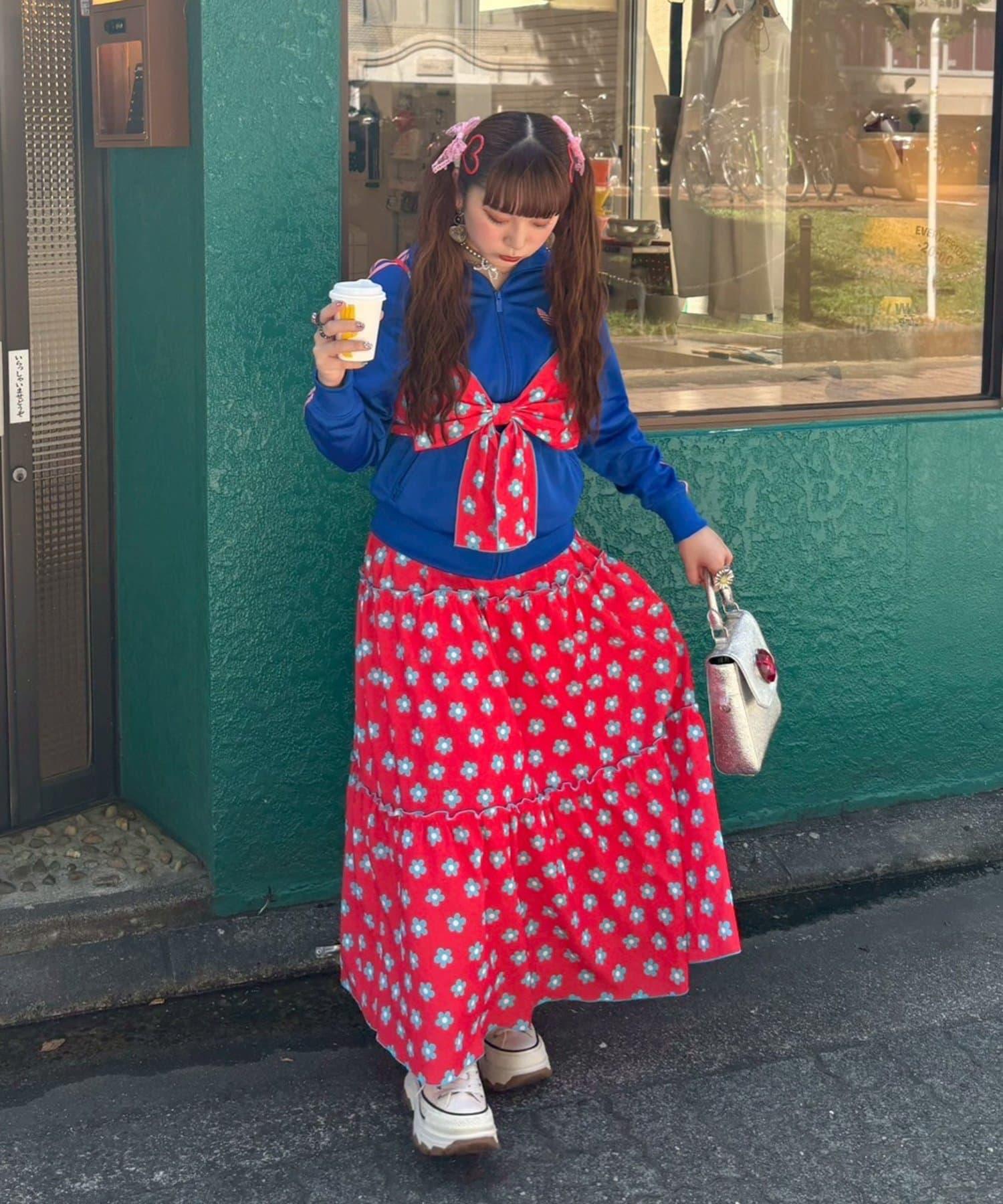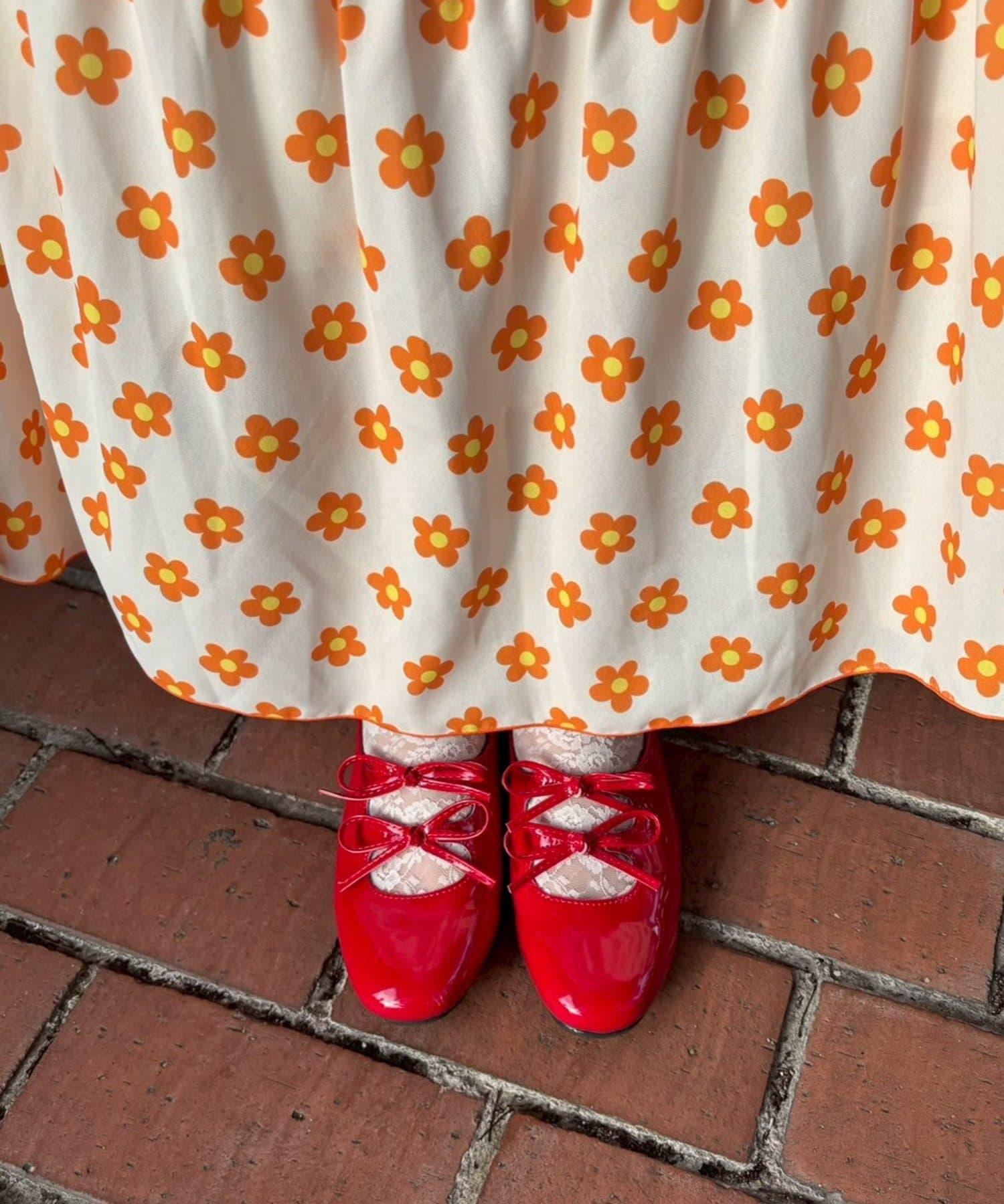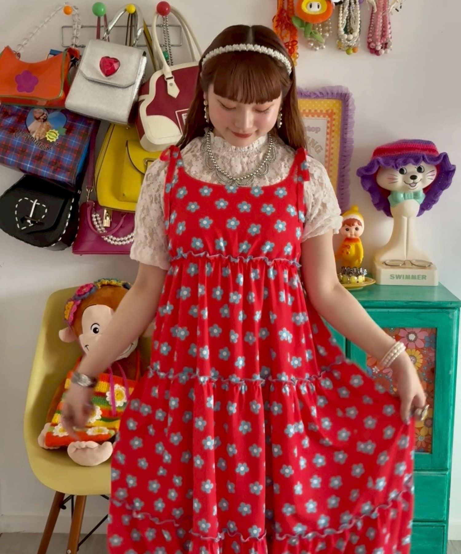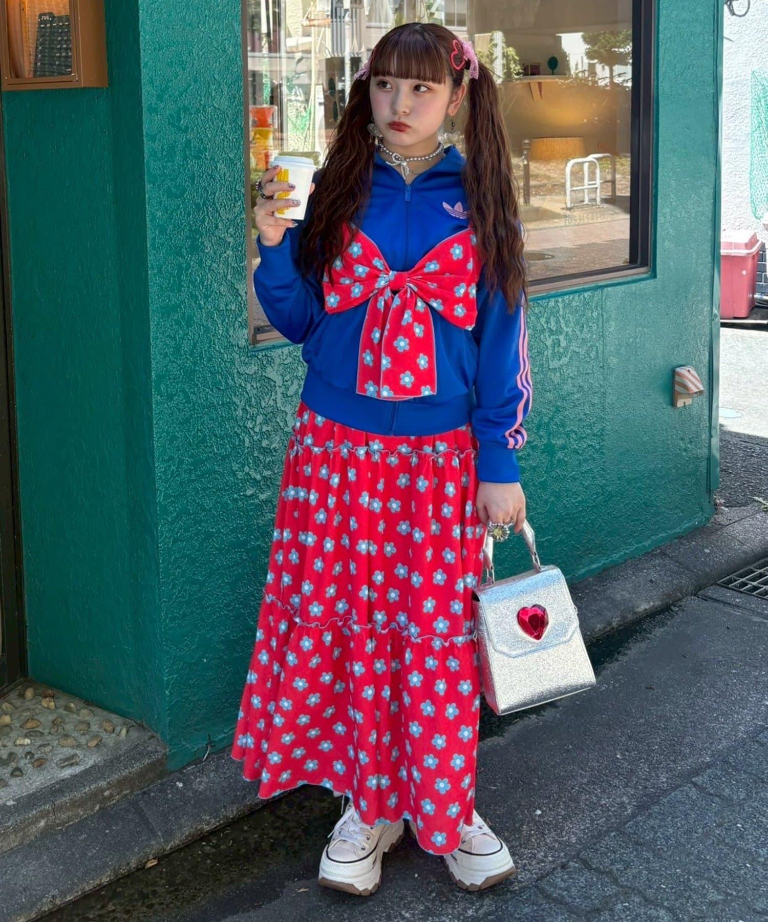 復古流行的花朵圖案,胸前的大絲帶是一大亮點!