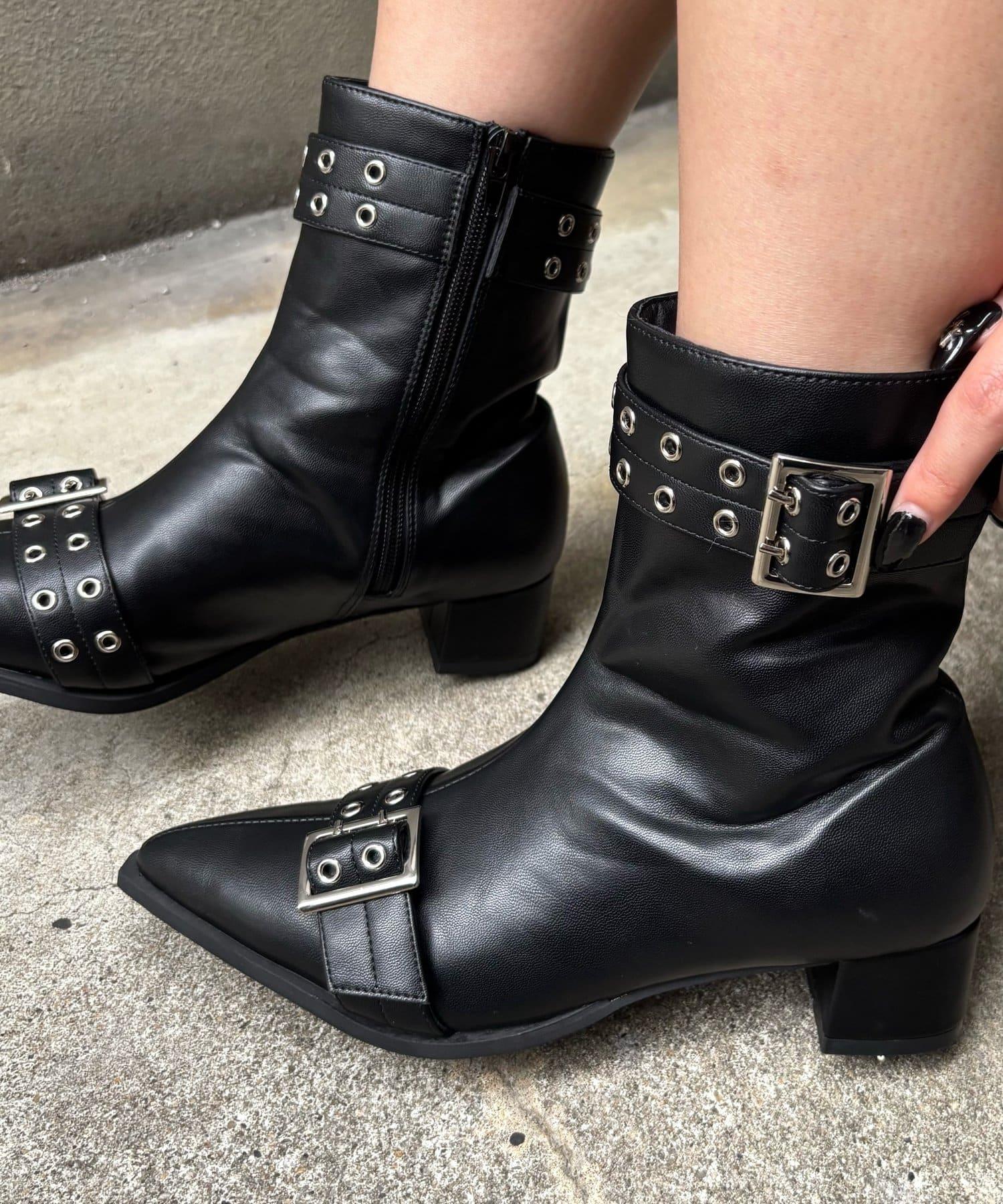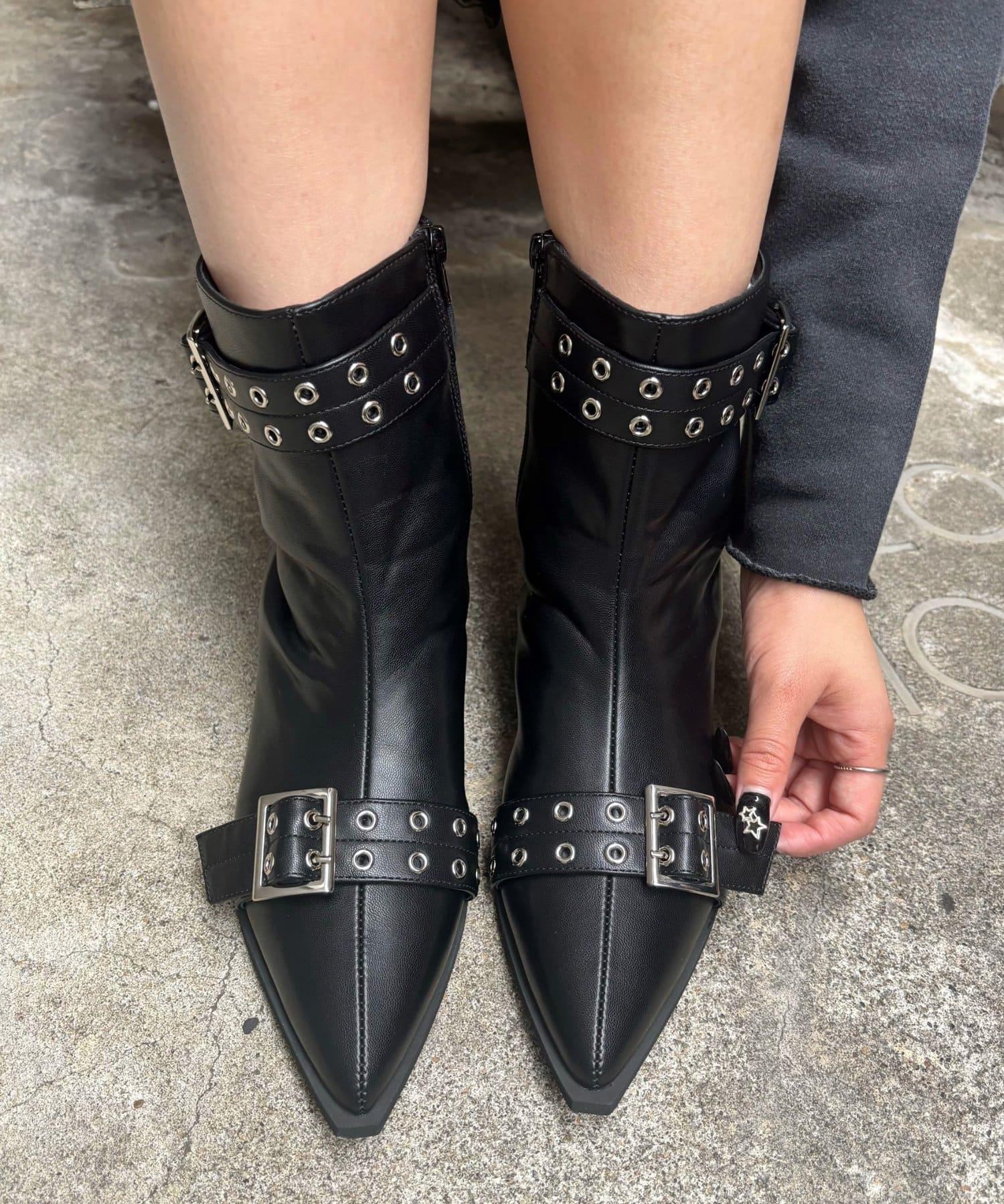 一雙短靴,設計辛辣,雙腰帶點綴。
