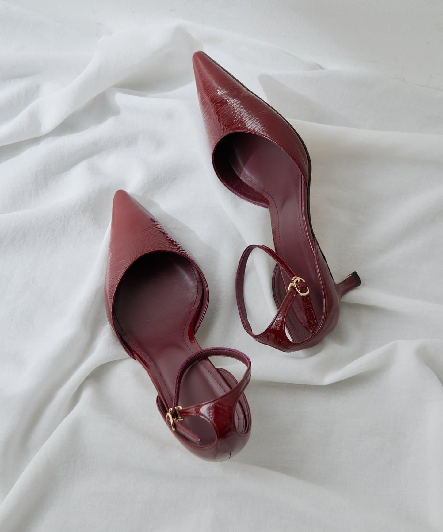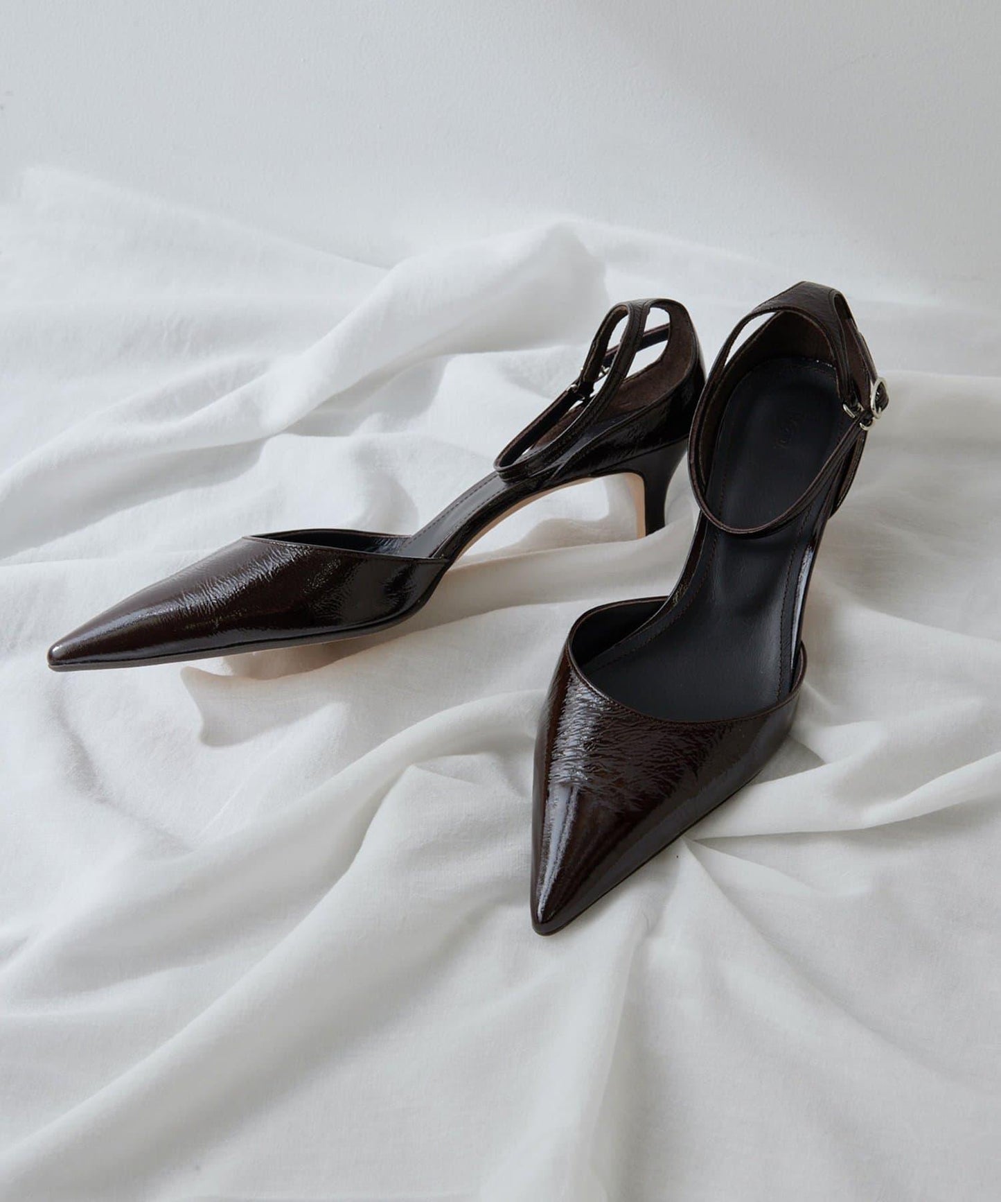 尖尖的鞋頭讓腳部顯得圓潤,纖細修長的鞋帶營造出精緻的平衡感。