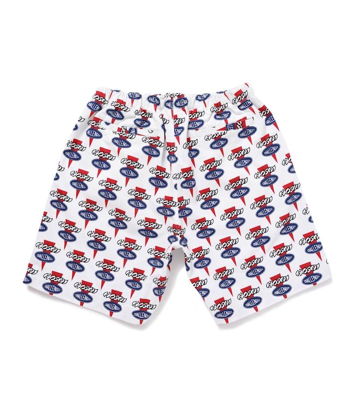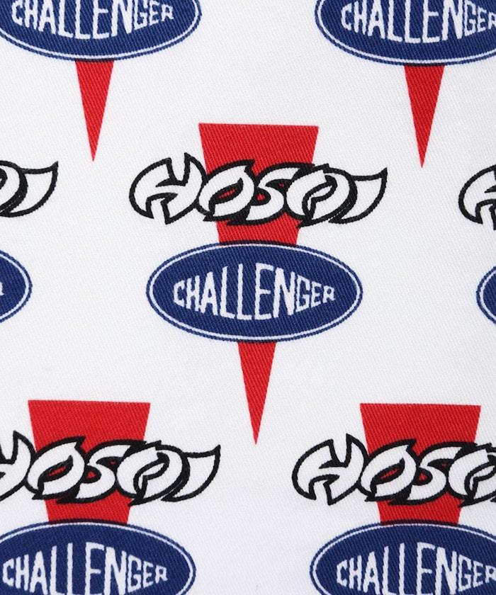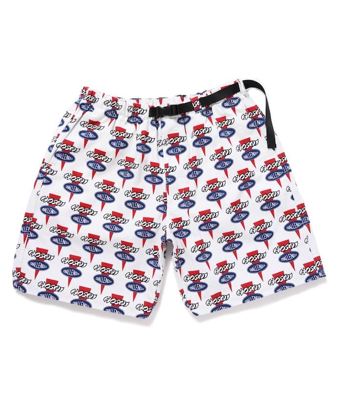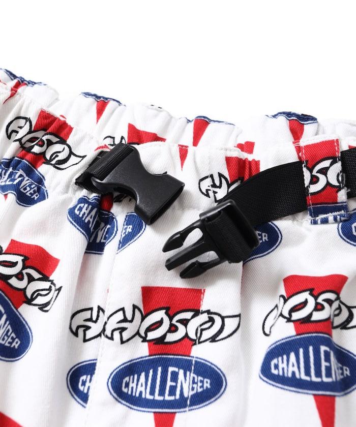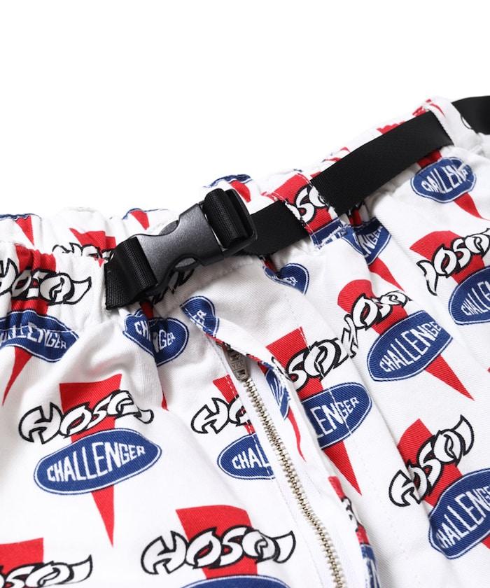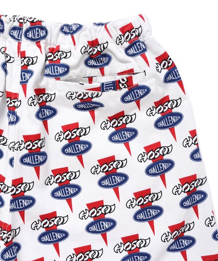 簡易短褲,印有 HOSOI SKATEBOARDS 和 CHALLENGER 的合作標誌。