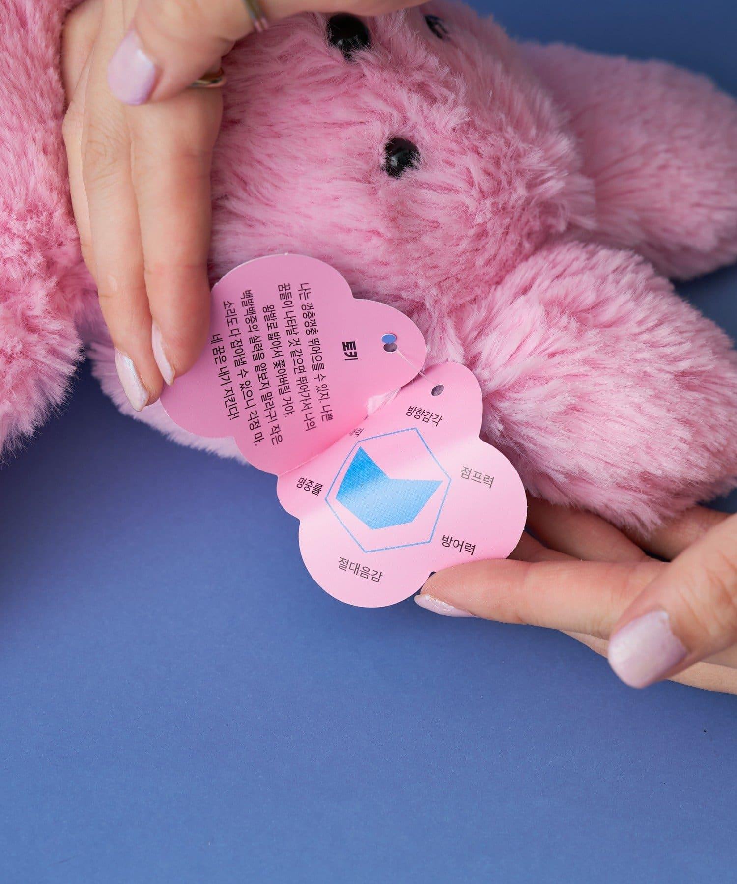 這是一隻可愛的毛絨兔子。標籤內有一張圖表,介紹了這個小傢伙的特點。