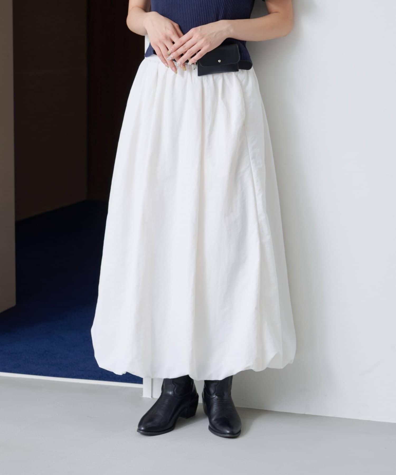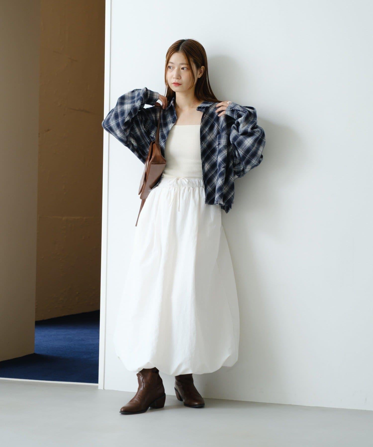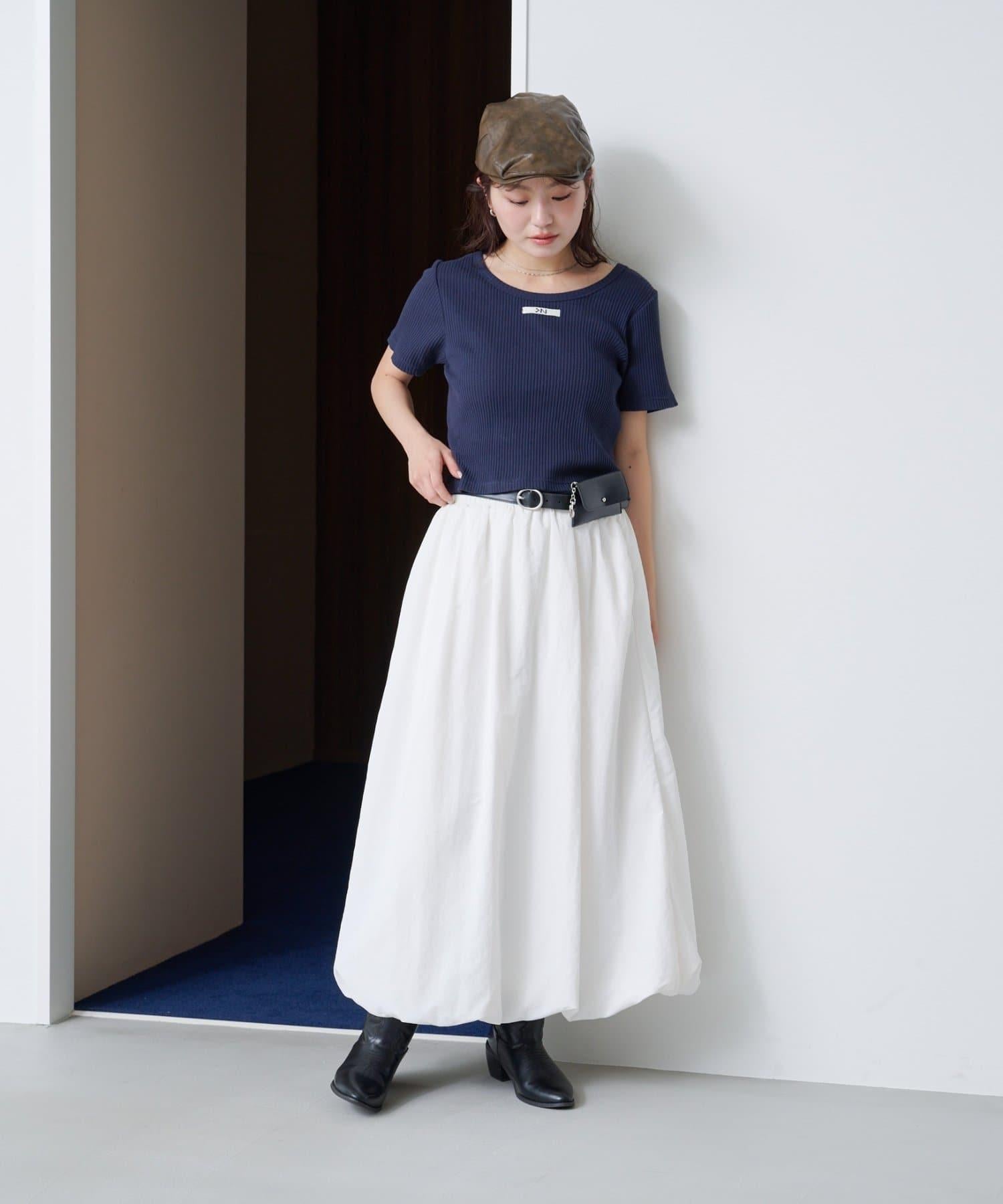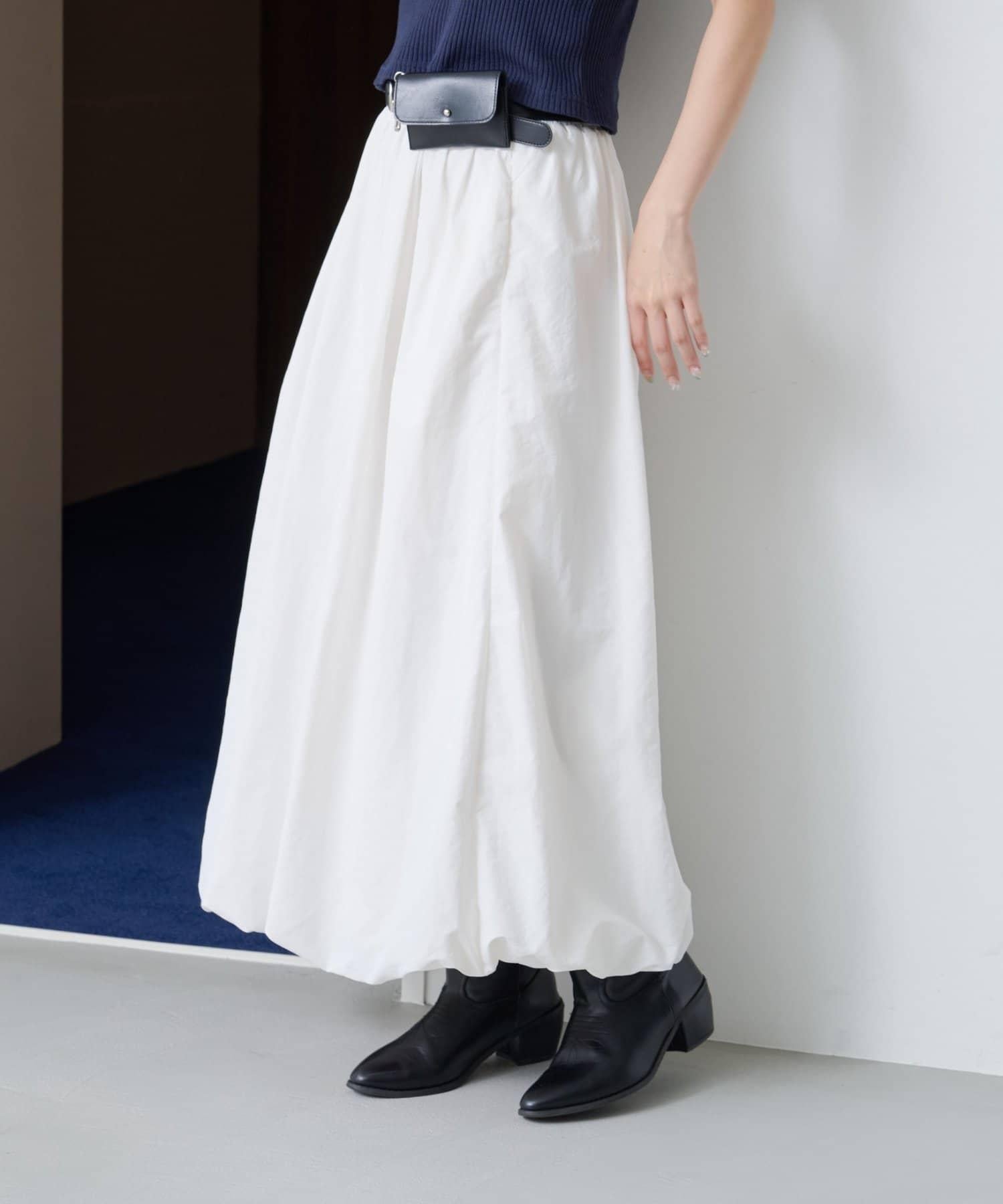 蓬鬆的白色氣球裙搭配緊身羅紋剪裁,縫製出利落的輪廓。腳踩運動鞋增添輕盈感,鴨舌帽和手提包營造粗獷氛圍。