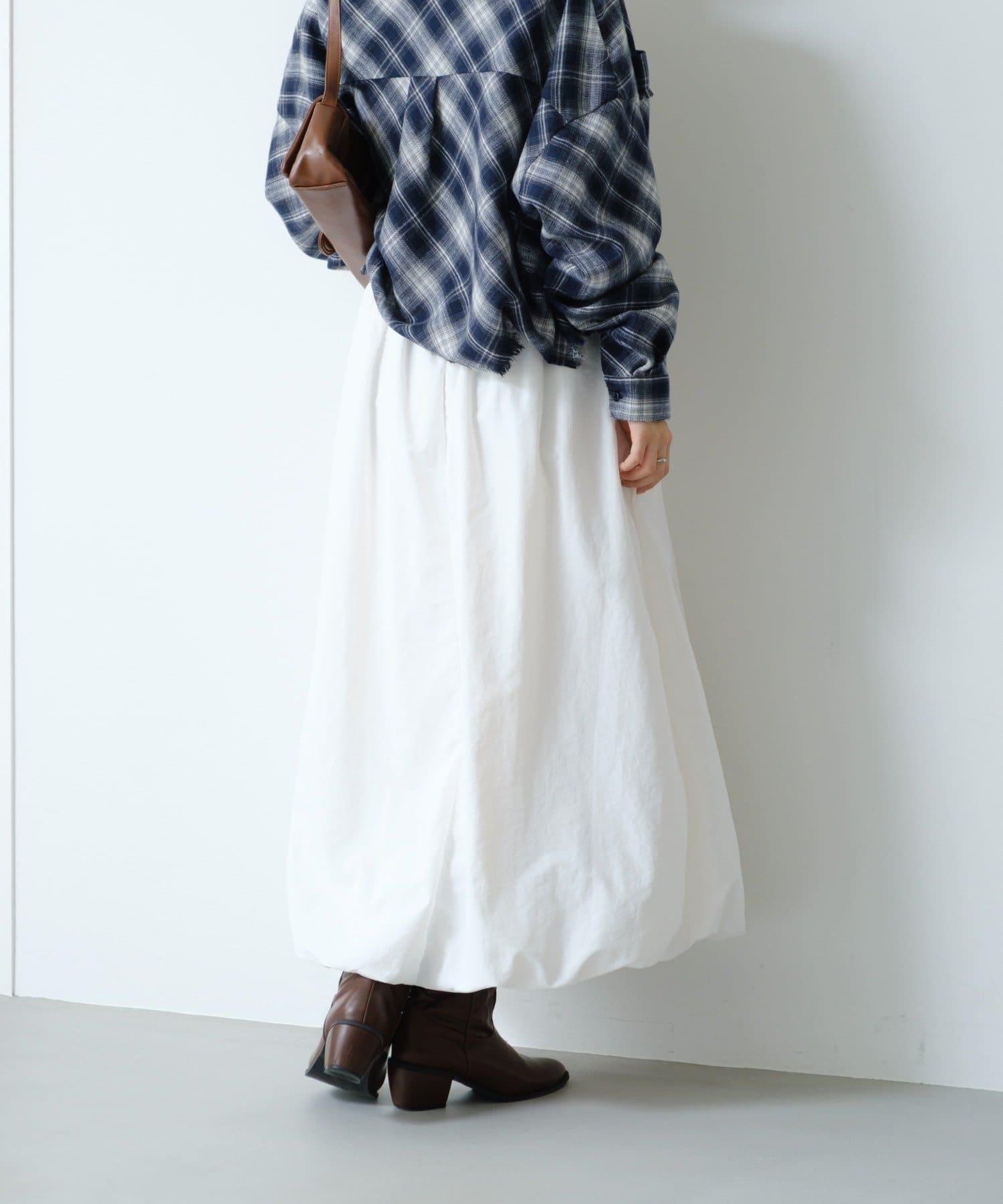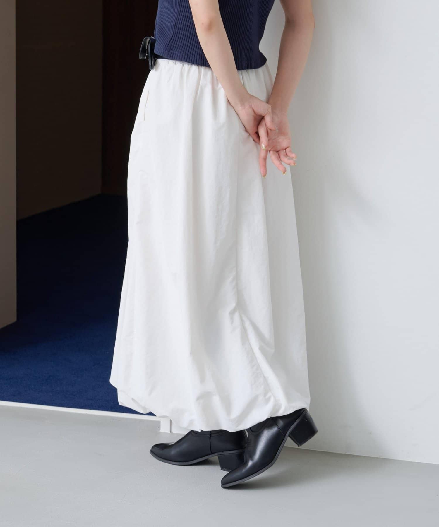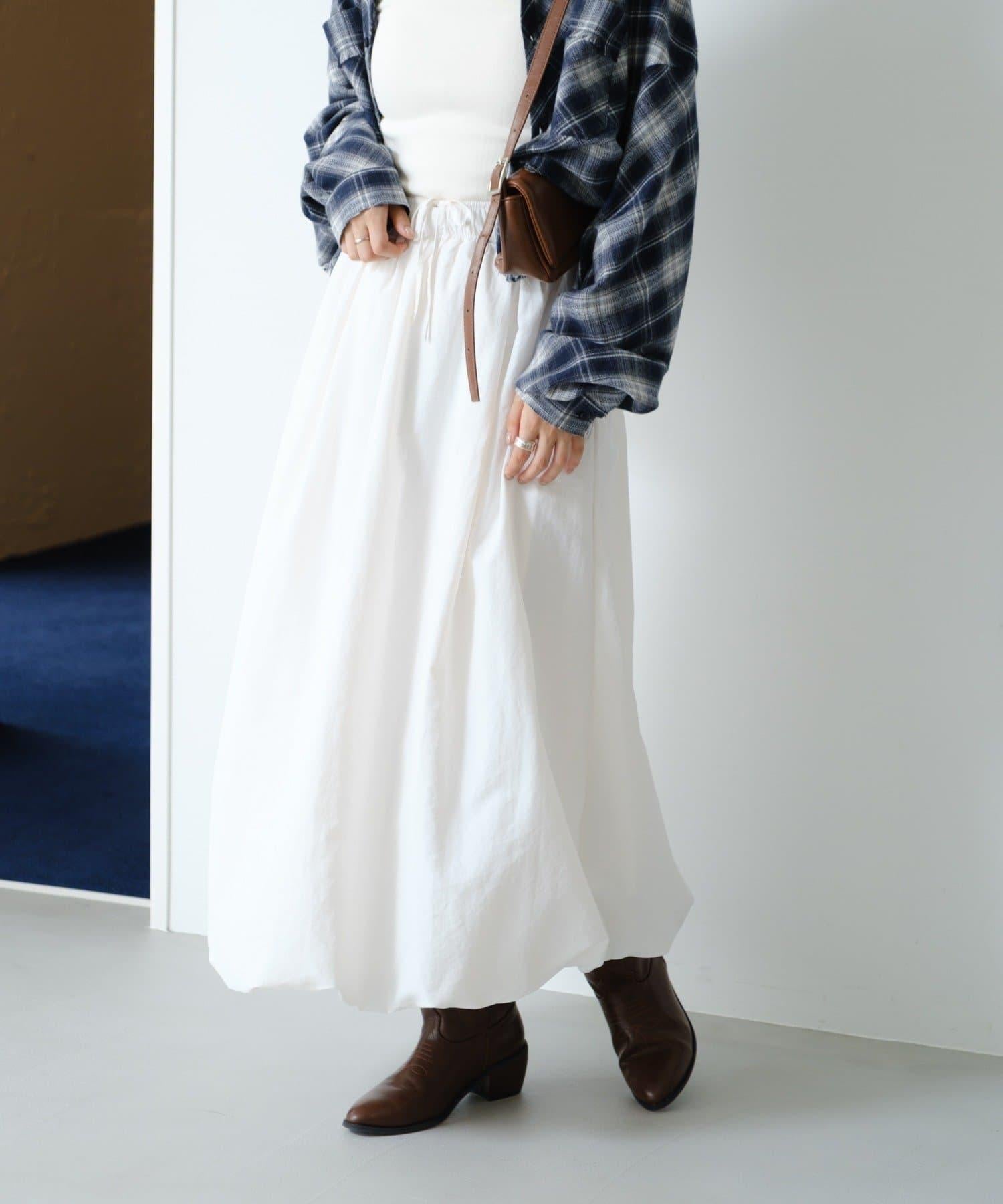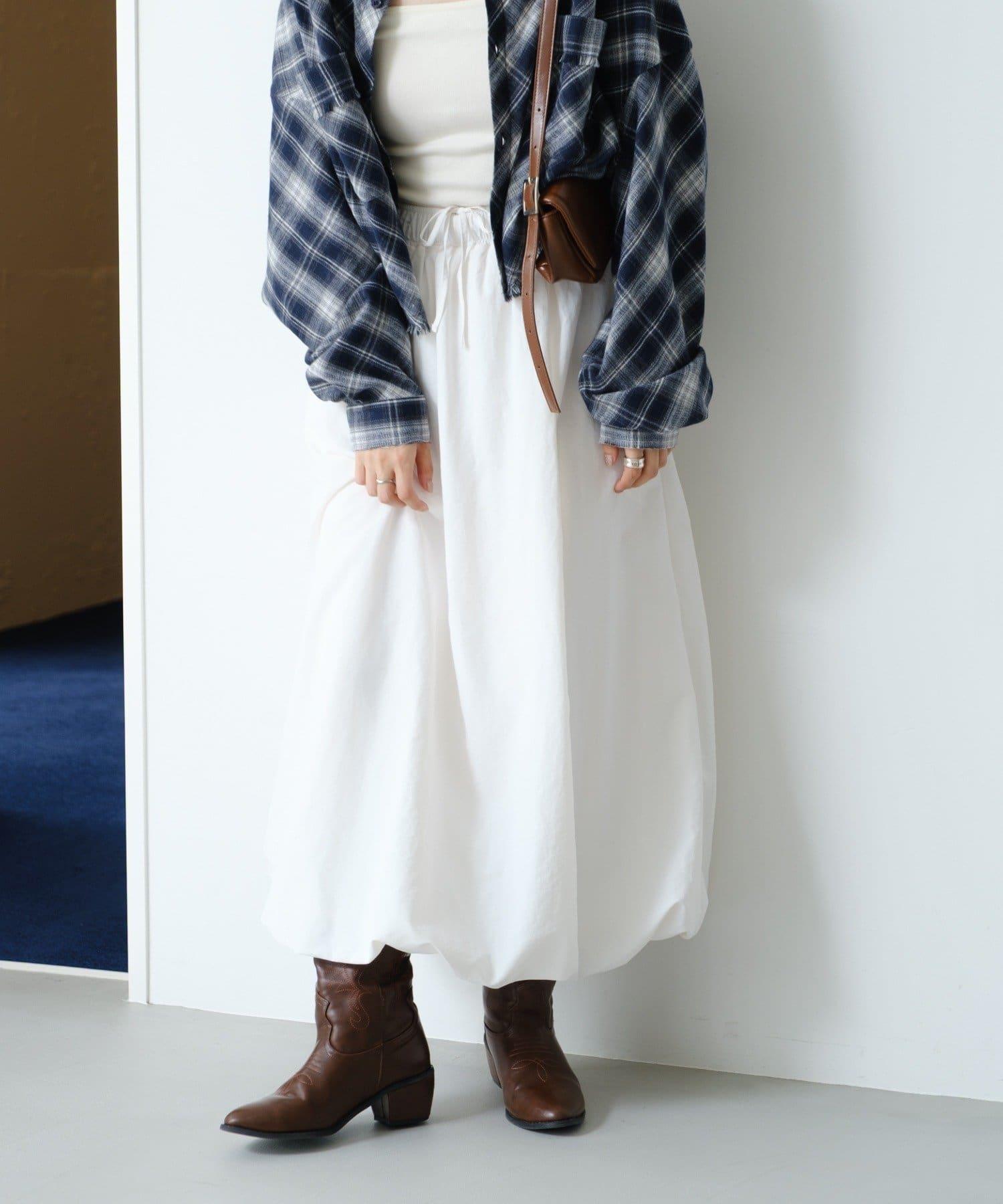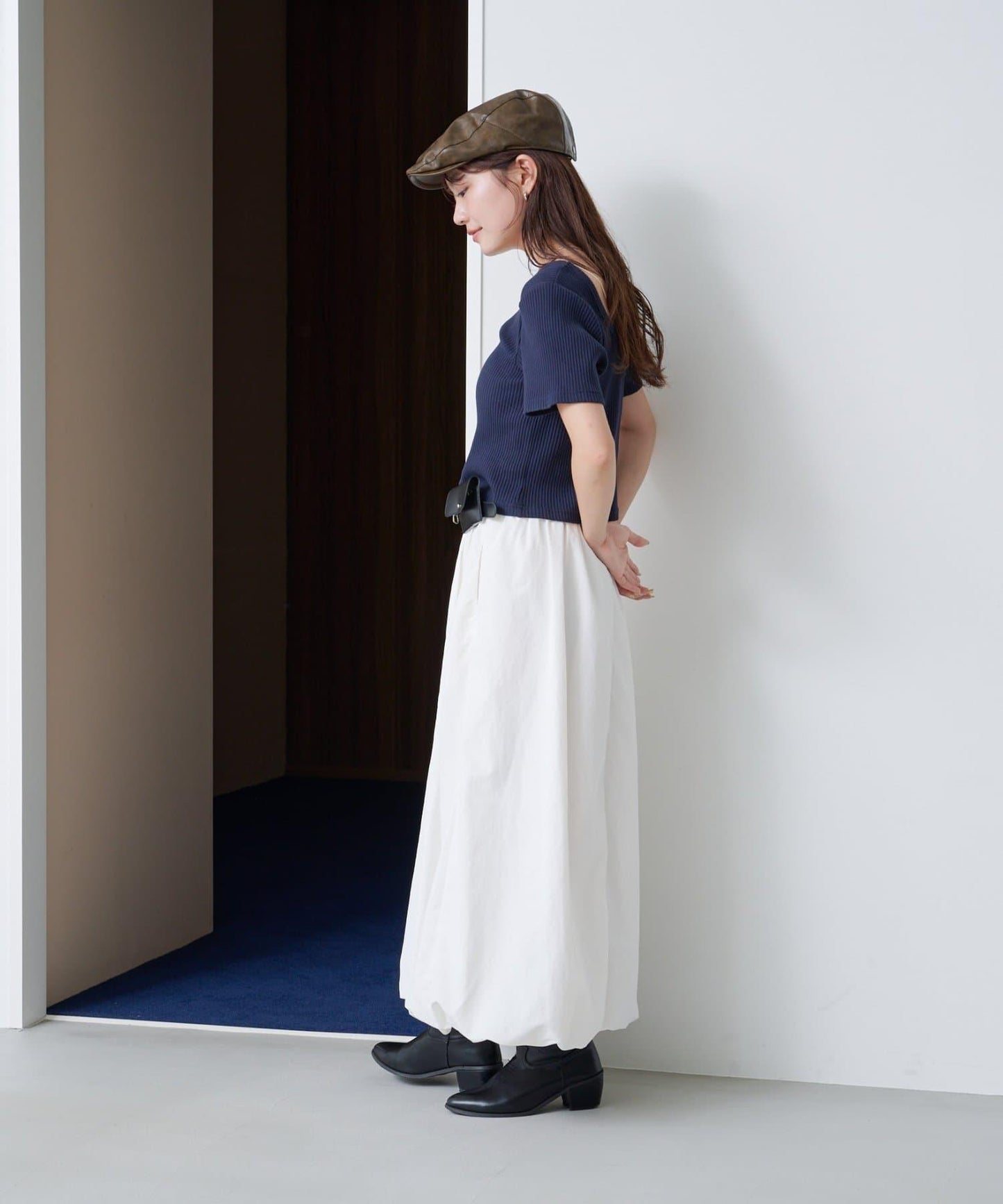 蓬鬆的白色氣球裙搭配緊身羅紋剪裁,縫製出利落的輪廓。腳踩運動鞋增添輕盈感,鴨舌帽和手提包營造粗獷氛圍。