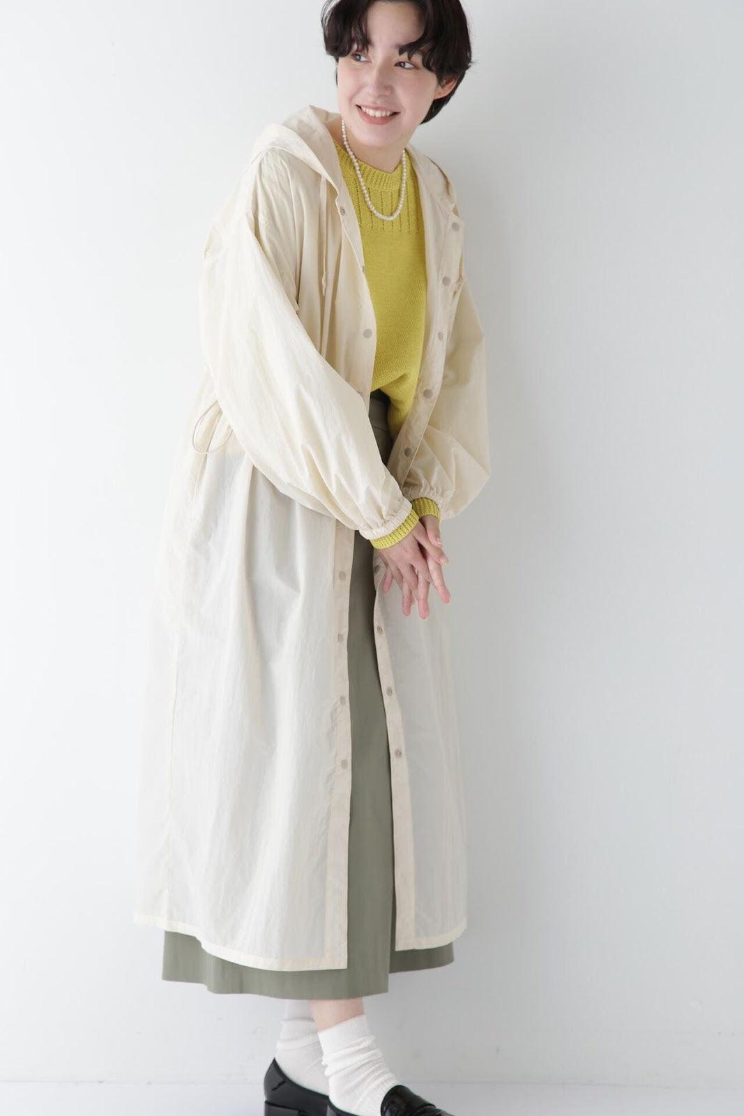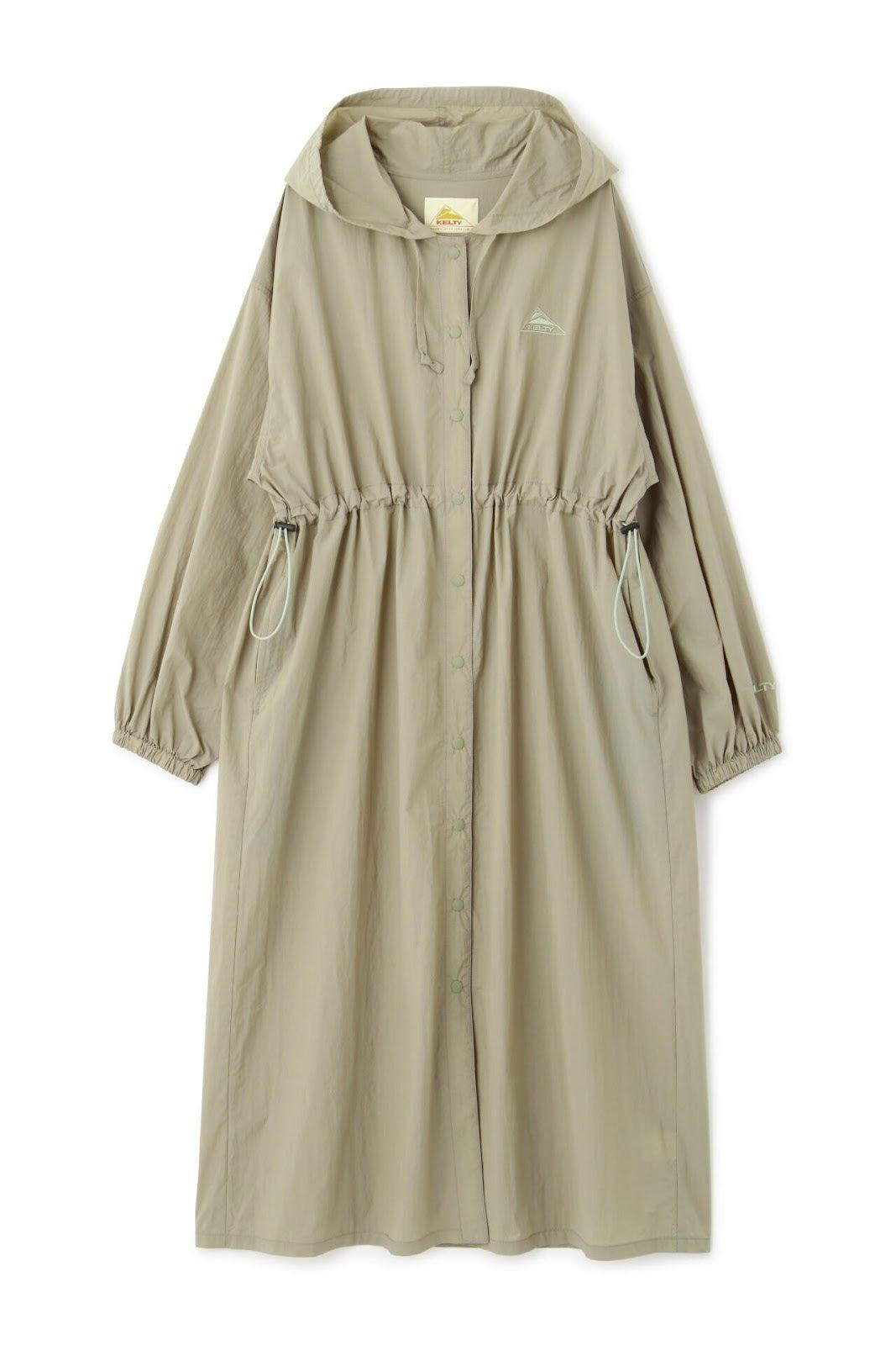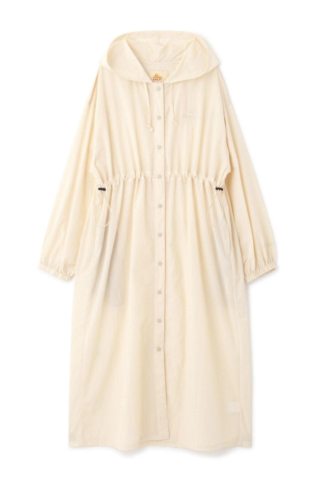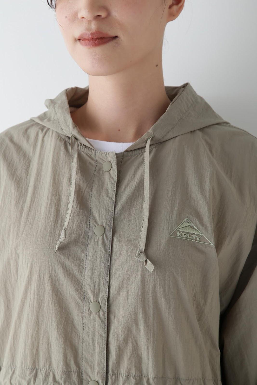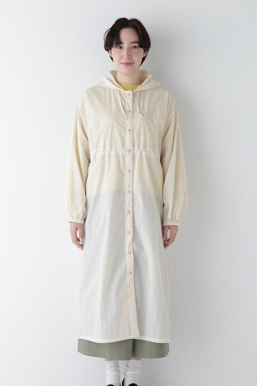 KELTY x HUMAN WOMAN 合作定製連帽連身衣 [設計要點] 這款連帽連身衣是與 KELTY 合作推出的。這款連帽連身衣原本設計為短款襯衫式連帽外套,現在特別定製了長款。您還可以享受略微寬鬆的廓形和腰部開襟的廓形變化。顏色和刺繡顏色為特別定製。面料採用輕薄、防水、透明的墊圈材料。推薦搭配:可作為連衣裙或梭織外套穿著。由於其透明性,還建議下穿褲子或與花紋面料疊穿。