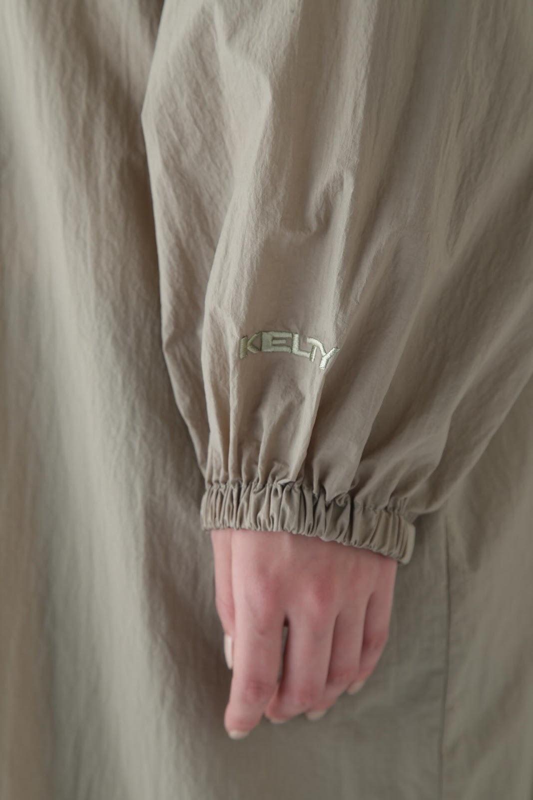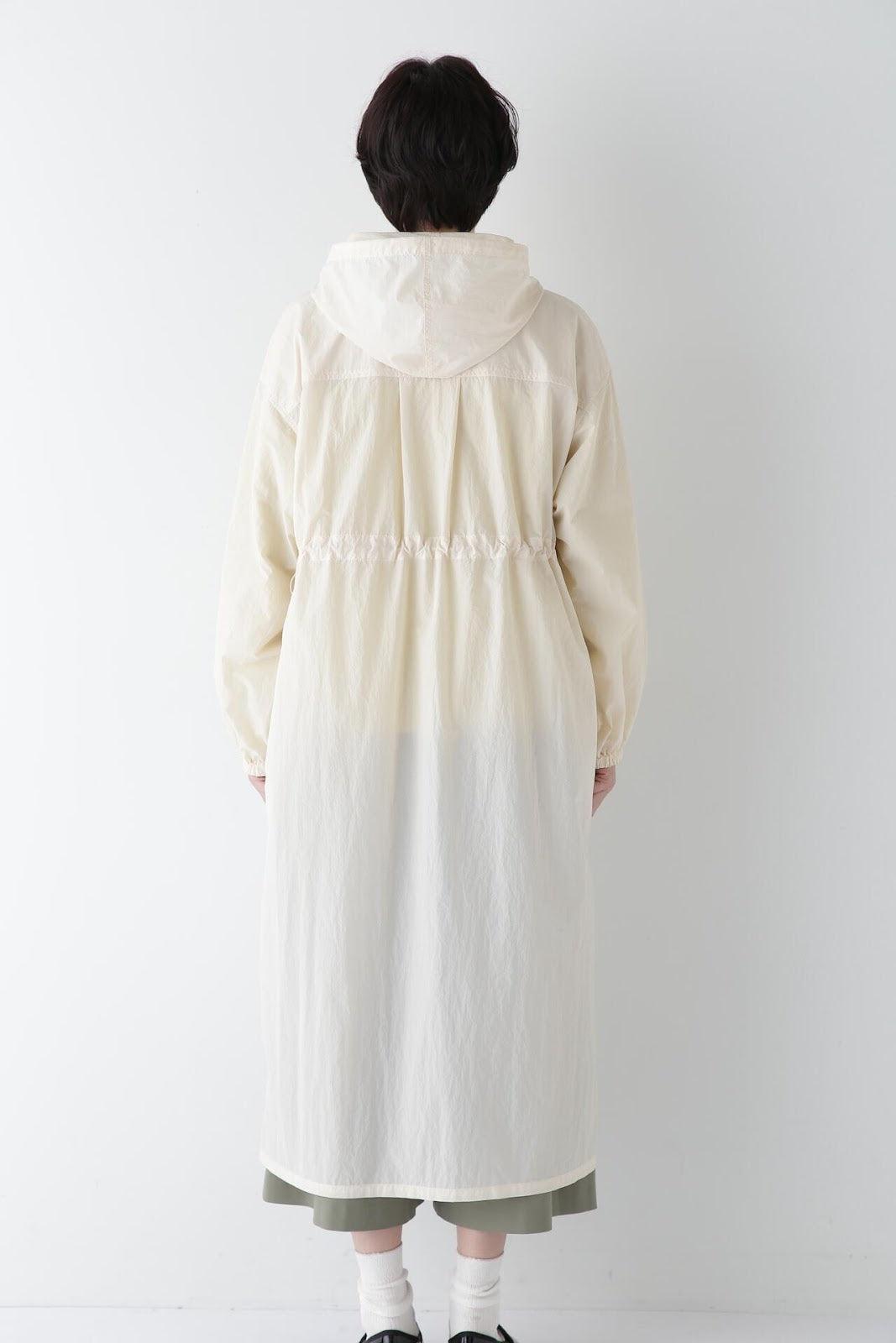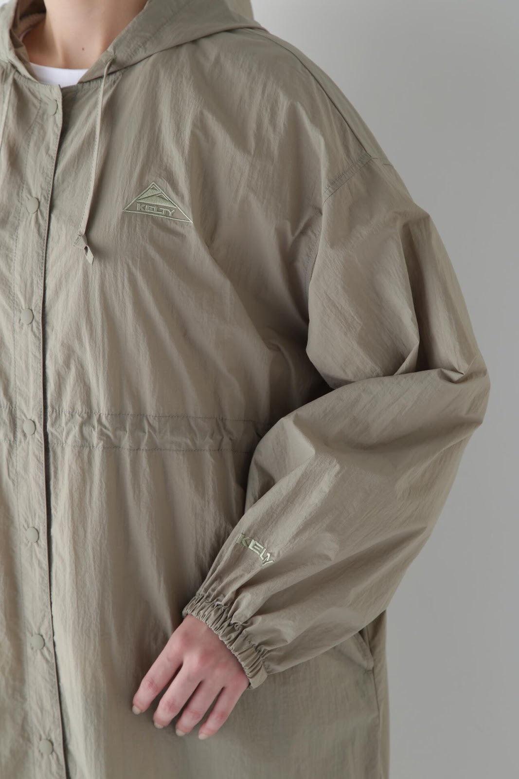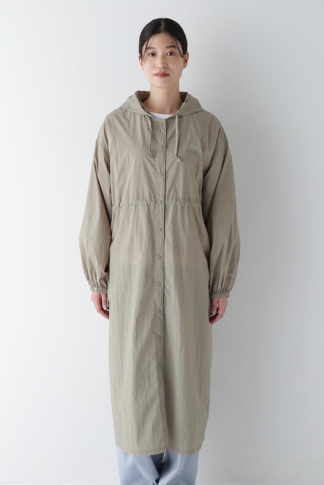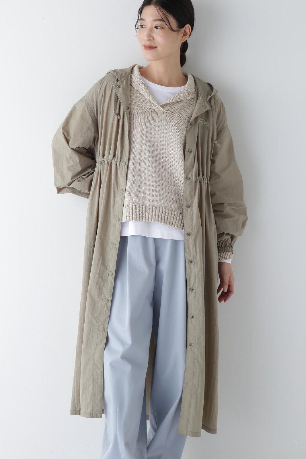 KELTY x HUMAN WOMAN 合作定製連帽連身衣 [設計要點] 這款連帽連身衣是與 KELTY 合作推出的。這款連帽連身衣原本設計為短款襯衫式連帽外套,現在特別定製了長款。您還可以享受略微寬鬆的廓形和腰部開襟的廓形變化。顏色和刺繡顏色為特別定製。面料採用輕薄、防水、透明的墊圈材料。推薦搭配:可作為連衣裙或梭織外套穿著。由於其透明性,還建議下穿褲子或與花紋面料疊穿。