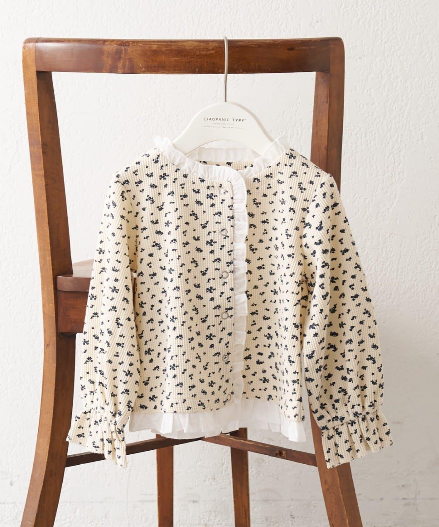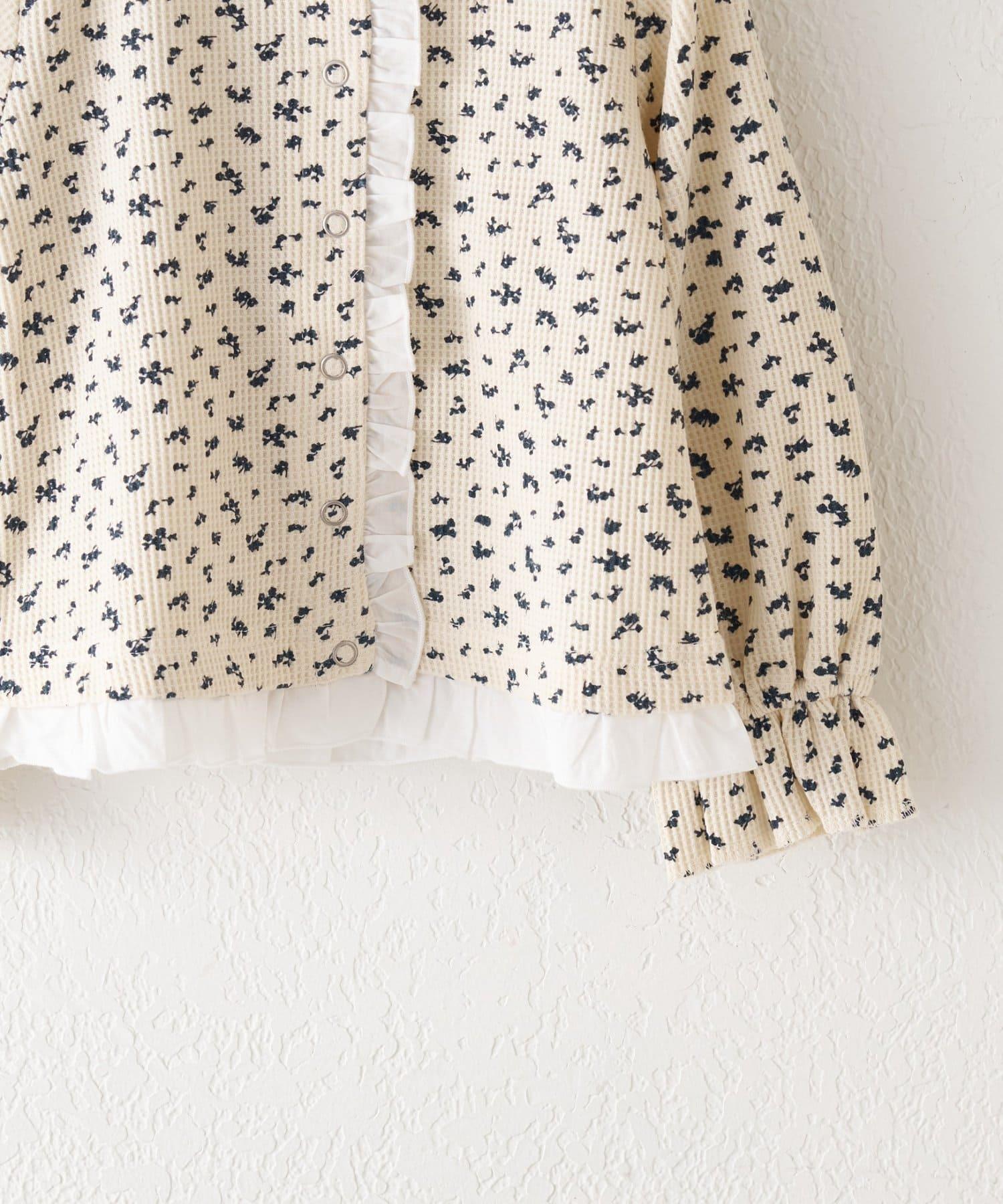 【KIDS】花卉印花荷葉邊華夫格按扣開衫
