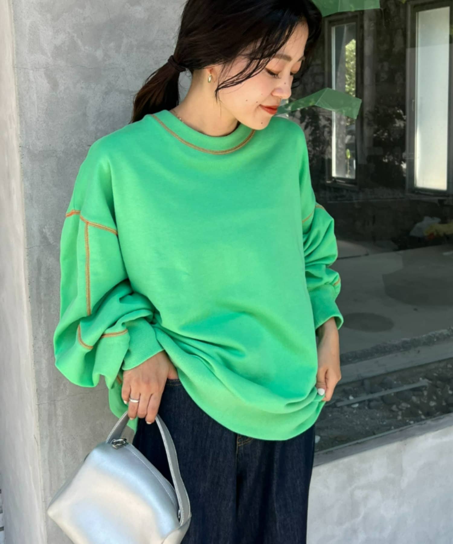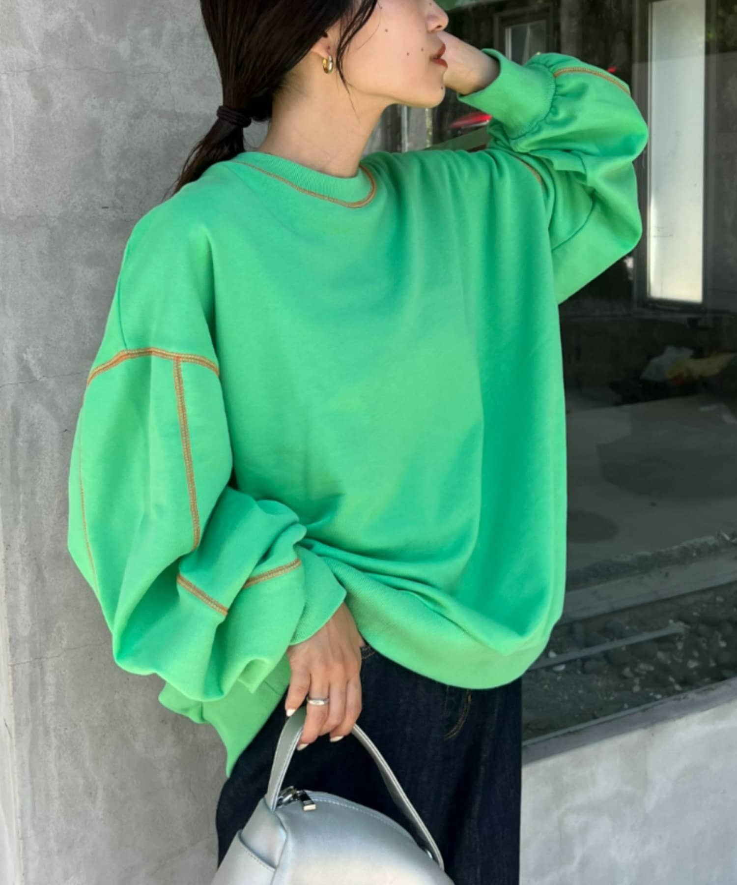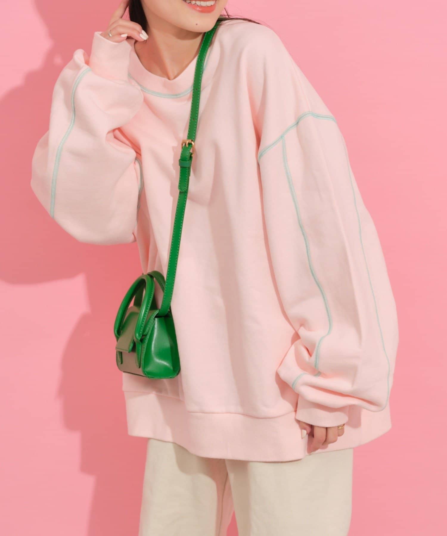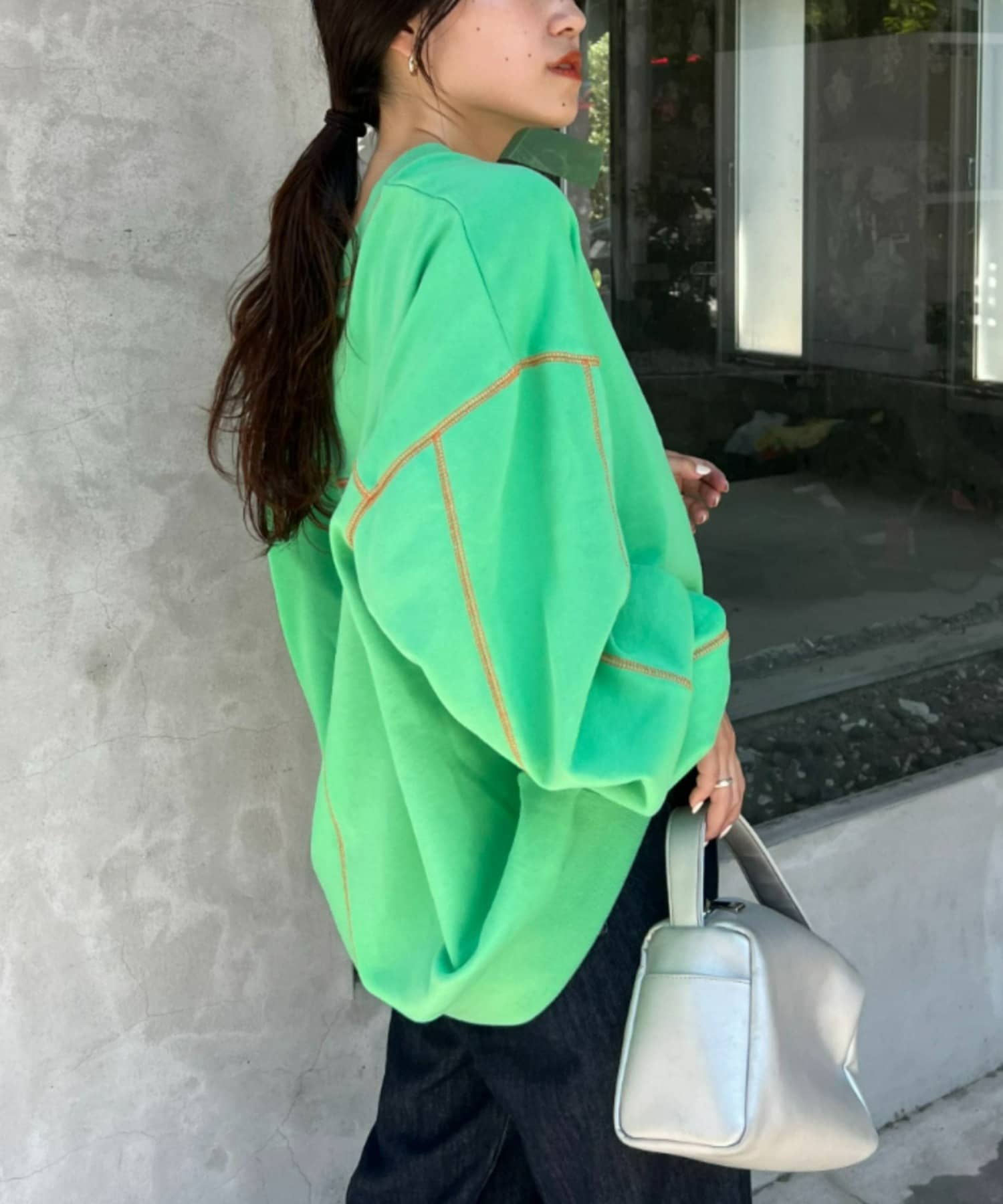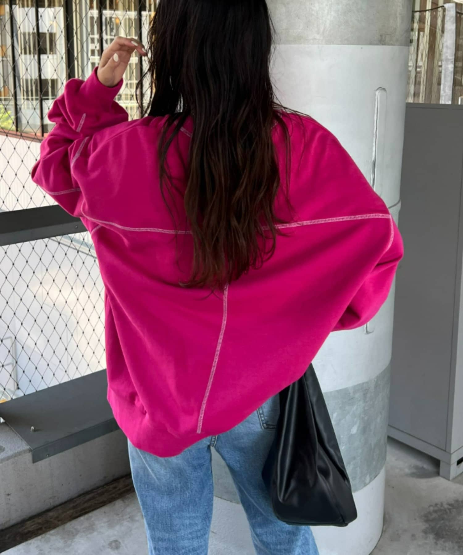 一件時髦的超大套頭衫,有一個醒目的顏色協調的縫製設計。