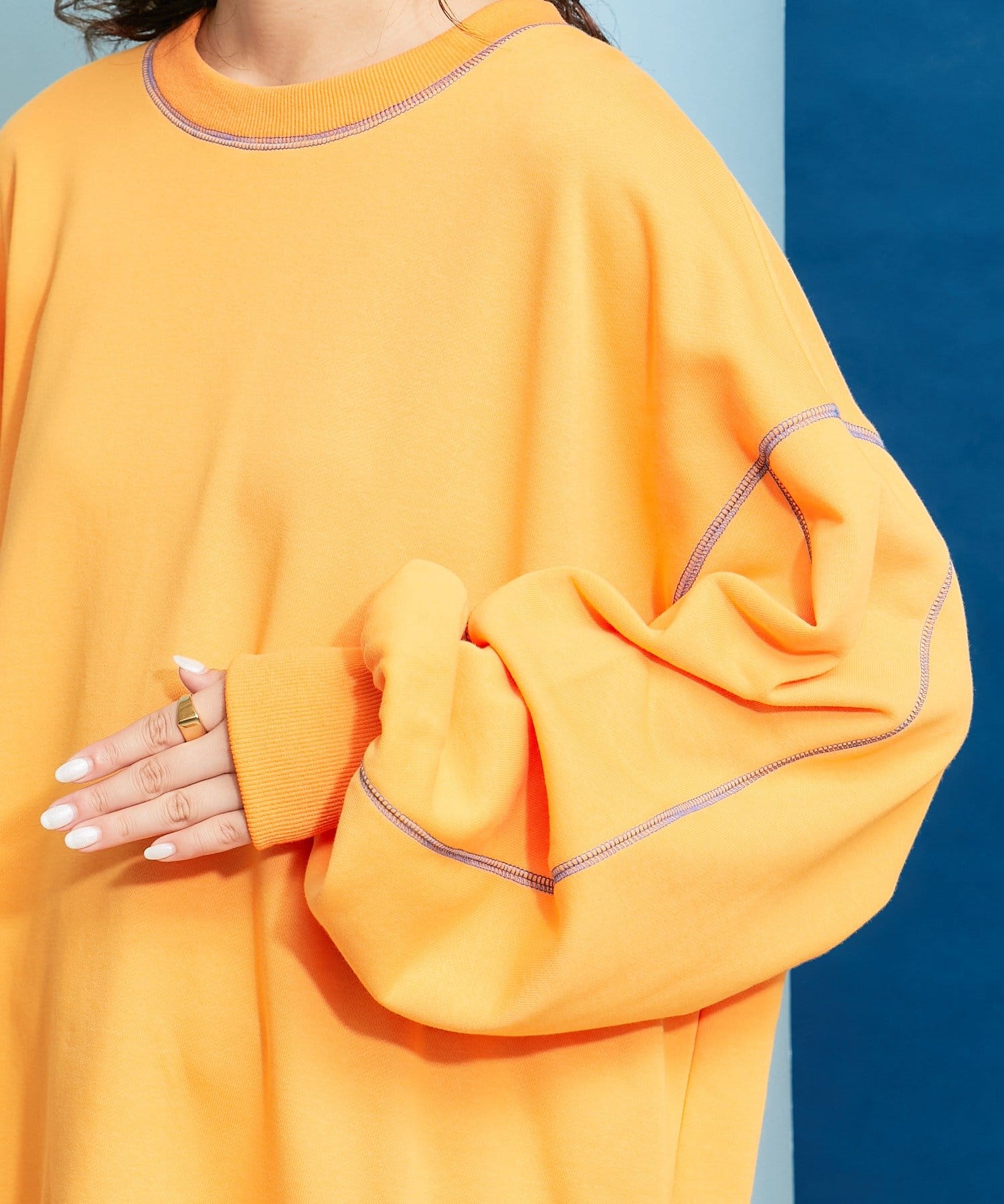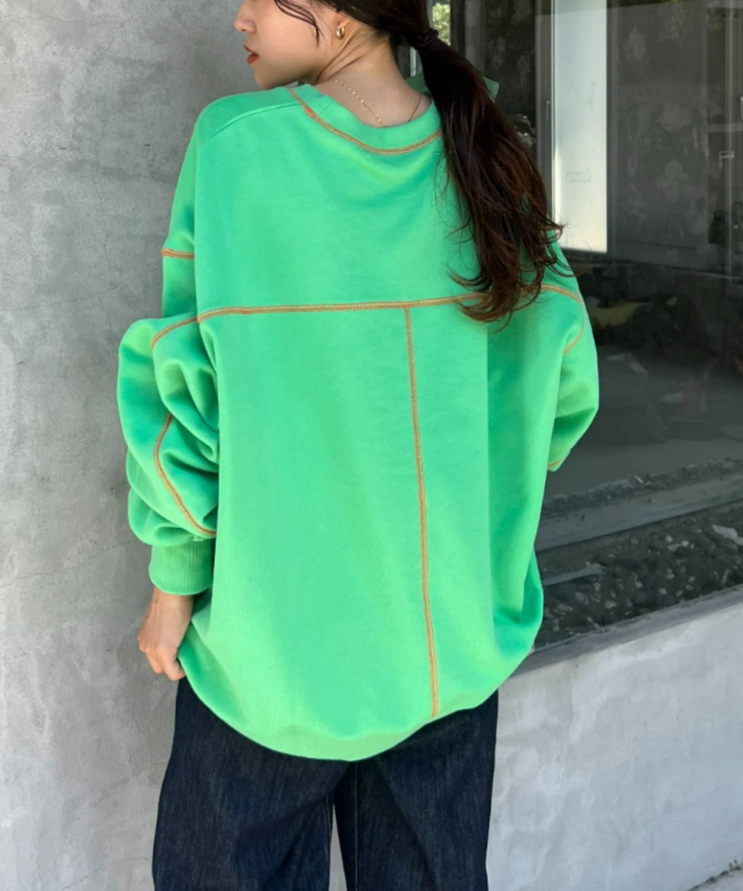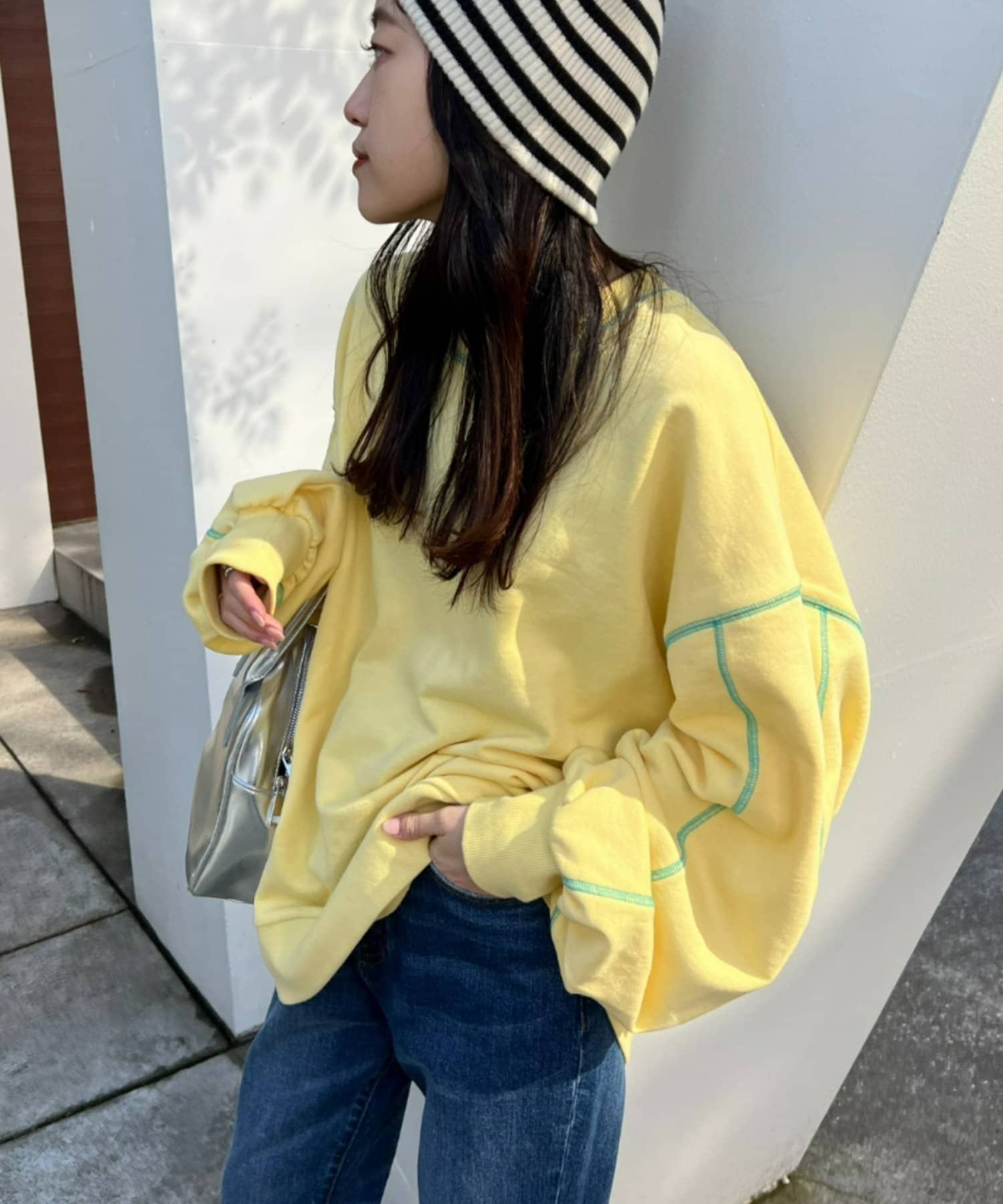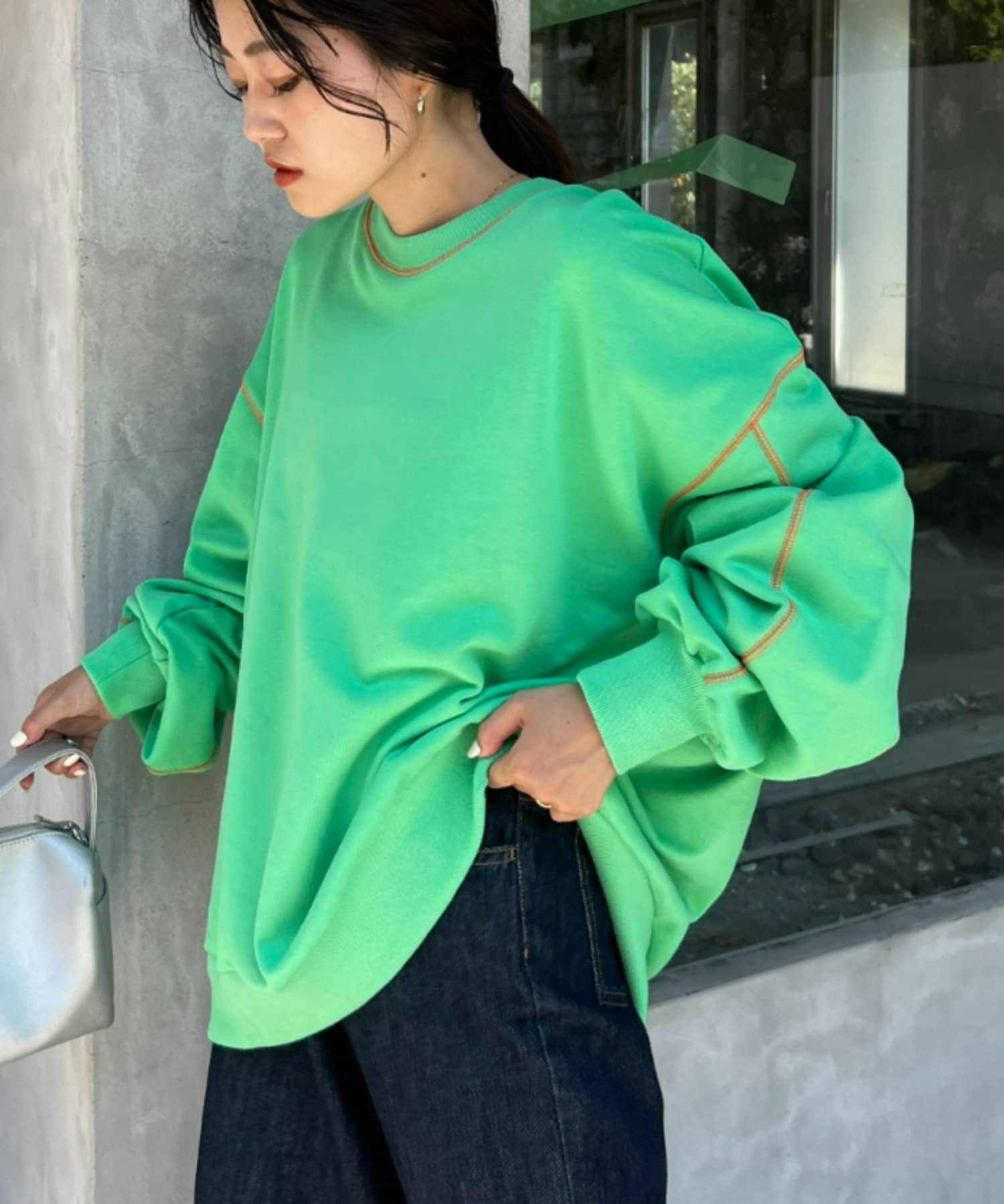 一件時髦的超大套頭衫,有一個醒目的顏色協調的縫製設計。