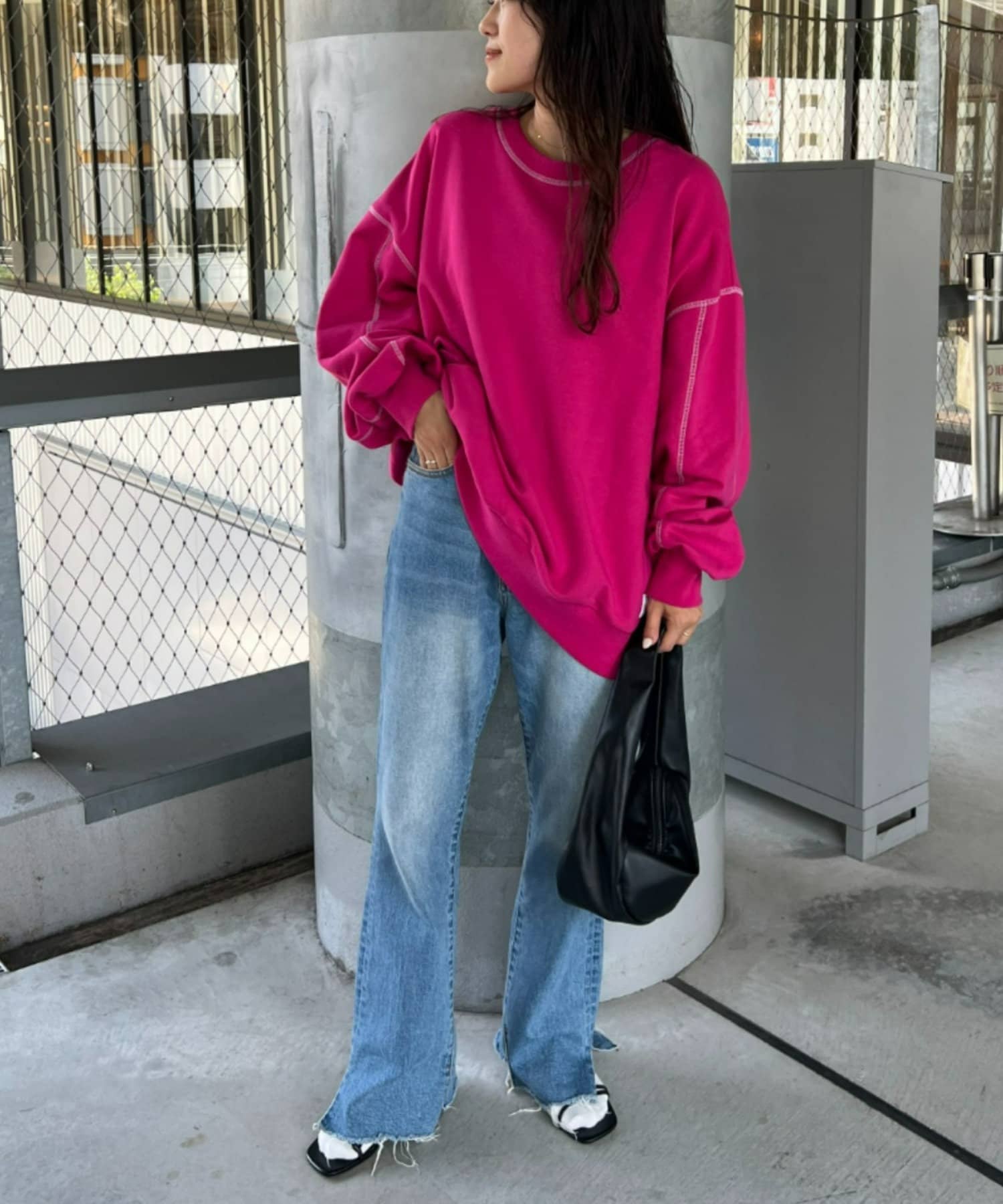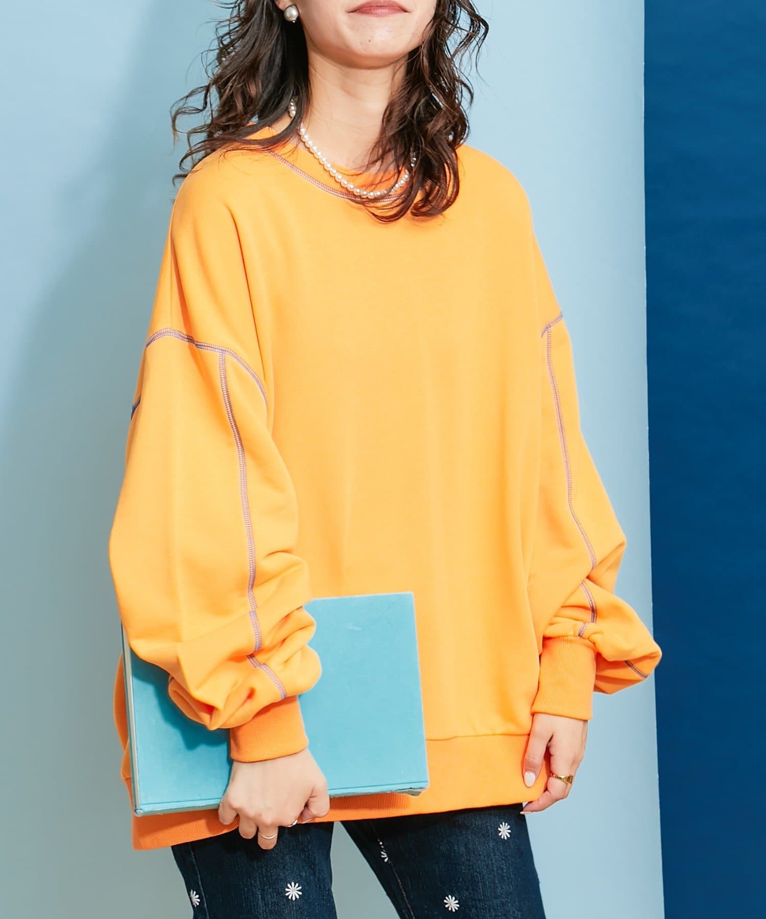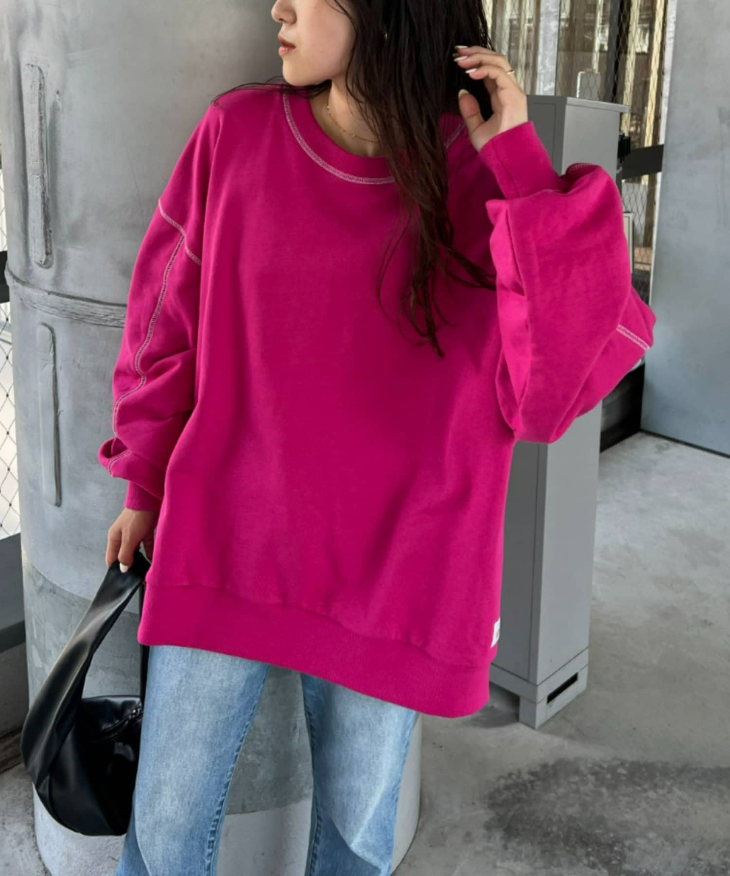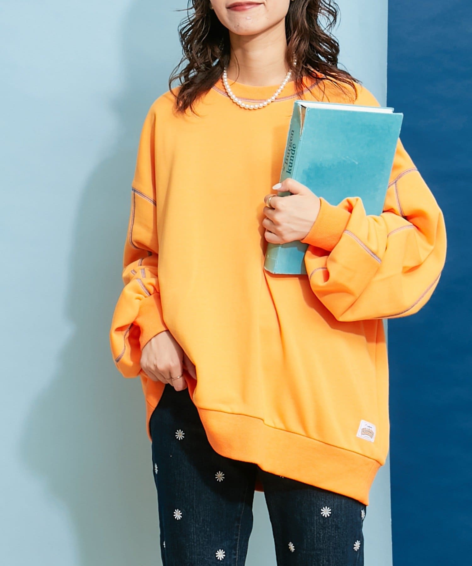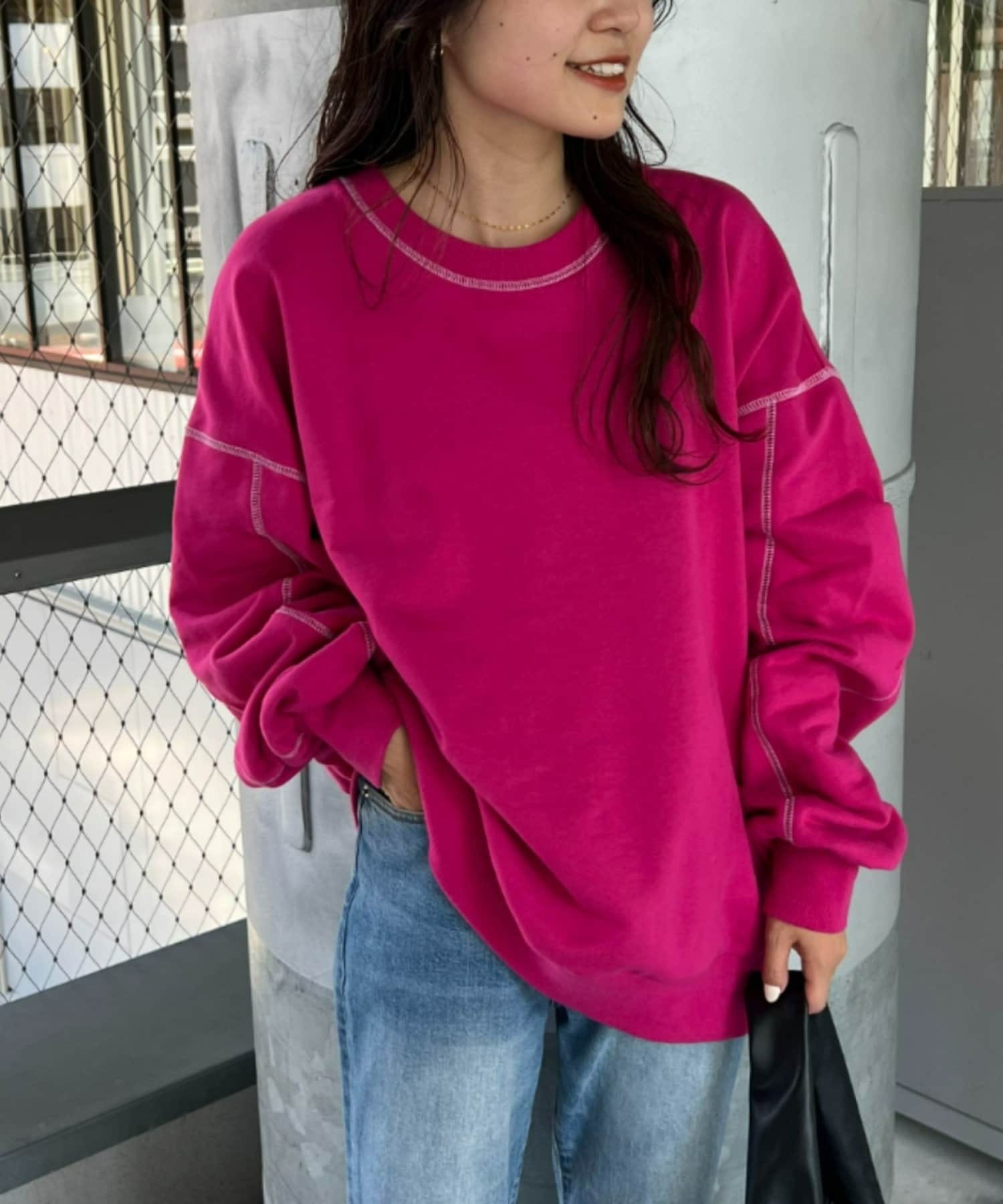 一件時髦的超大套頭衫,有一個醒目的顏色協調的縫製設計。