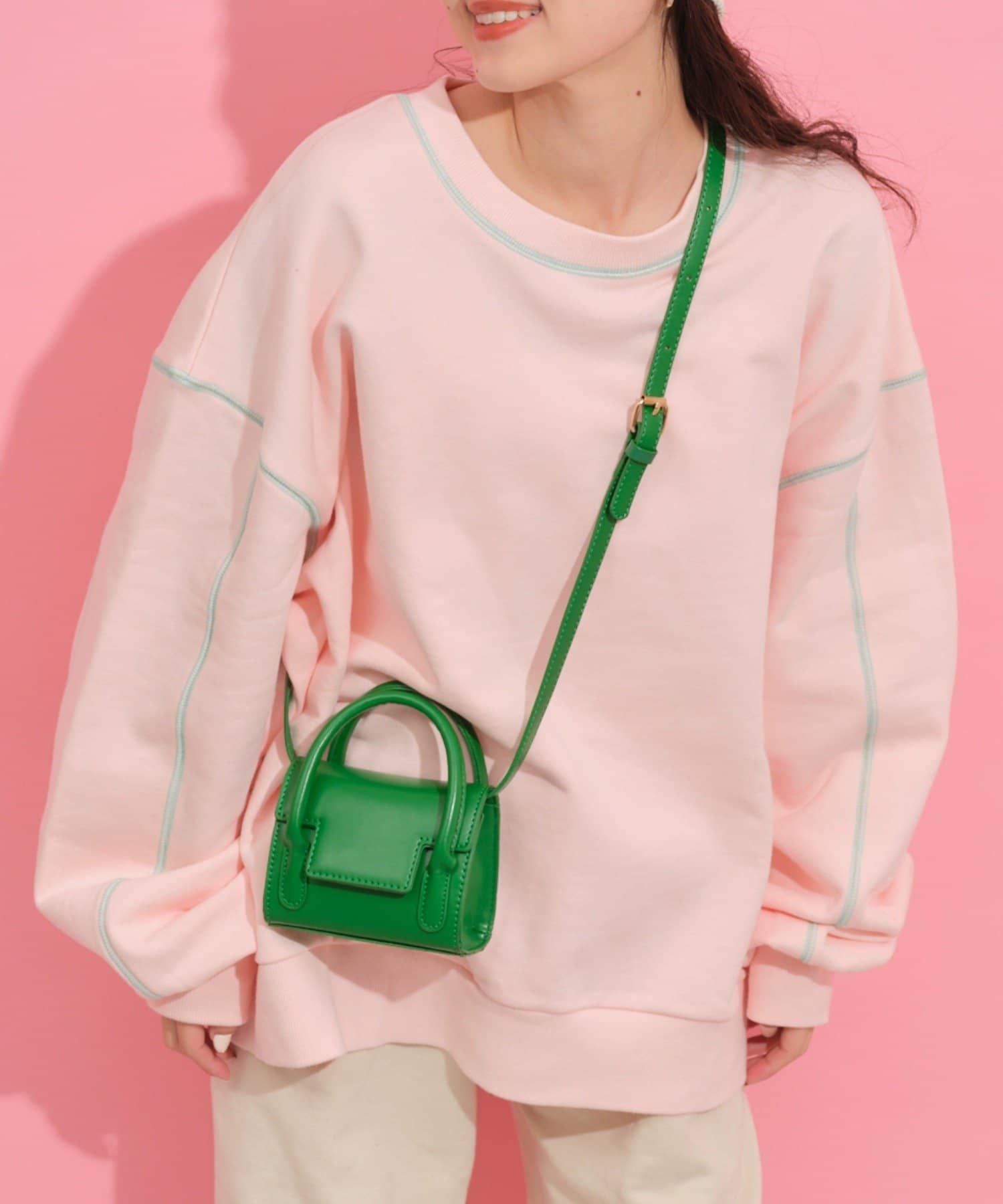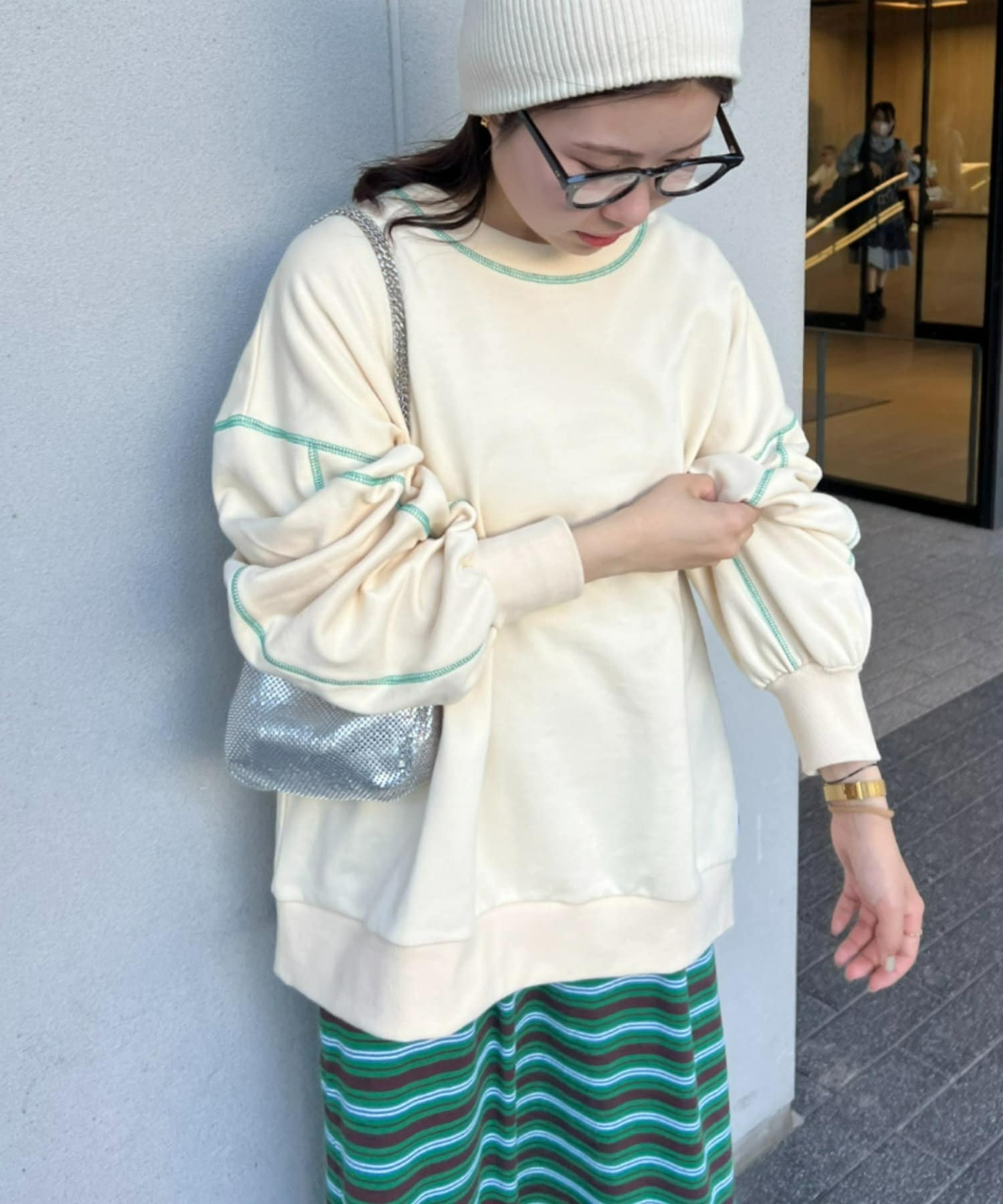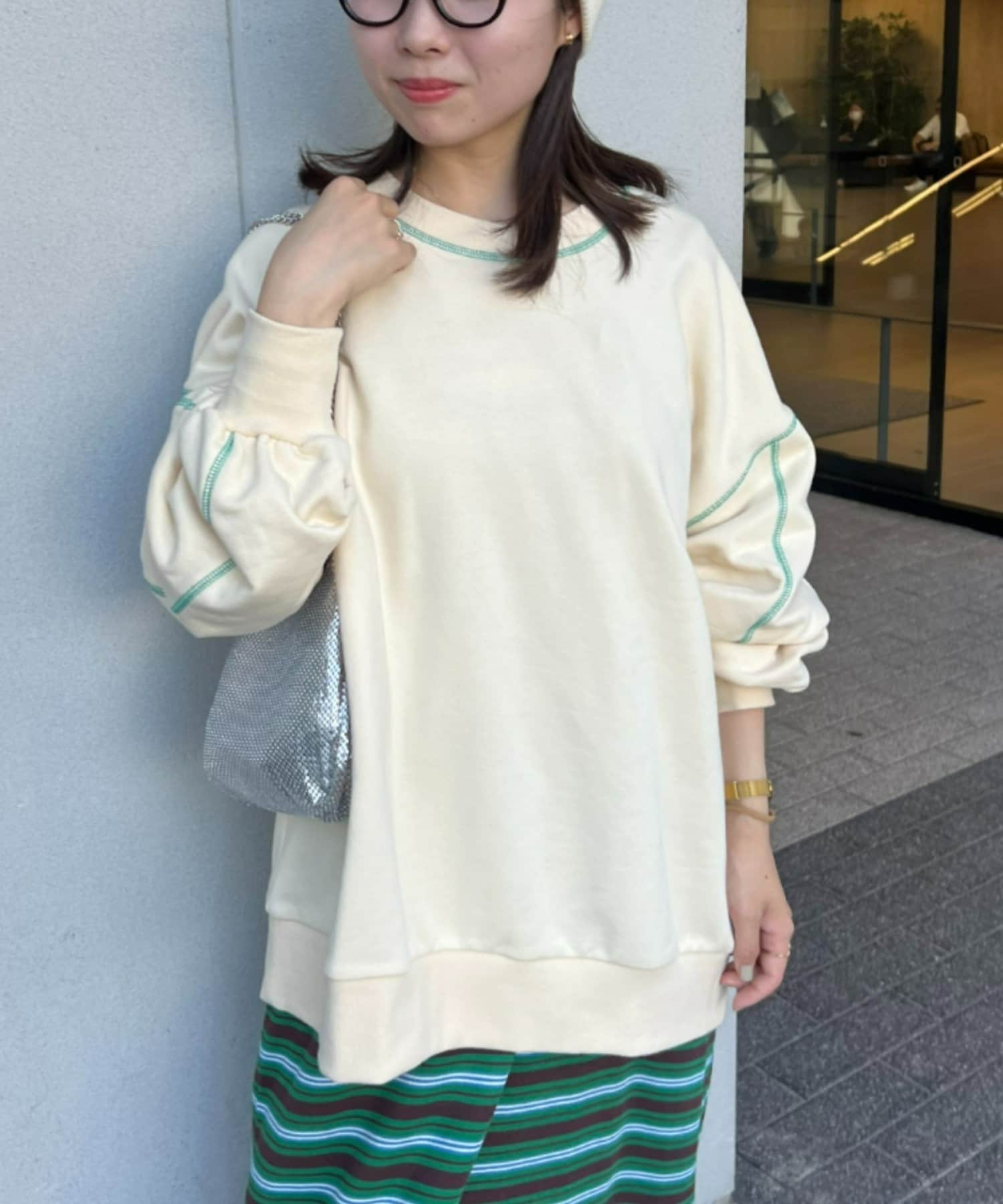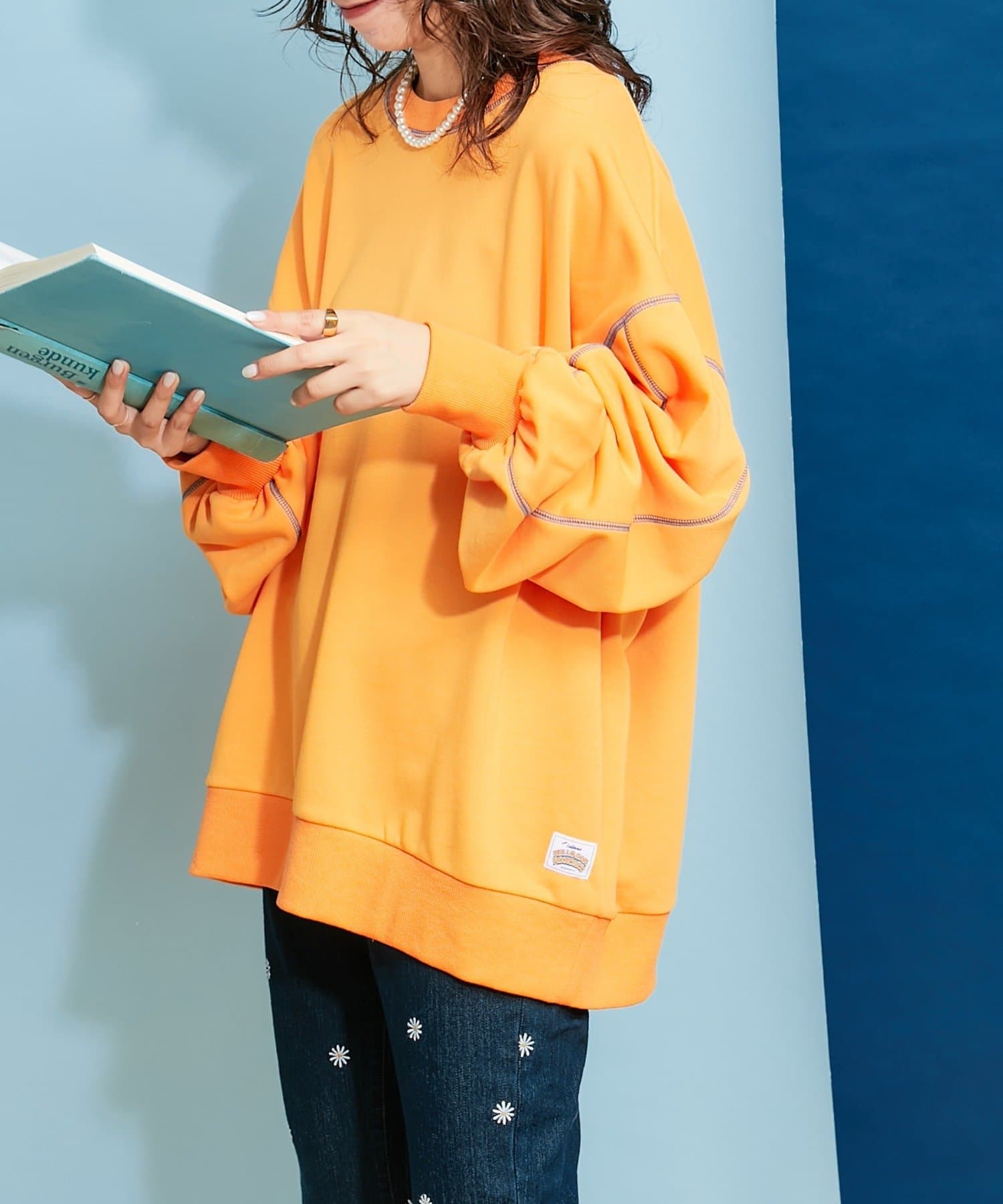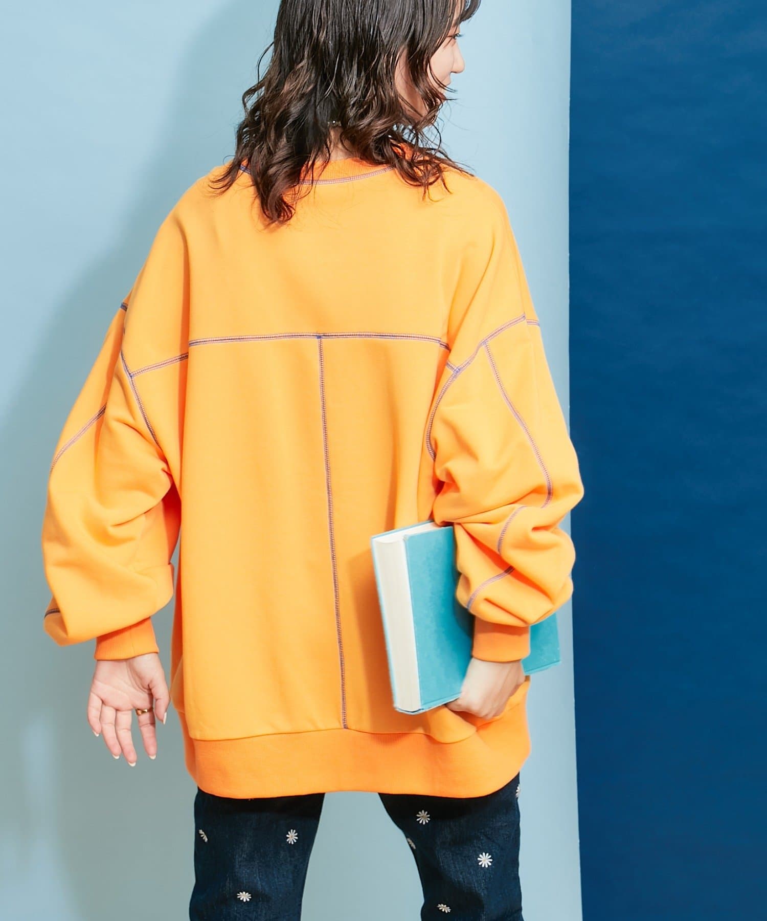 一件時髦的超大套頭衫,有一個醒目的顏色協調的縫製設計。