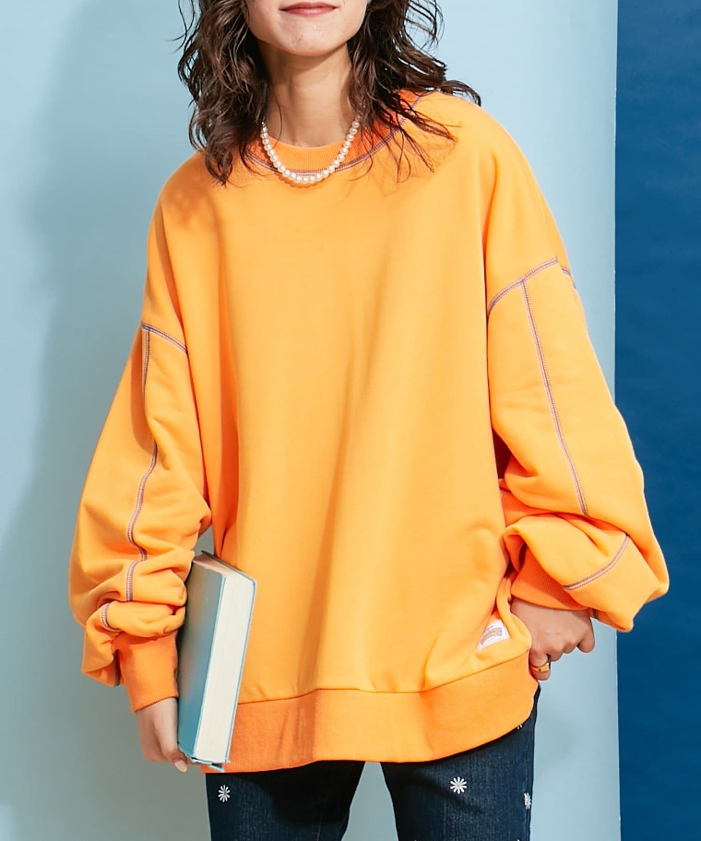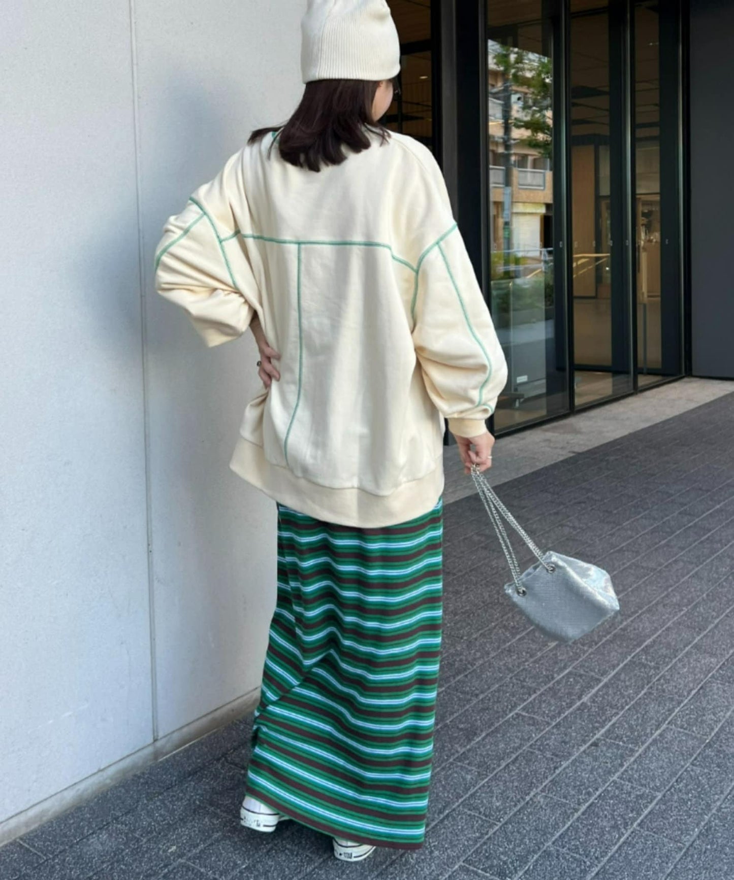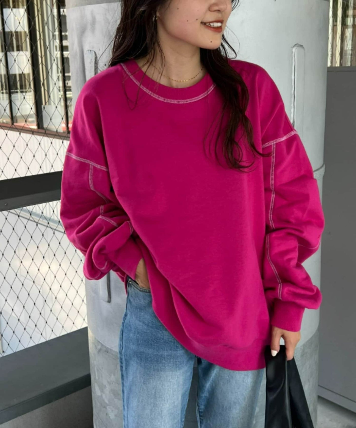 一件時髦的超大套頭衫,有一個醒目的顏色協調的縫製設計。