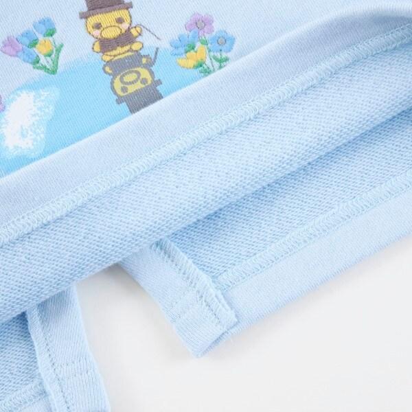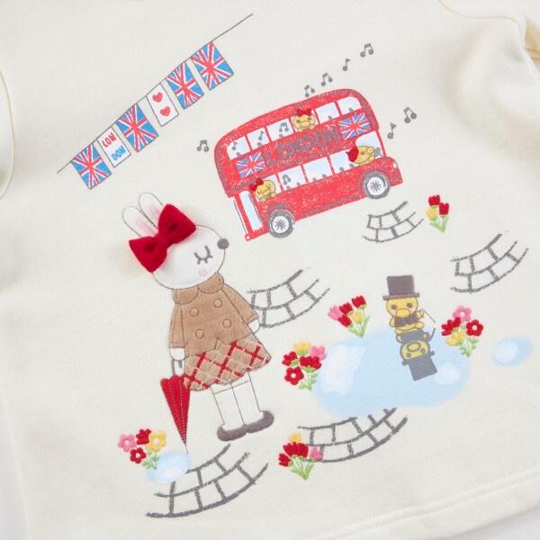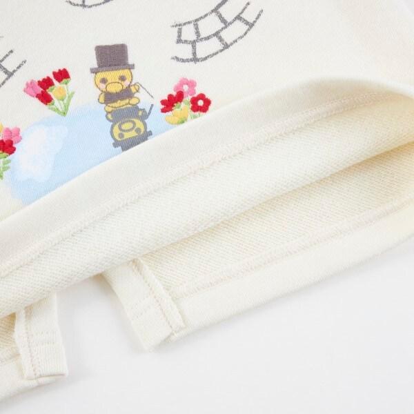 彈出式羊毛內襯運動鞋,印有兔子 MIMI 和鳥鳥 PIOU 的圖案和刺繡。倫敦公交車上的 piou-chan 小鳥非常可愛,讓人感覺溫暖和毛茸茸的。印花觸感柔軟。背面的開關和絲帶是點睛之筆。80-90 厘米的款式有一個左肩開口。
