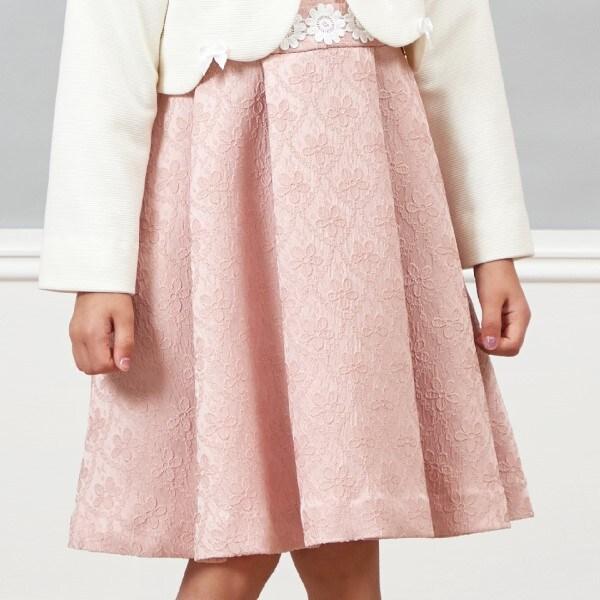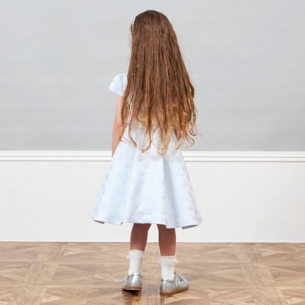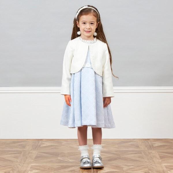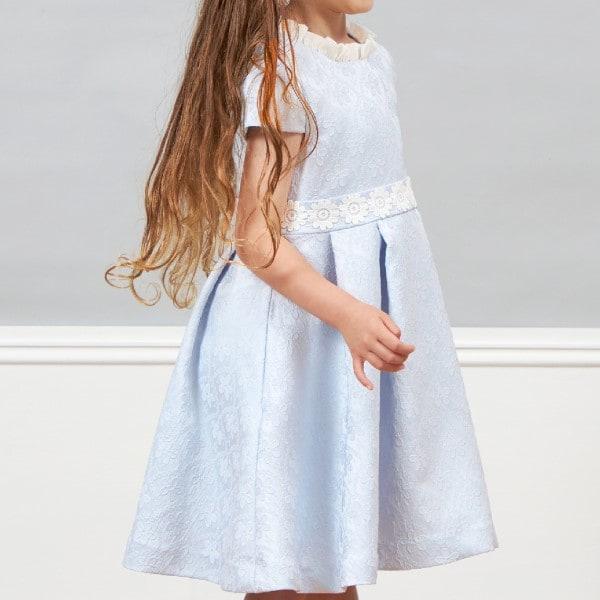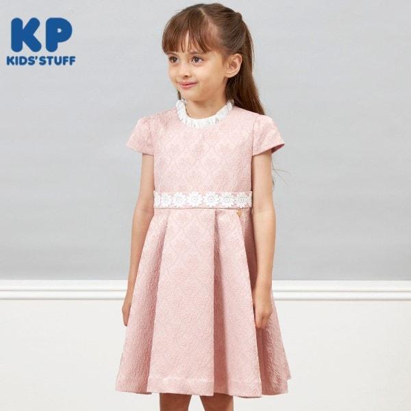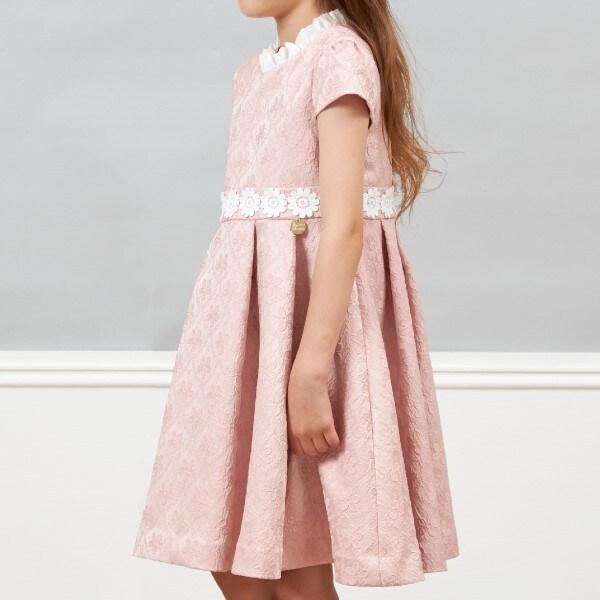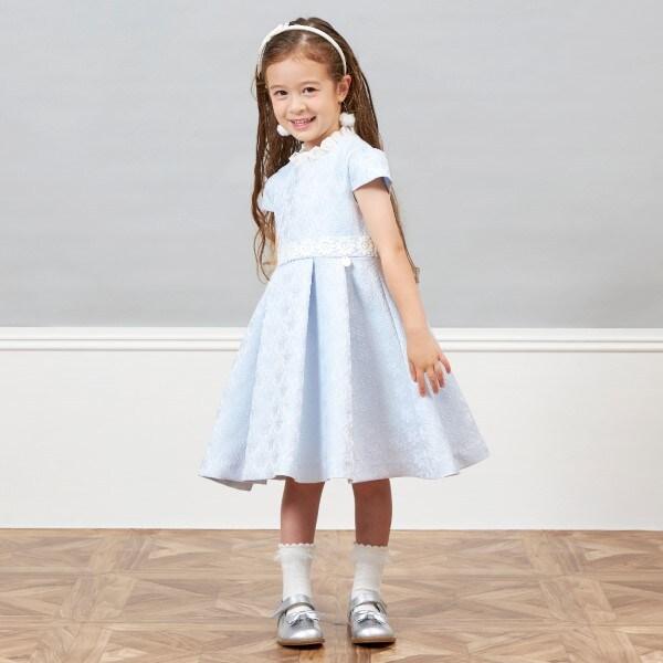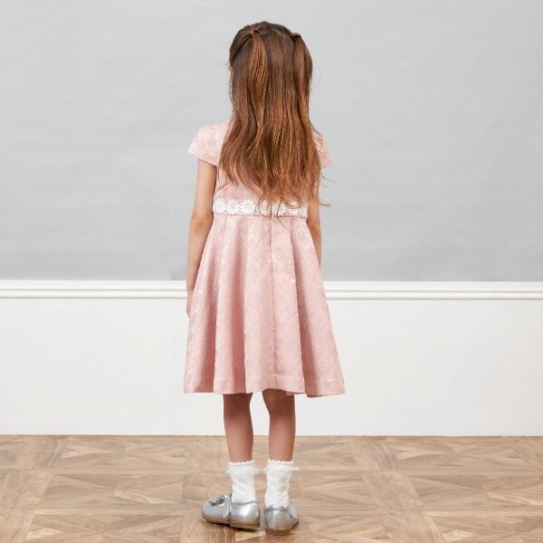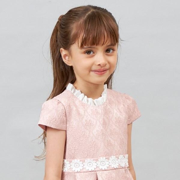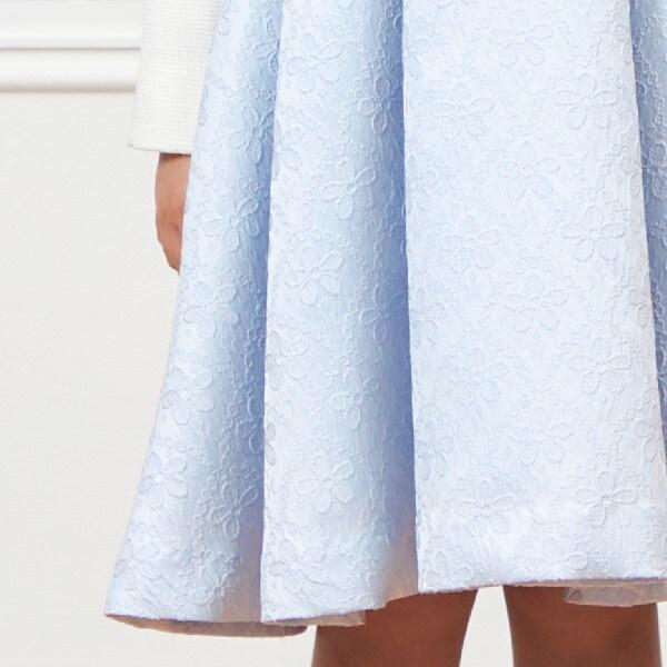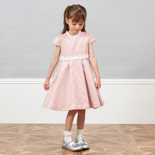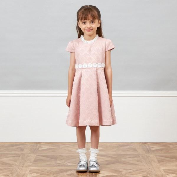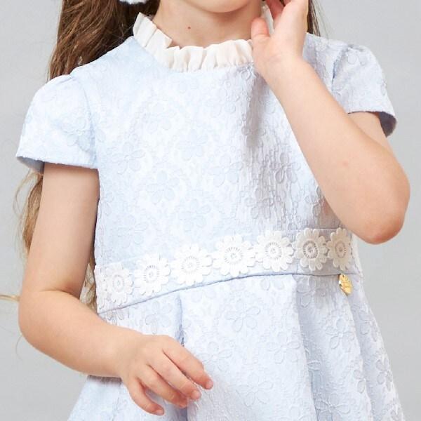 花朵提花面料的連衣裙,適合出席各種場合。寬大的裙襬和腰間的花朵蕾絲給人一種迷人的感覺。雪紡領口的荷葉邊讓它看起來整潔乾淨。粉色和薩克斯色的柔和色調讓你感覺像個公主。