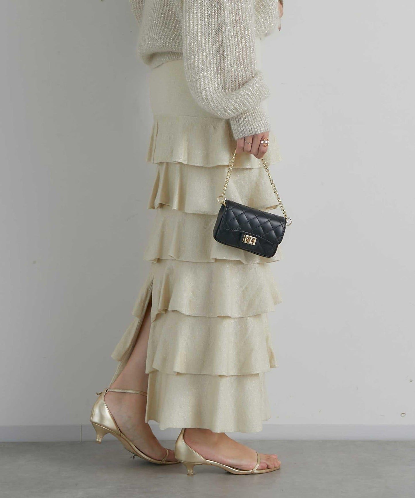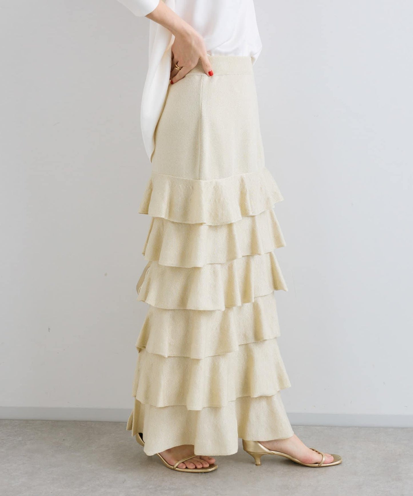 這是一款具有強烈視覺衝擊力的裙子,採用帶有流蘇層疊圖案的薄片針織面料。