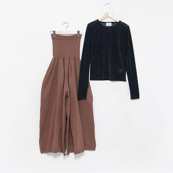 一套褲裝和剪裁縫製套裝,採用光面設計,搭配範圍更廣。