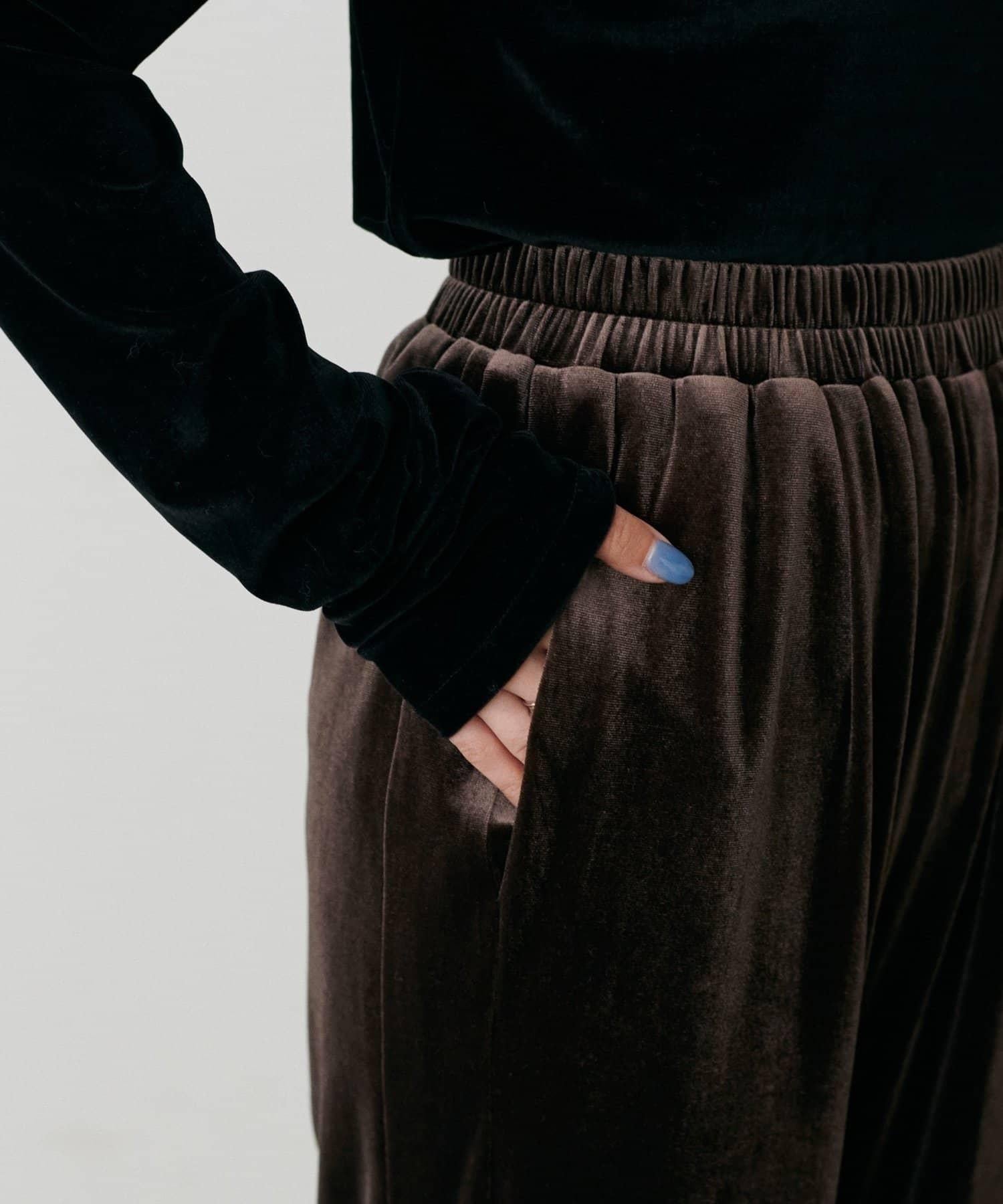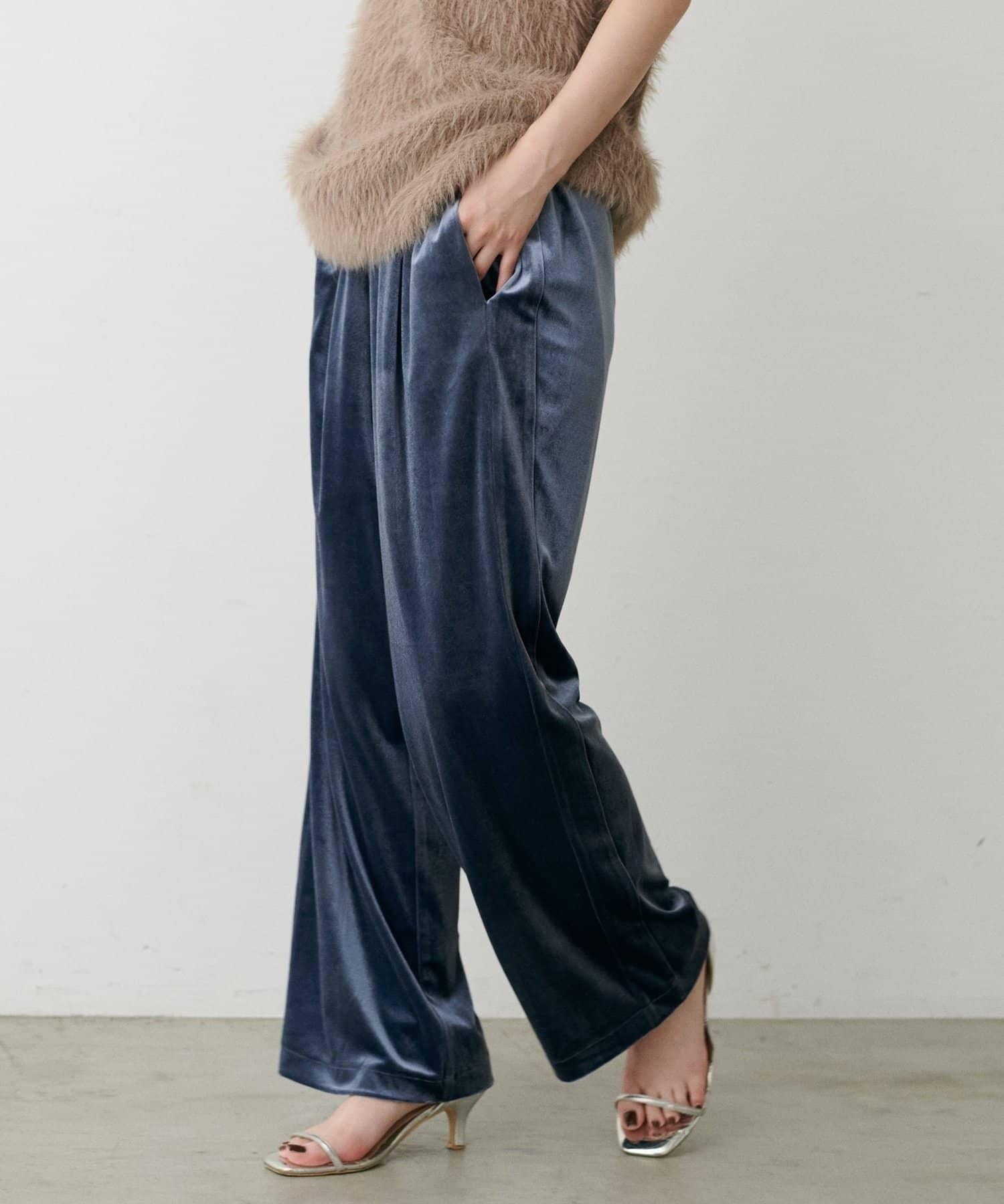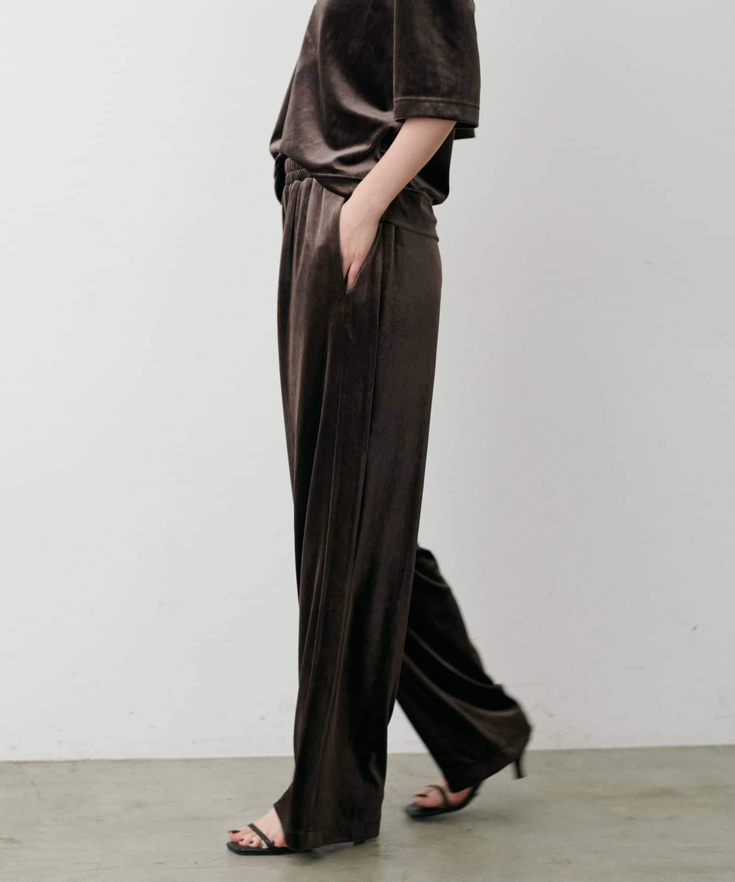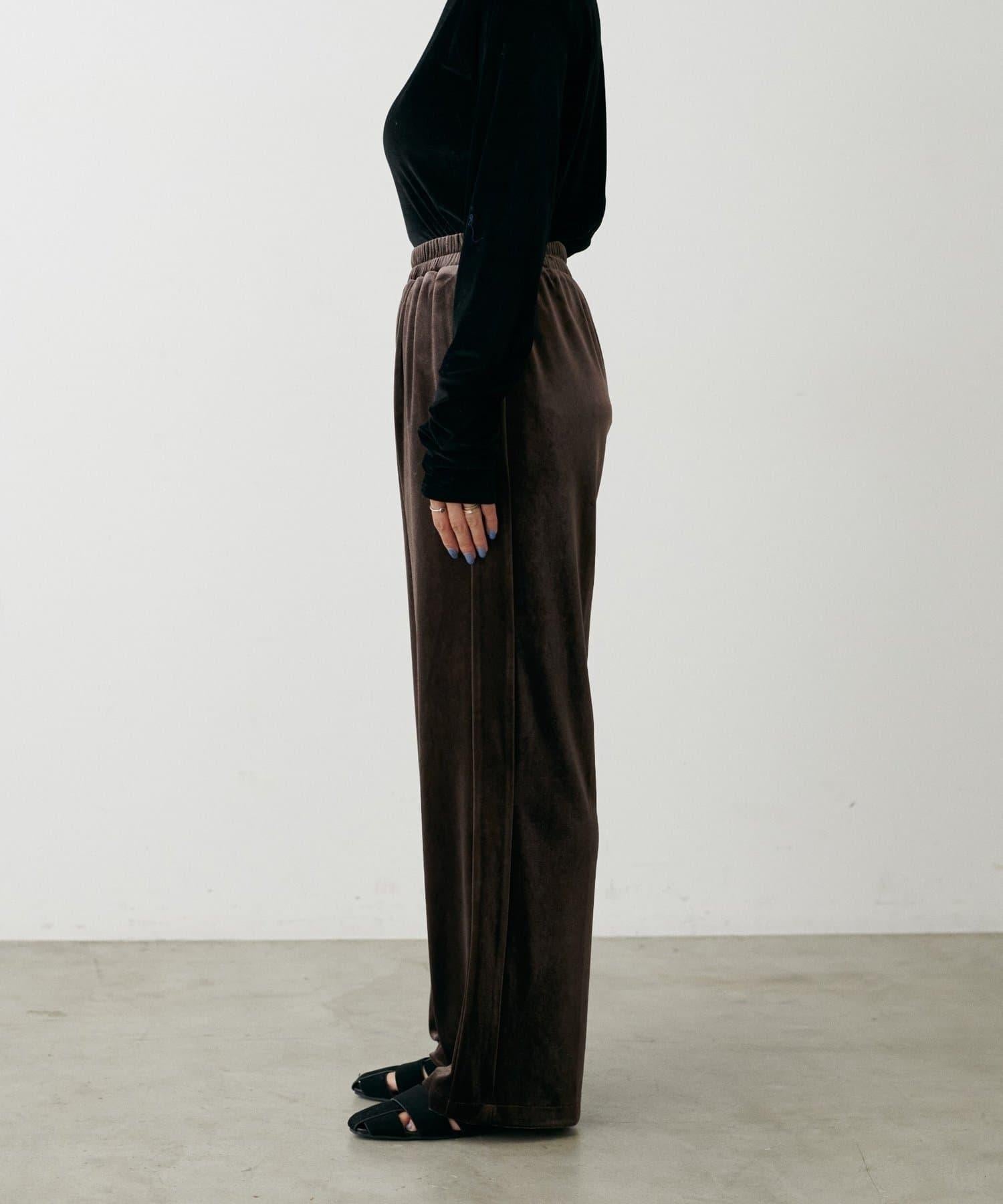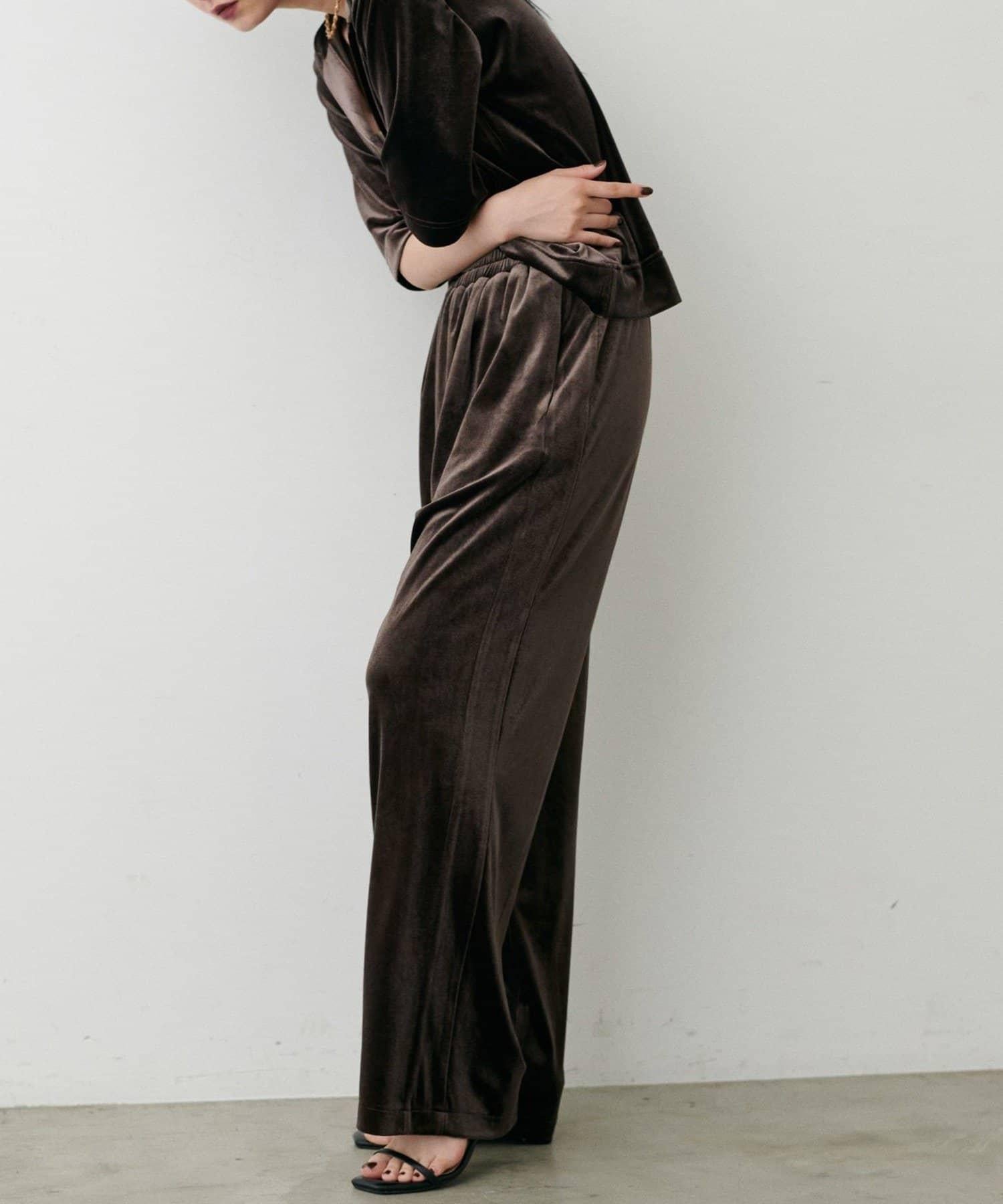 時尚的側線長褲由絲絨製成,帶有優雅的光澤。