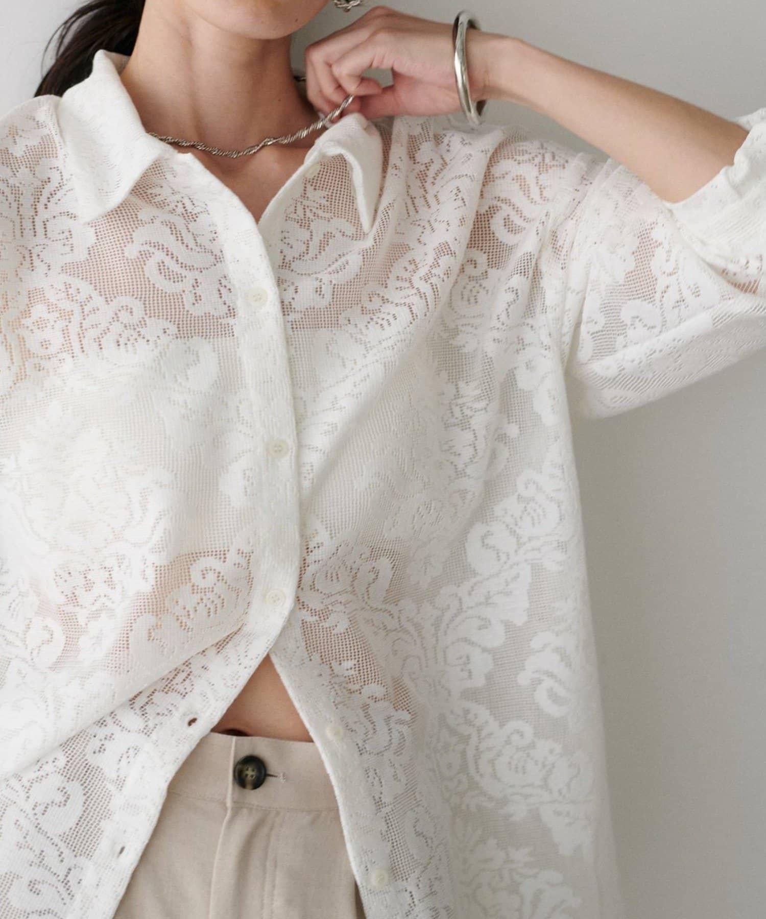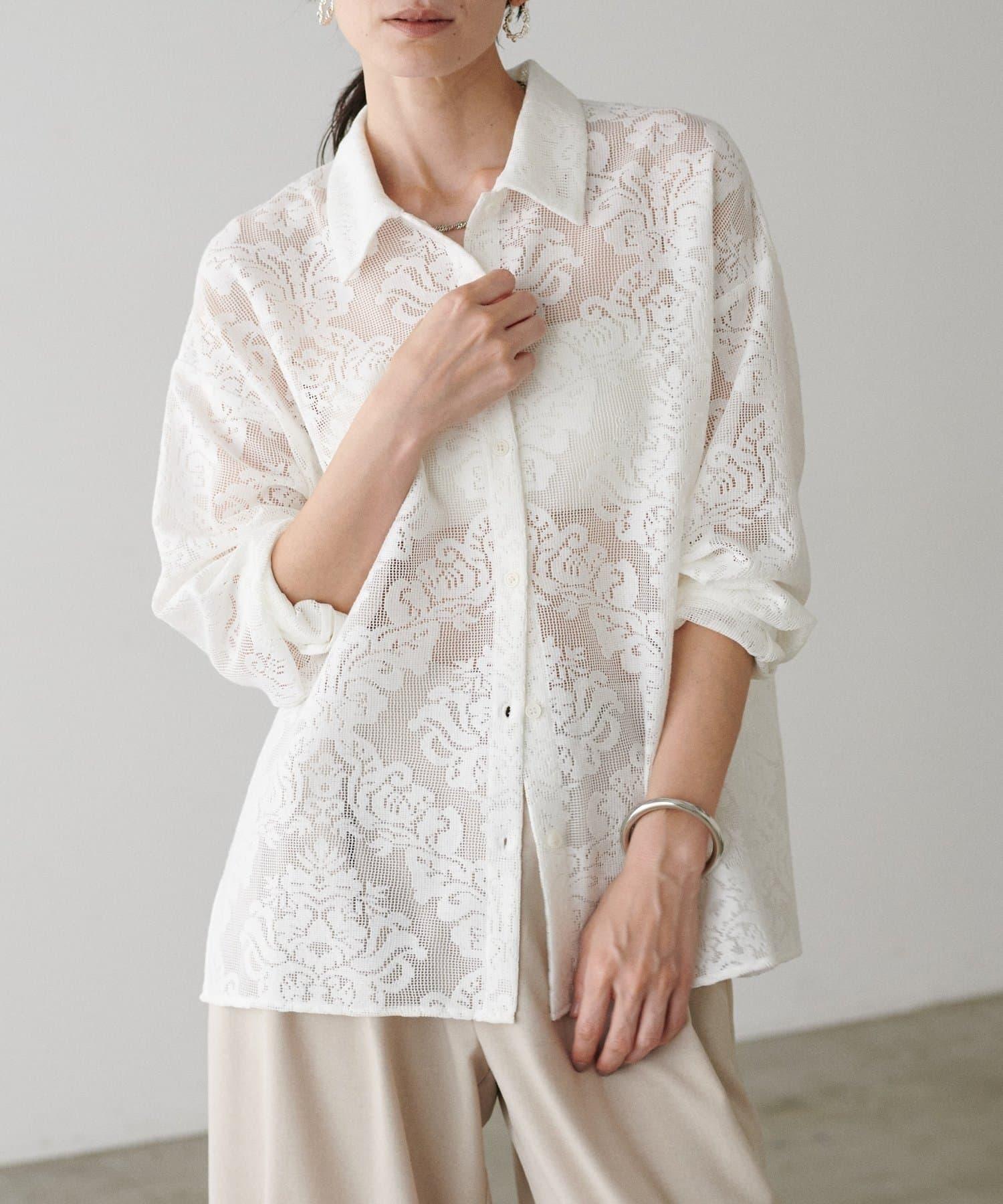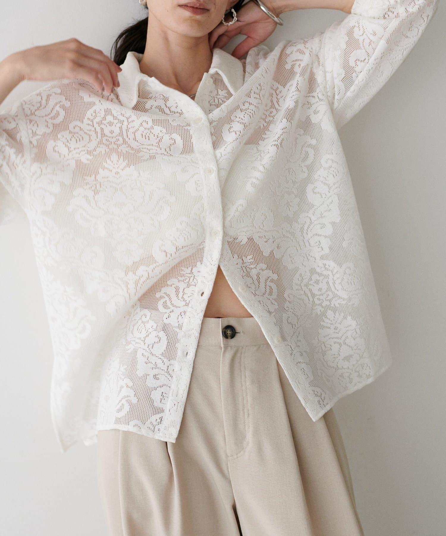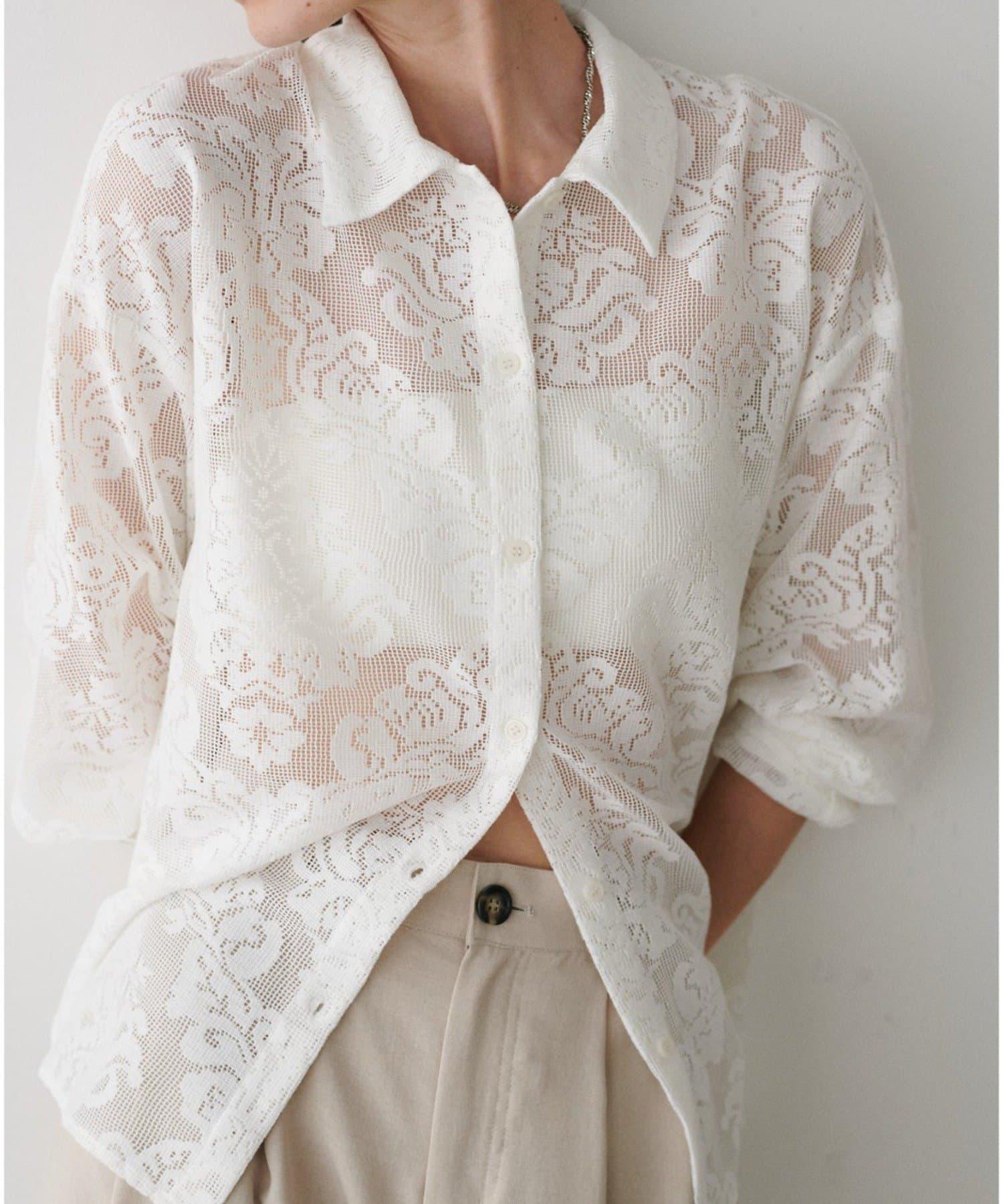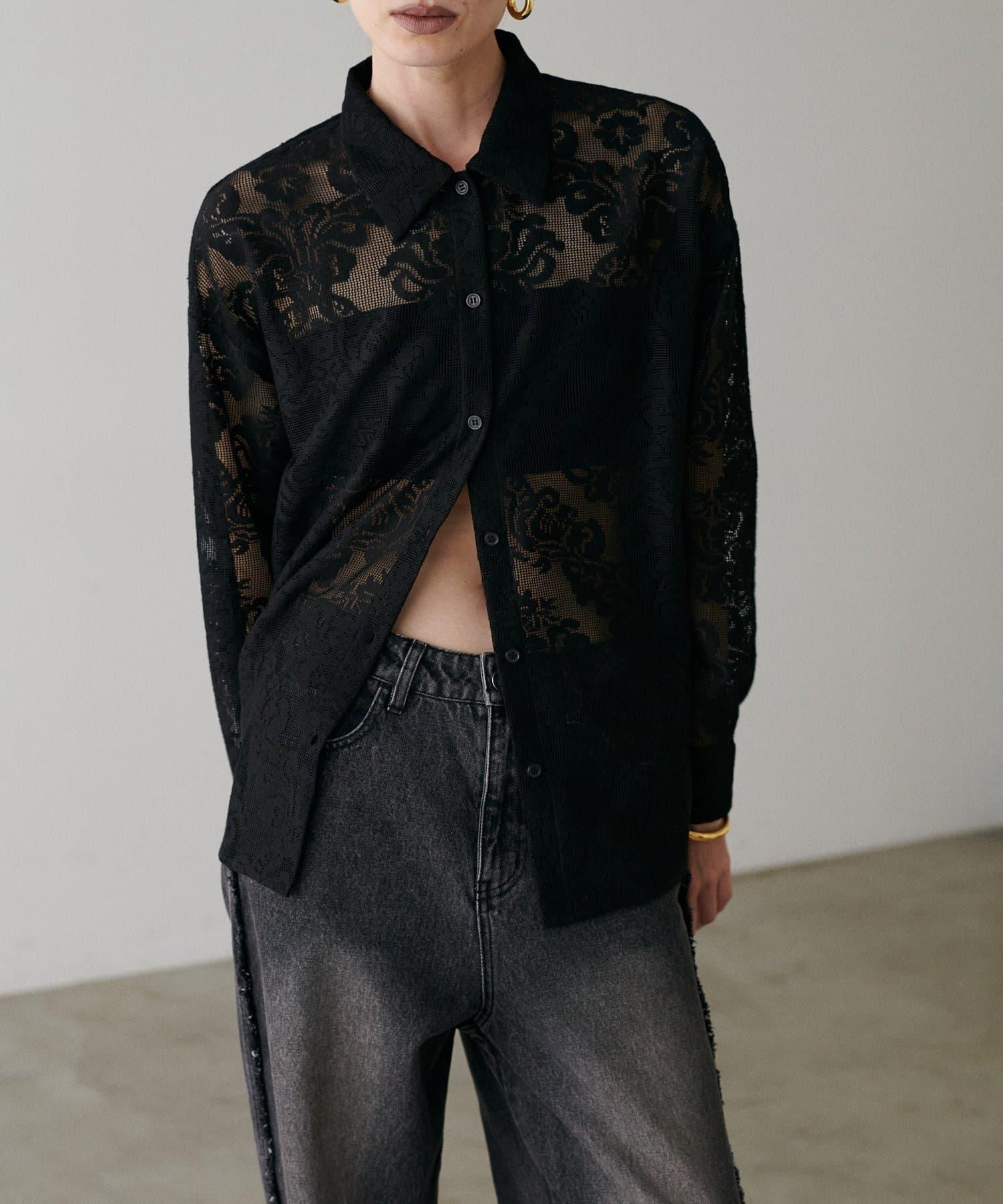 這款蕾絲襯衫採用精美的全蕾絲面料和精緻的花紋圖案剪裁而成,具有透視感。