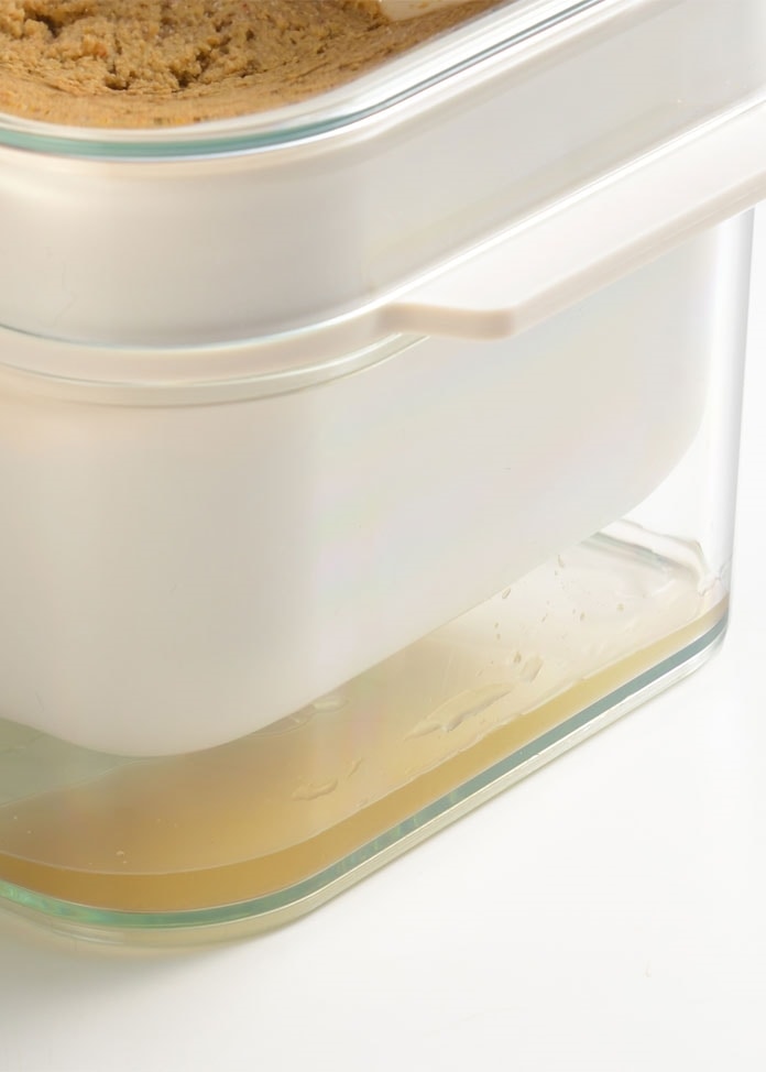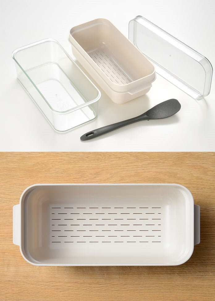 一個用於醃製蔬菜的容器,有一個排水縫隙孔,可以適度地自然排出蔬菜中的水分。 時尚、簡單、緊湊的設計,大小剛好可以容納1公斤的發酵包穀,可以輕鬆地放在冰箱裡。它有一個類似玻璃的透明外容器,因此你可以立即檢查麩皮的狀態和釋放的水分。蔬菜中多餘的水通過內部容器的縫隙孔自然排出外部容器。