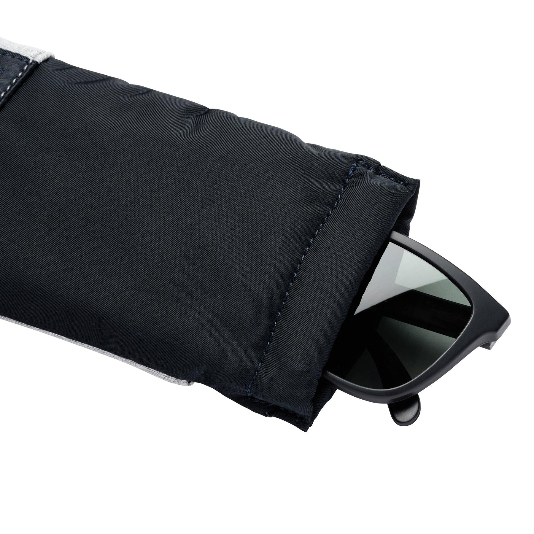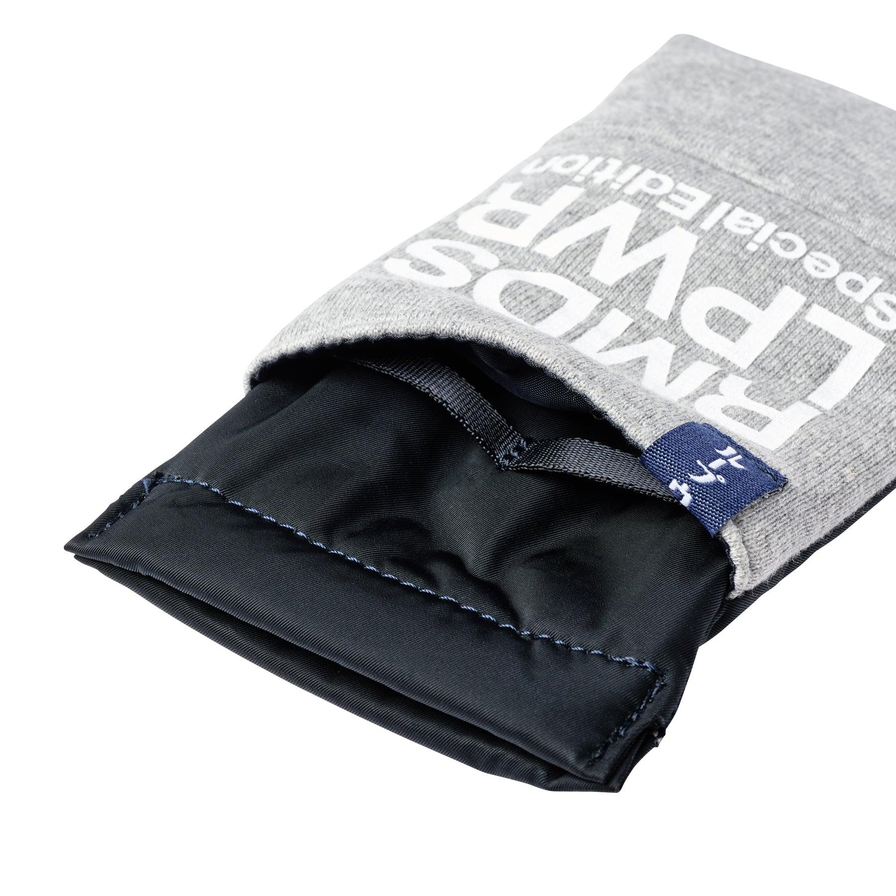 軟質眼鏡盒,厚度較低,便於攜帶。單手即可打開和關閉的彈簧隔層。配有 LOOPWHEELER x RAMIDUS 徽標頸帶。