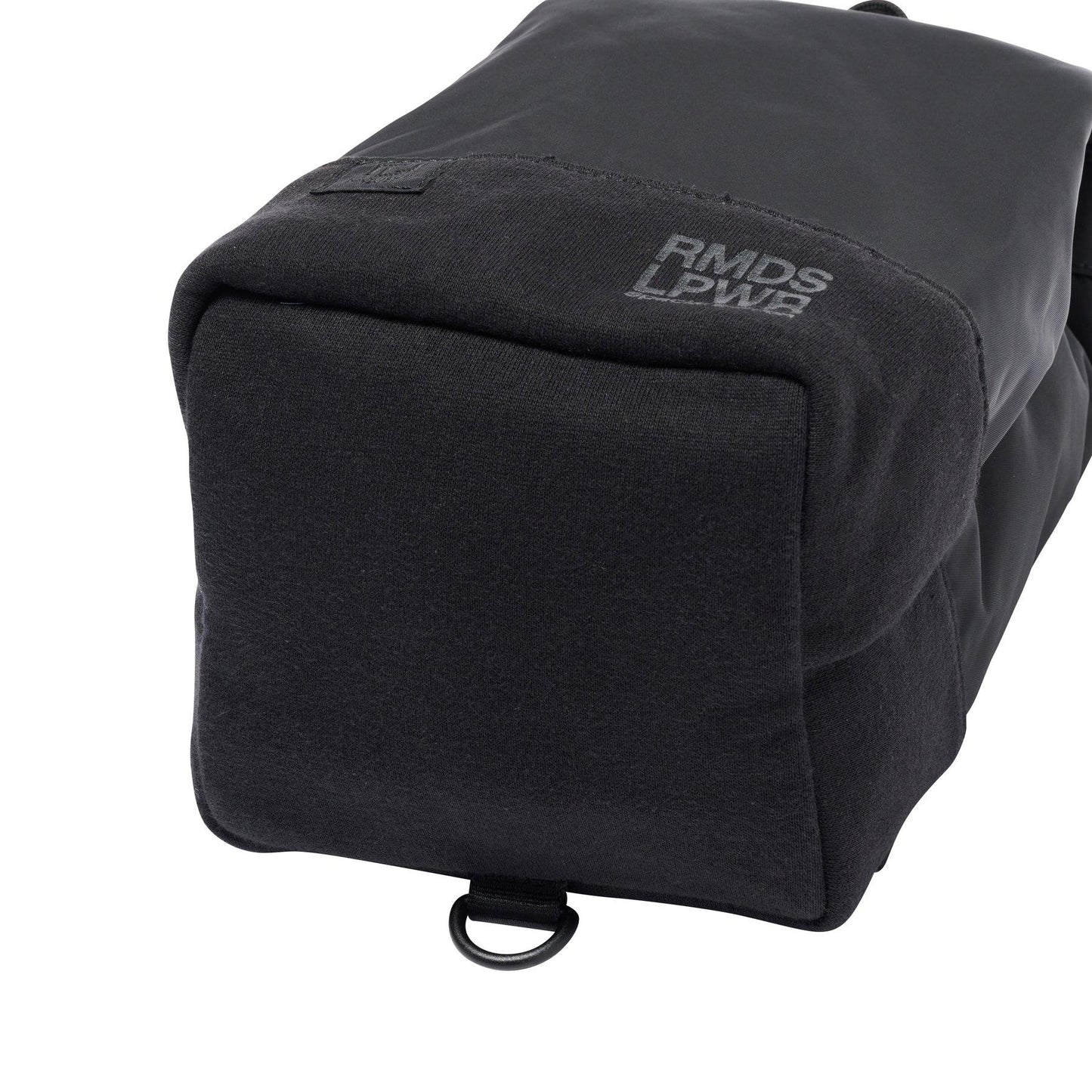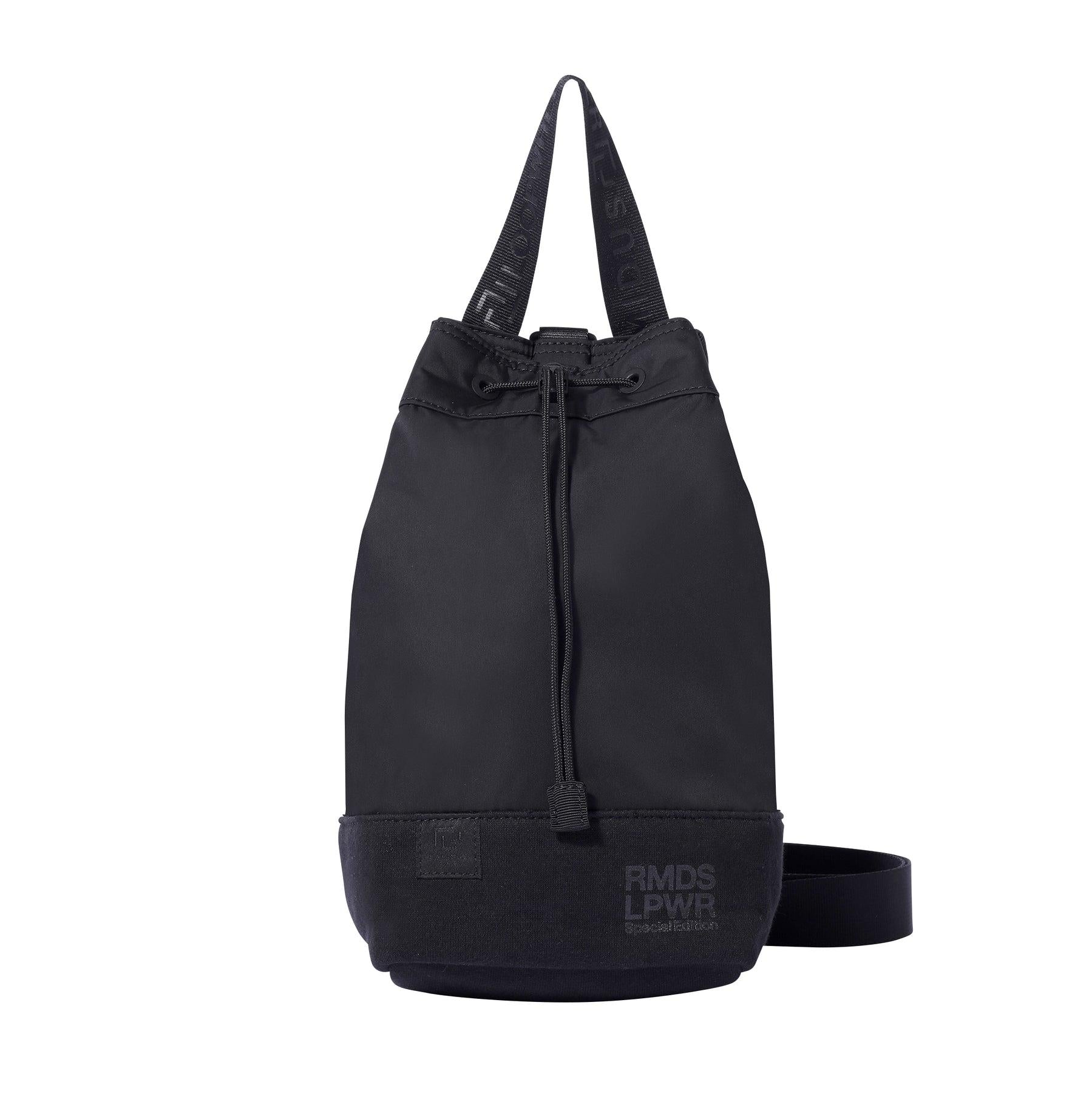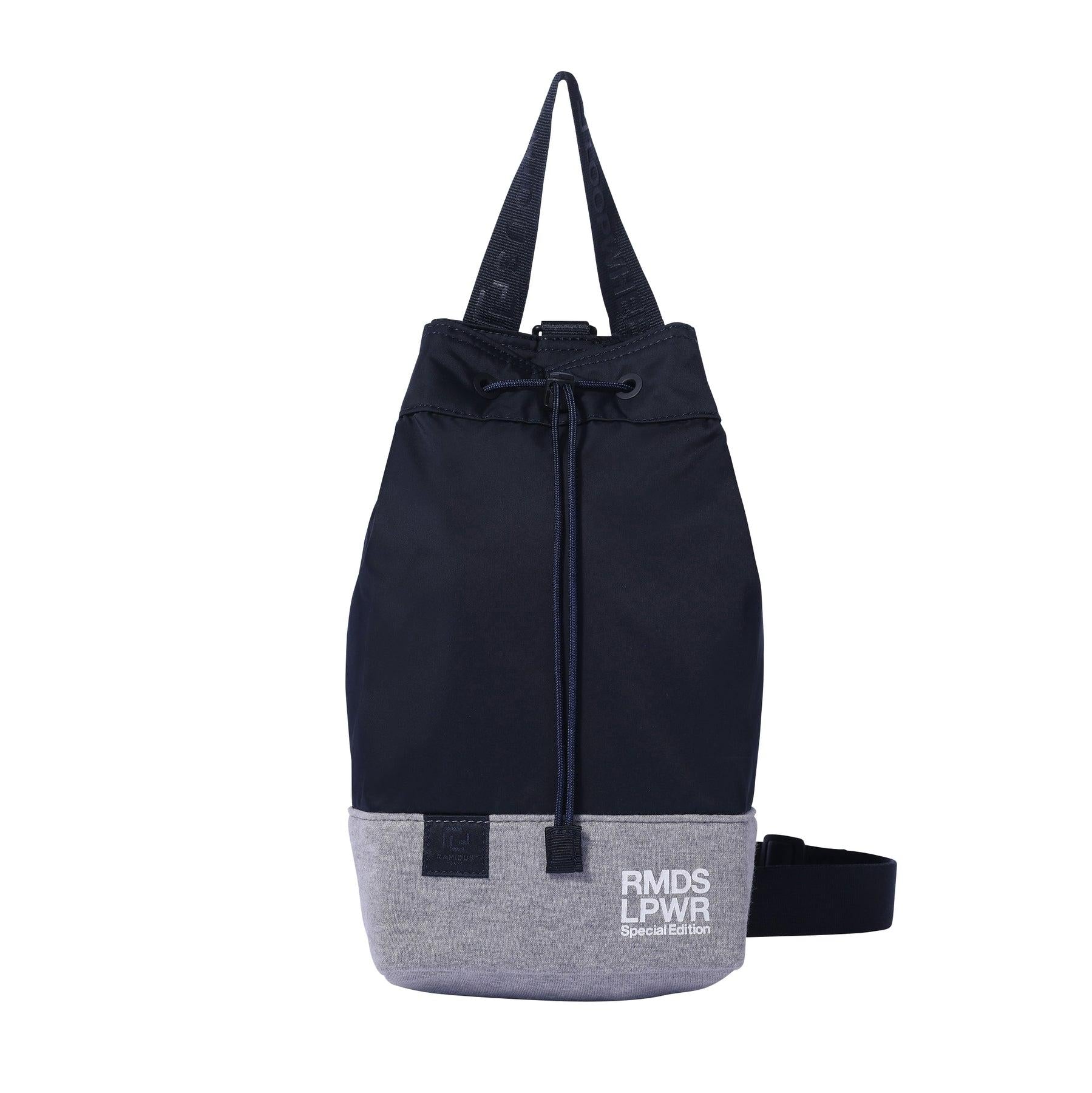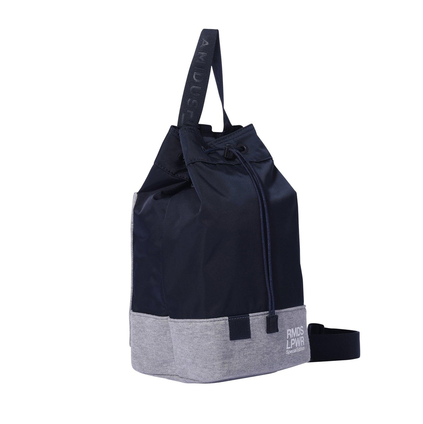 雙向設計的揹包,可用作拉繩包或肩袋。容量足夠大,可容納一個塑料瓶和一個長錢包。抓環帶壓印有兩個品牌的標誌,象徵著 LOOPWHEELER 的合作,並配有印有 LOOPWHEELER x RAMIDUS 標誌的頸帶。