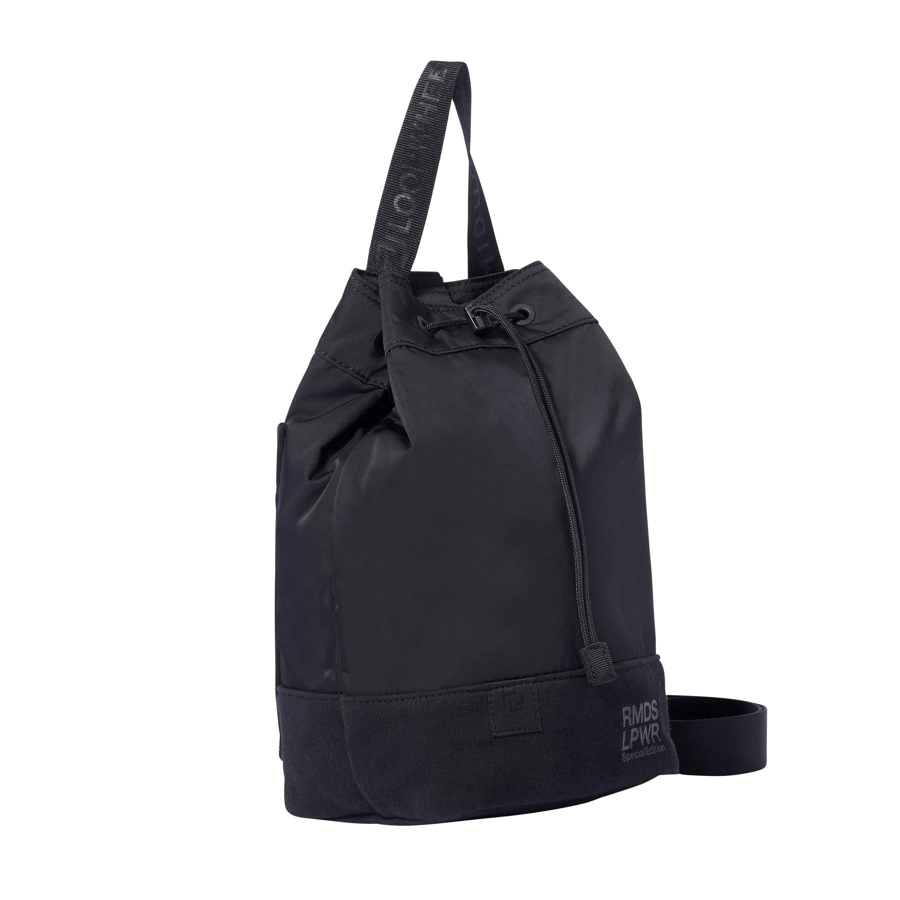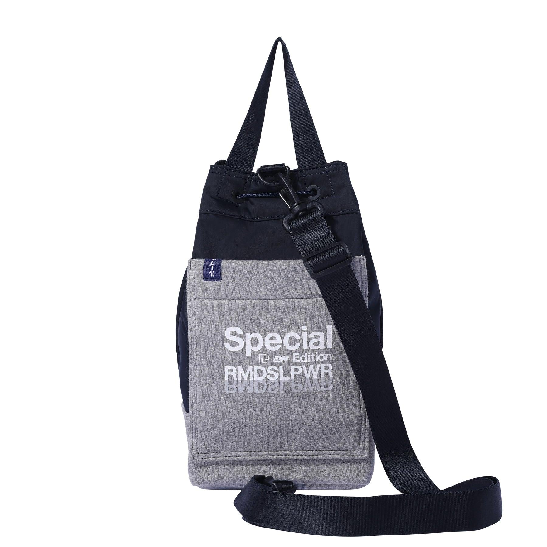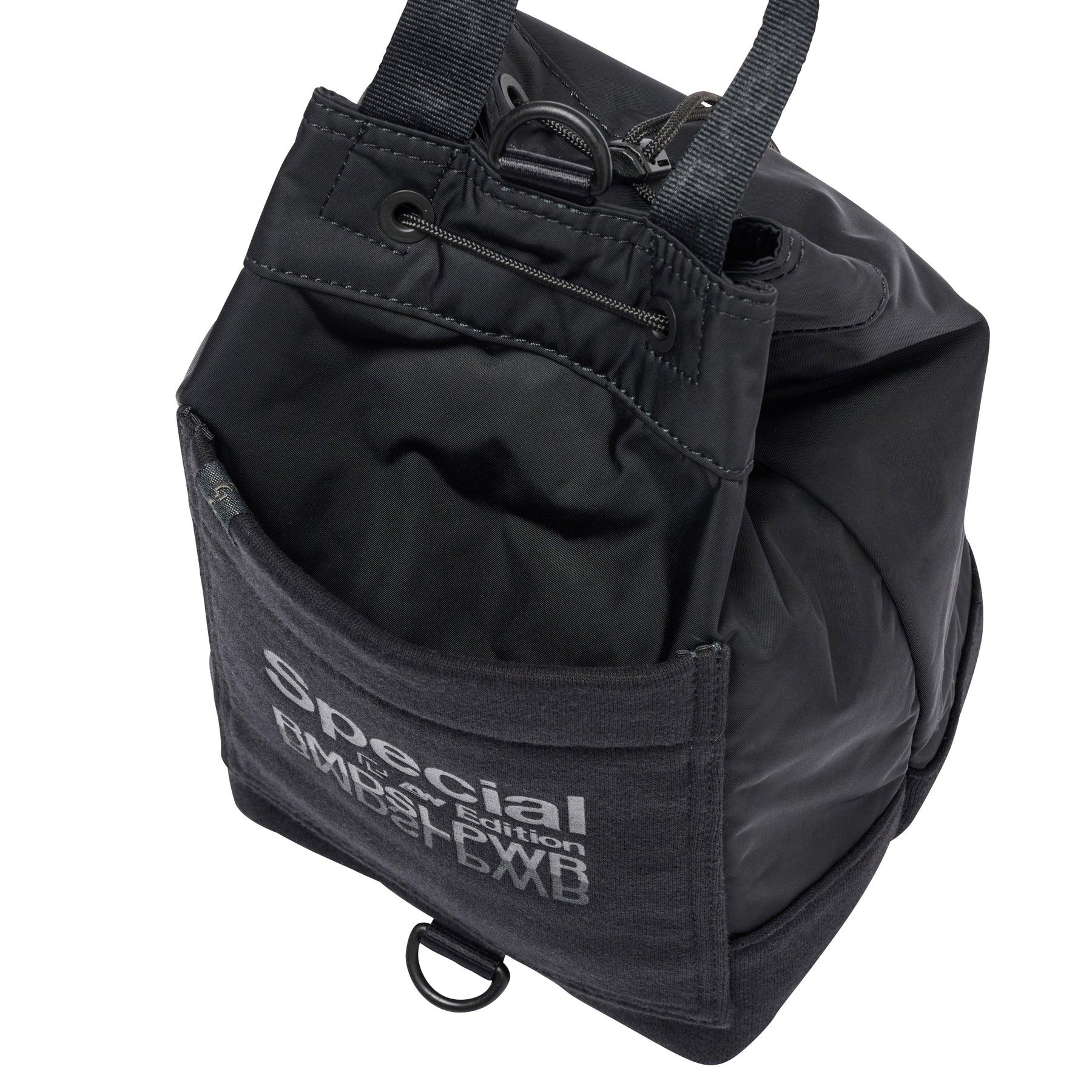 雙向設計的揹包,可用作拉繩包或肩袋。容量足夠大,可容納一個塑料瓶和一個長錢包。抓環帶壓印有兩個品牌的標誌,象徵著 LOOPWHEELER 的合作,並配有印有 LOOPWHEELER x RAMIDUS 標誌的頸帶。