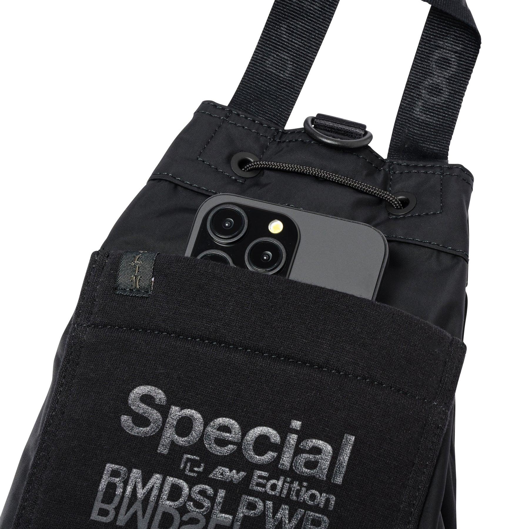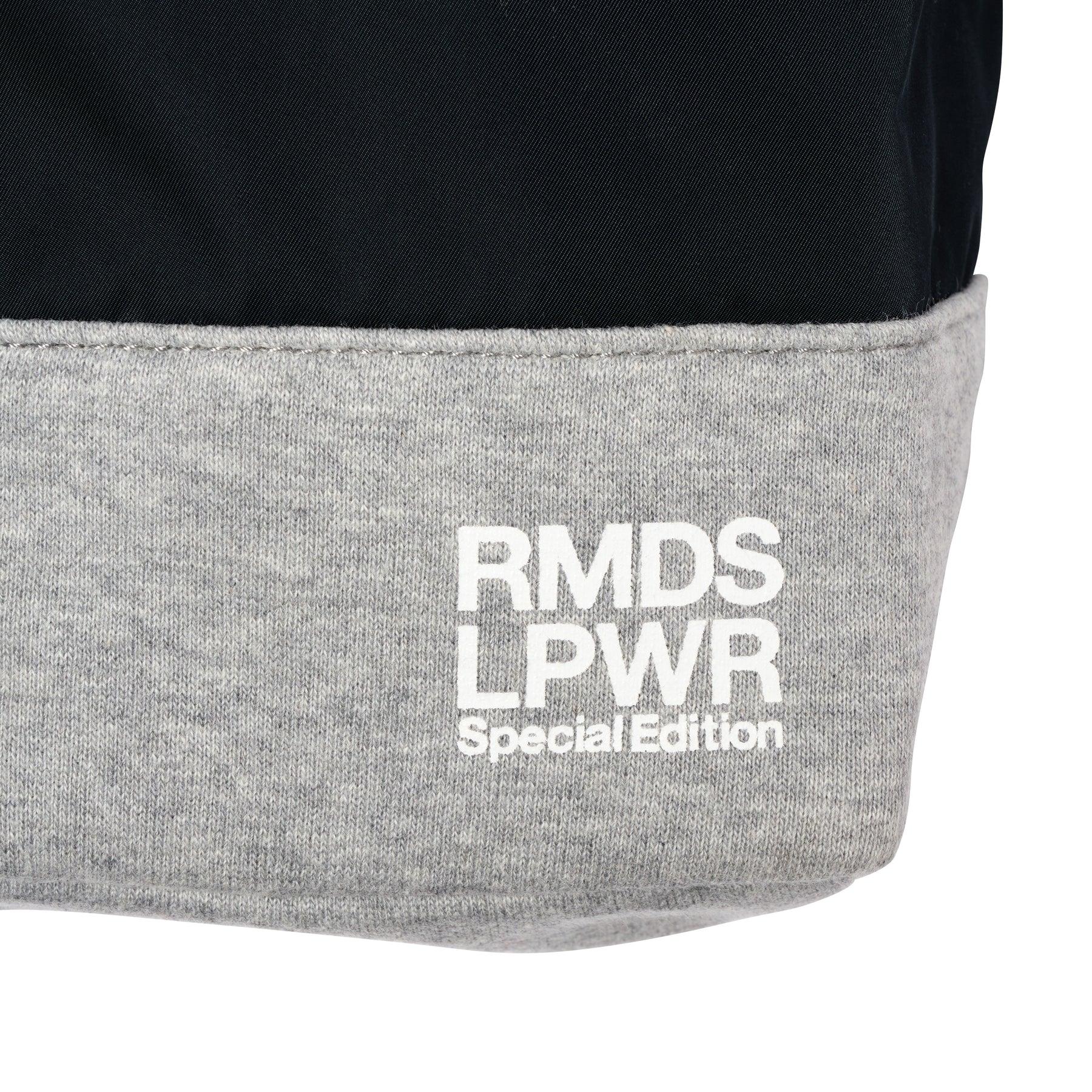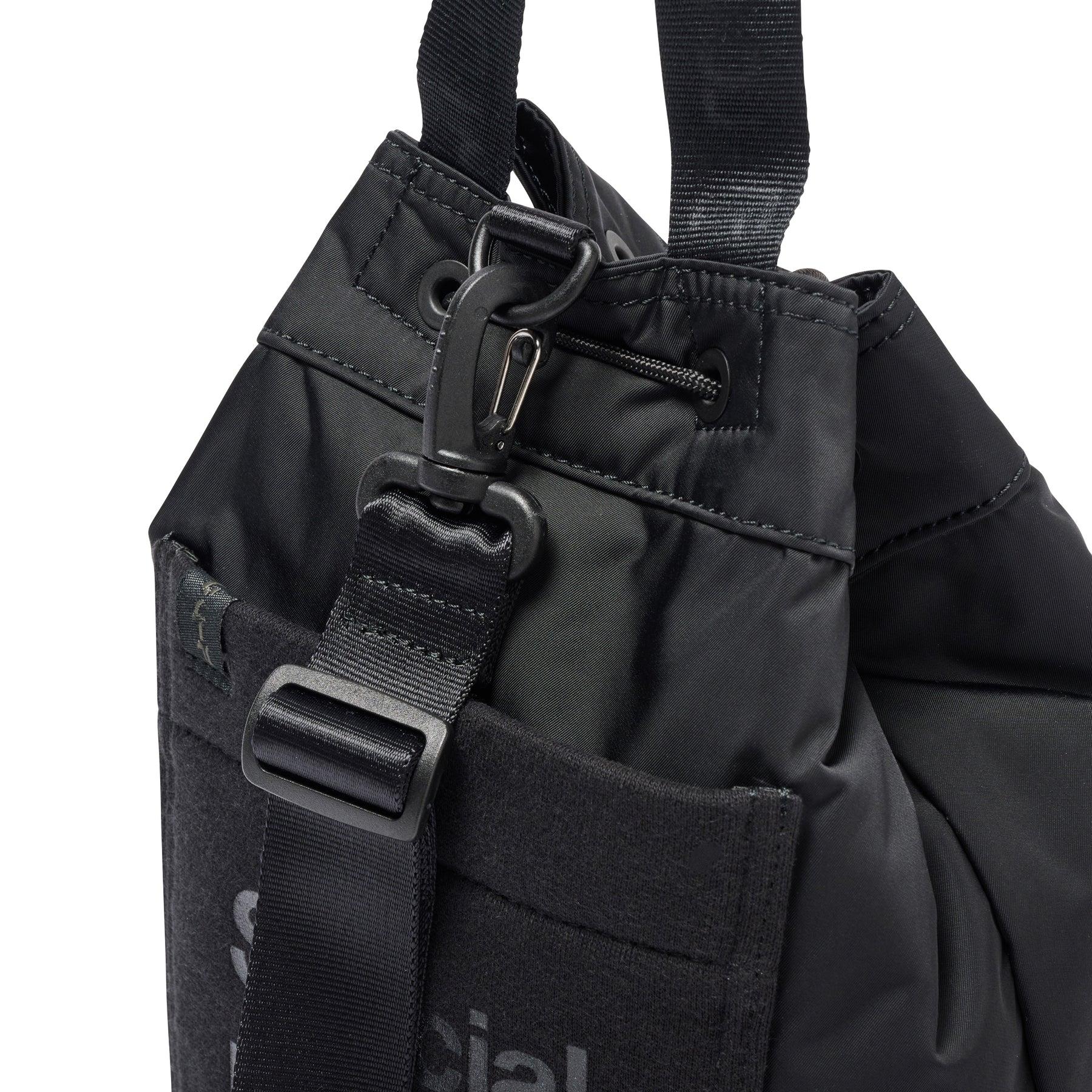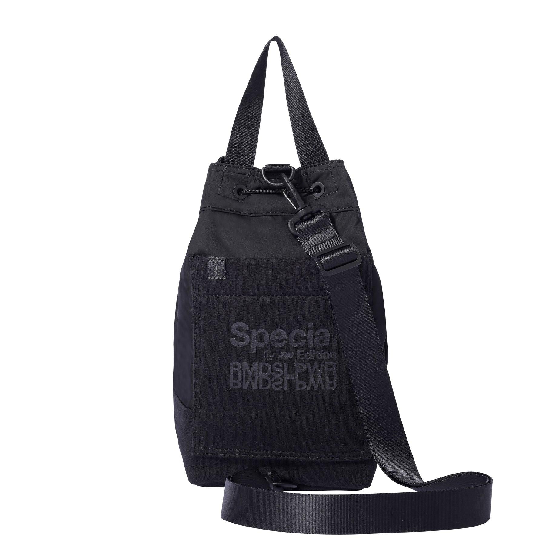 雙向設計的揹包,可用作拉繩包或肩袋。容量足夠大,可容納一個塑料瓶和一個長錢包。抓環帶壓印有兩個品牌的標誌,象徵著 LOOPWHEELER 的合作,並配有印有 LOOPWHEELER x RAMIDUS 標誌的頸帶。