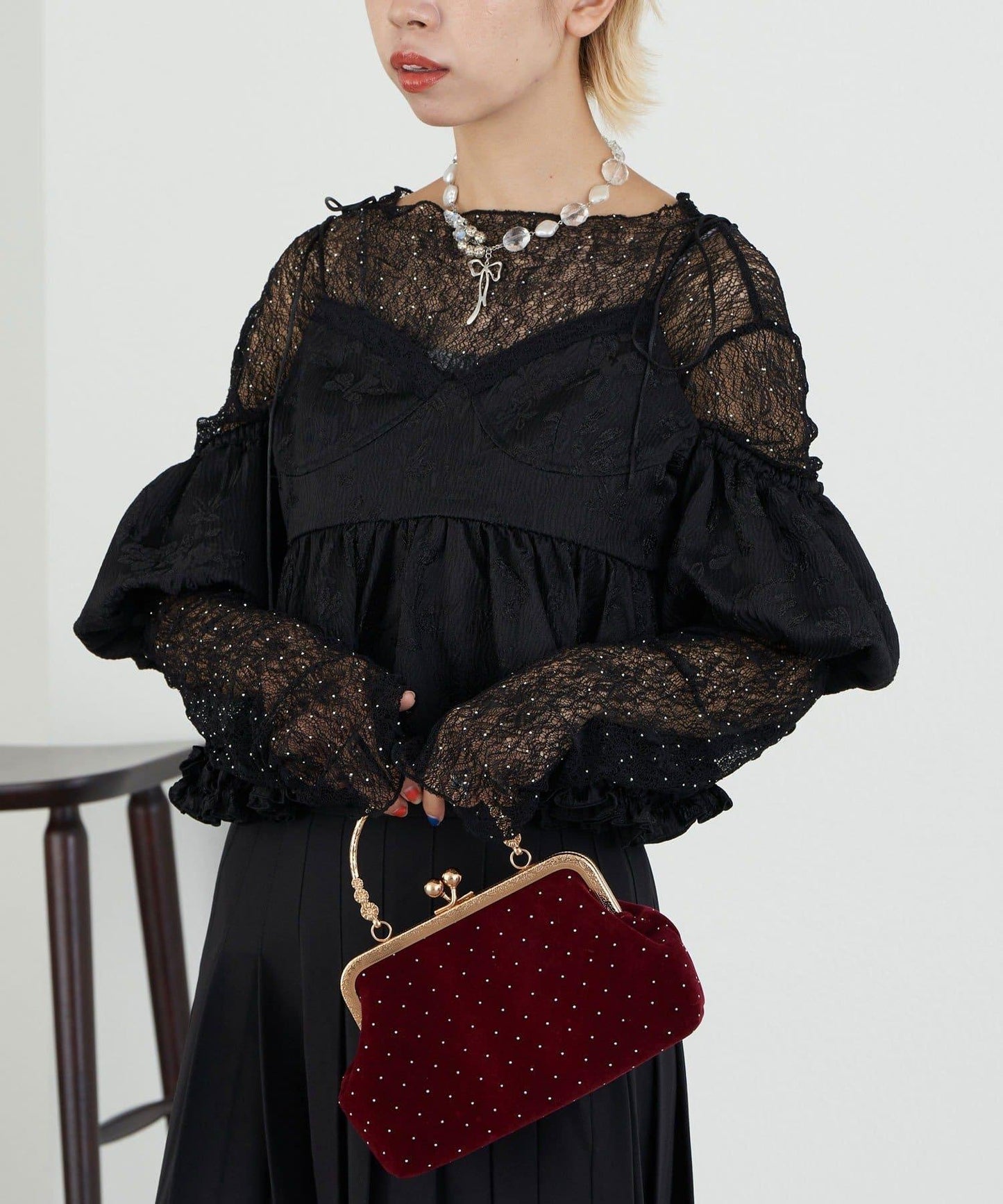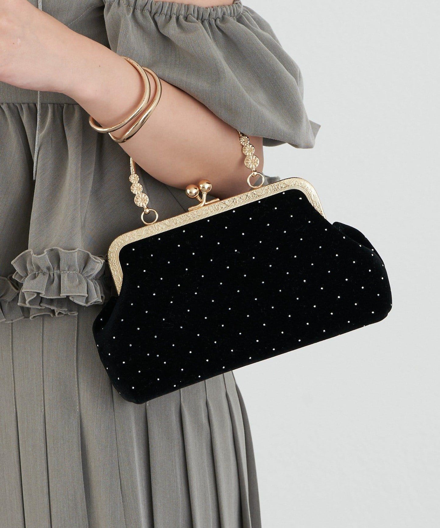 像小點一樣排列的鉚釘突出了這款包的特點,使其看起來更有古典韻味。
