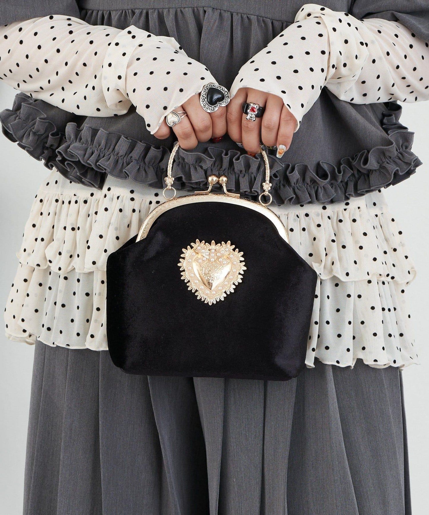 這款金屬心扣包充滿古典氣息。