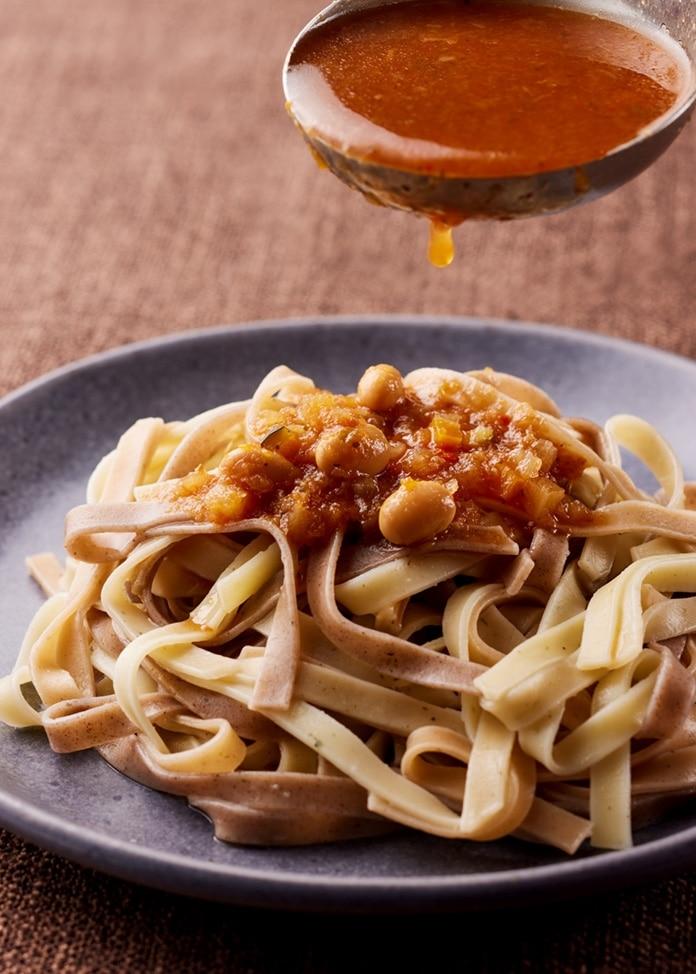 小雜糧麵條 濃稠的麵條充滿了蔬菜、大米麴和小雜糧的鮮美,與濃湯交織在一起。