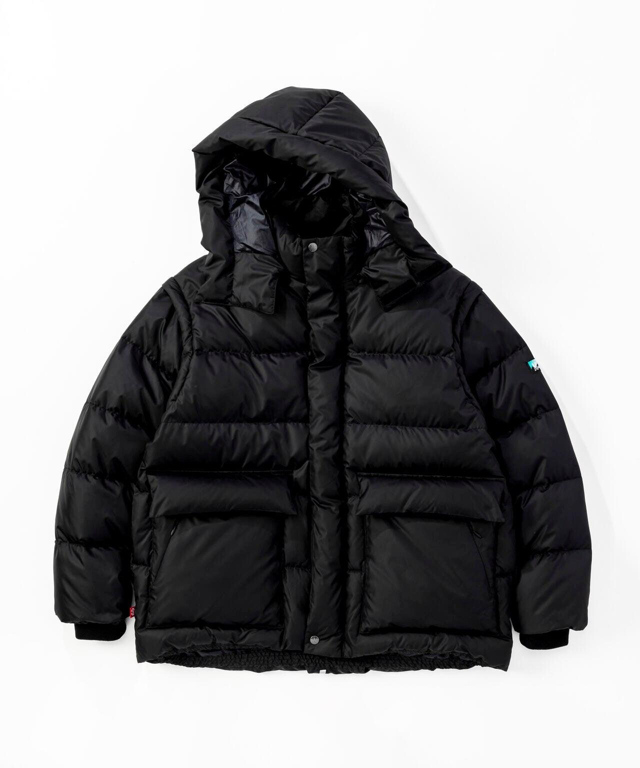 MANASTASH / MANASTASH / 4WAY DOWN JACKET / 4WAY DOWN JACKET 材質 - 外層面料採用回收滌綸材料。填充物為回收羽絨。內襯由尼龍製成。外層和內襯均由柔軟材料製成,使這款羽絨服不僅環保,而且穿著舒適。特點 - 連帽和袖子可拆卸,因此可以有四種不同的穿法。兜帽採用立體制作,可在前部用尼龍搭扣固定。兜帽採用立體設計,前部可以用尼龍搭扣固定,還可以用抽繩進一步收緊,非常保暖。口袋上有一個可以從上方放入的翻蓋口袋,還有一個帶對角拉鍊的暖手口袋,因此它在防寒和儲物能力方面都有很好的表現。右側口袋有鑰匙扣。