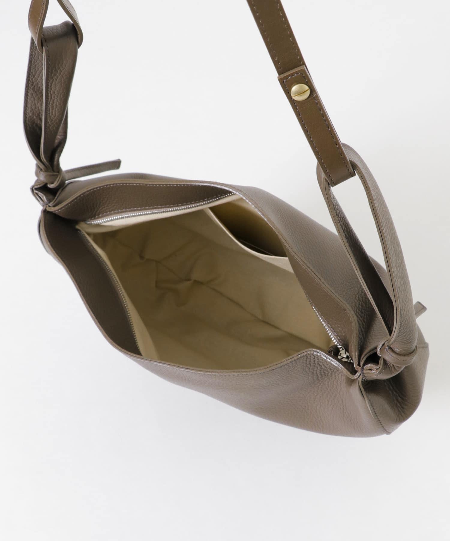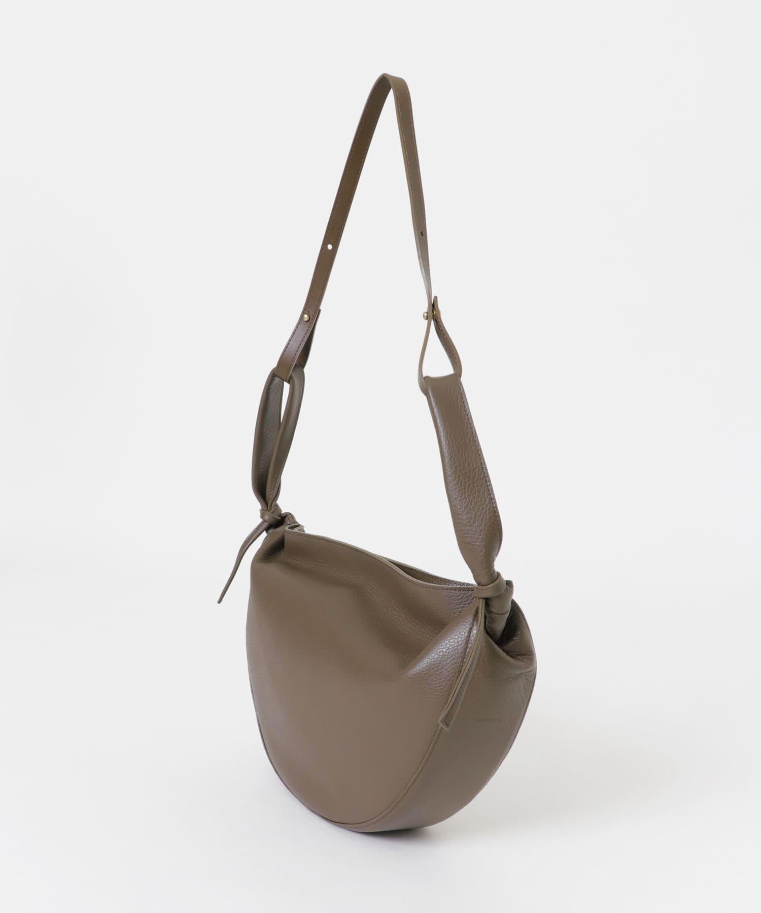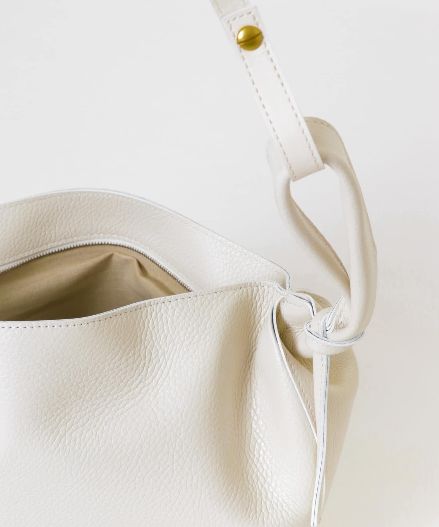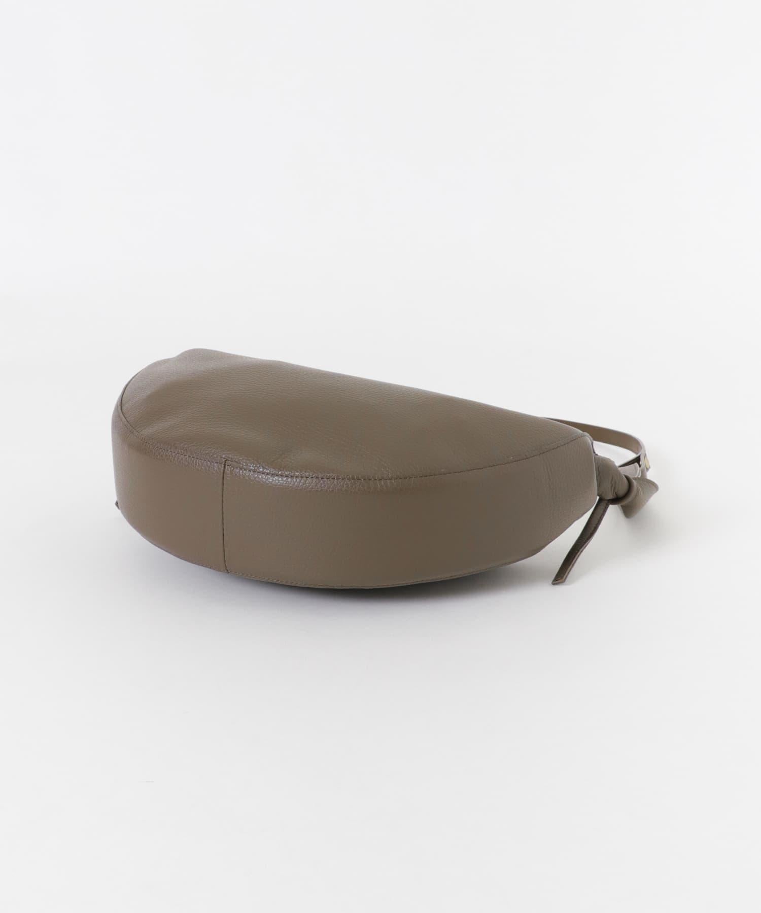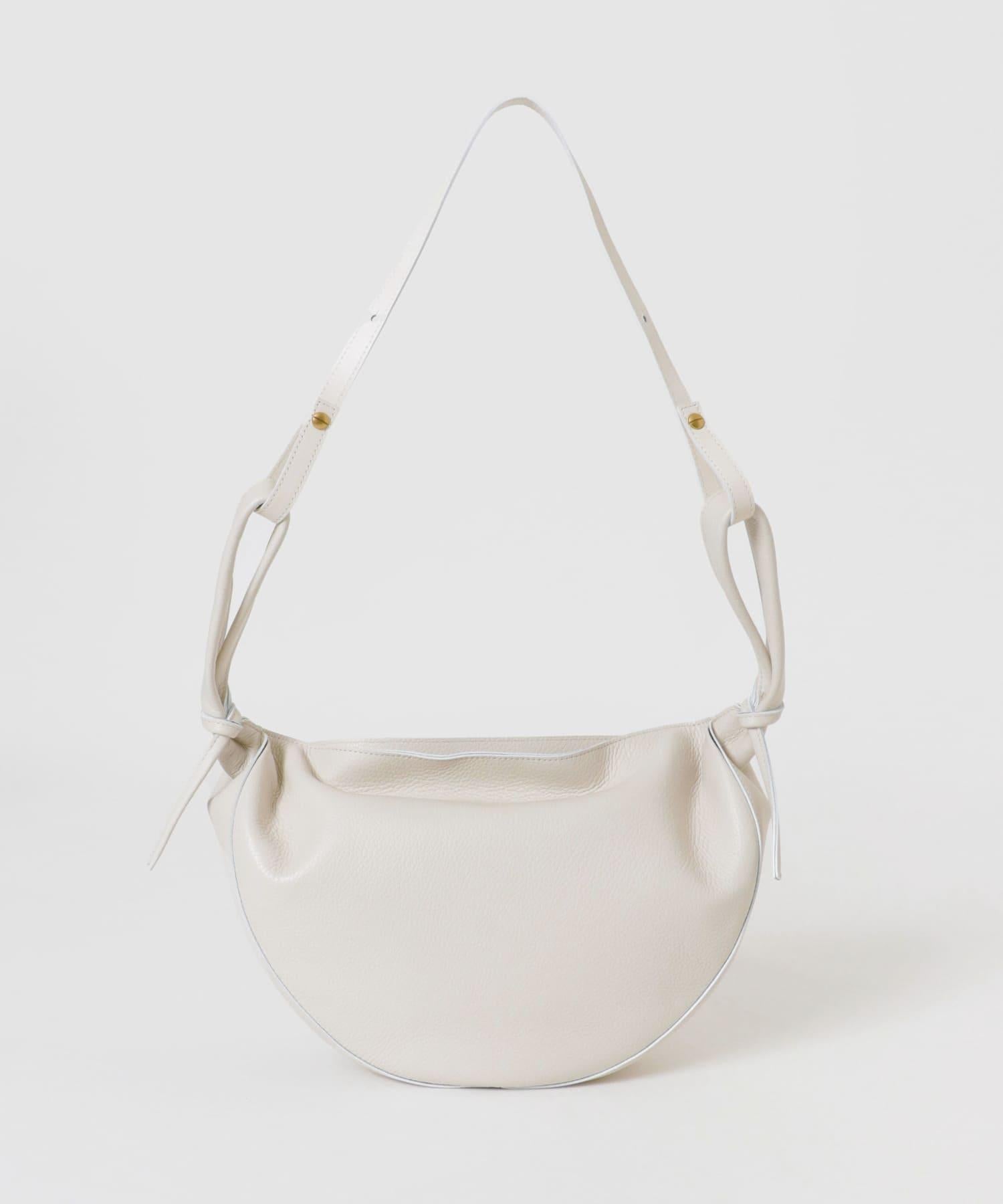 繫上可拆卸的肩帶後,包包可以像貼身包一樣斜背,可以像 "半月形 "包一樣隨意攜帶;但如果卸下肩帶,將兩側的環形提手繞過手腕,包包就可以像 "半月形 "包一樣攜帶。如果卸下肩帶,通過兩側的環形提手將包包套在手腕處,包身就會變得緊湊圓潤,使包包看起來更有女人味。