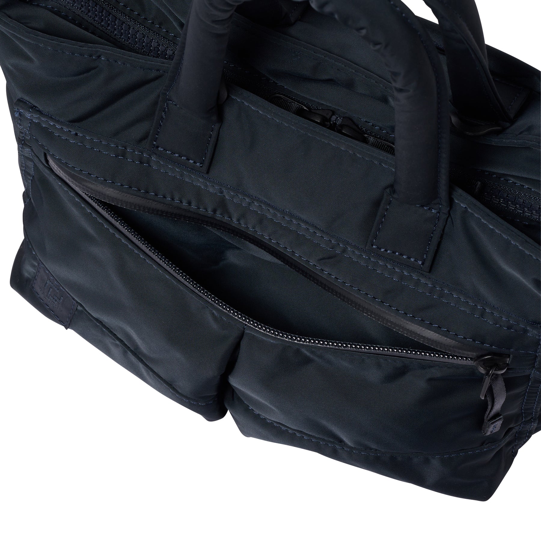 內部:拉鍊口袋、網狀插槽口袋和品牌名稱標籤。