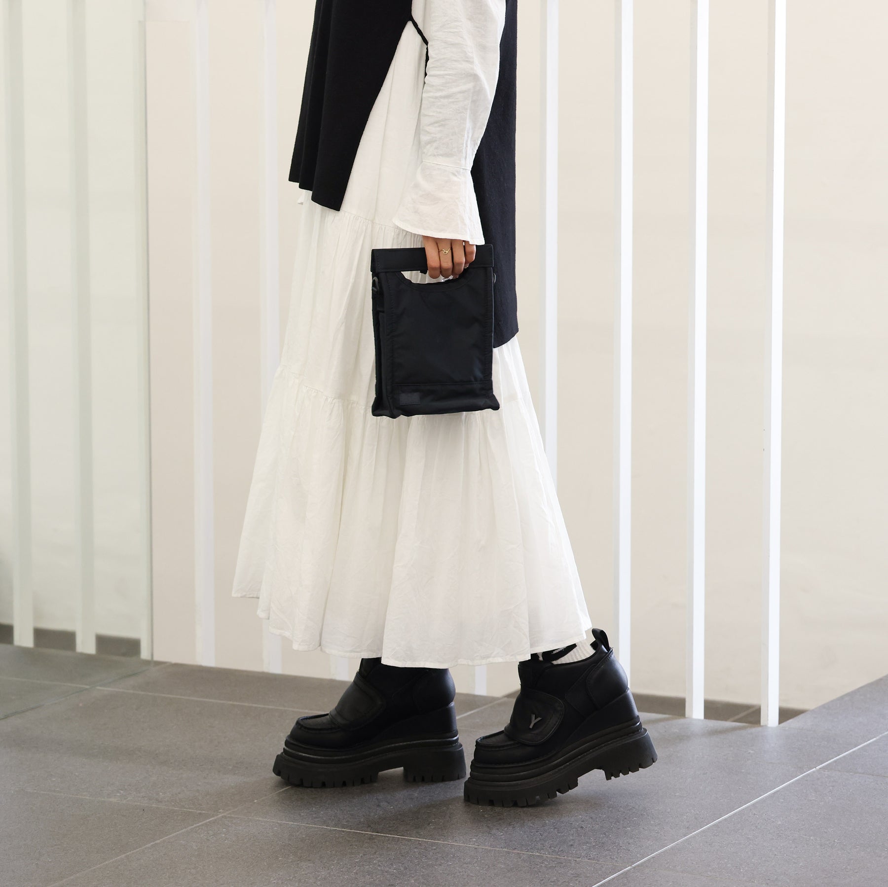 立式手提包,尺寸極小,正好可以攜帶智能手機和迷你錢包。設計簡約時尚,可與您的著裝融為一體,還可作為迷你單肩包使用,附帶斜掛帶。