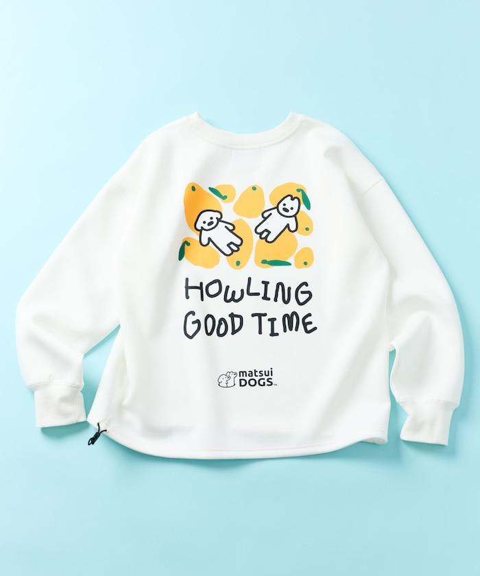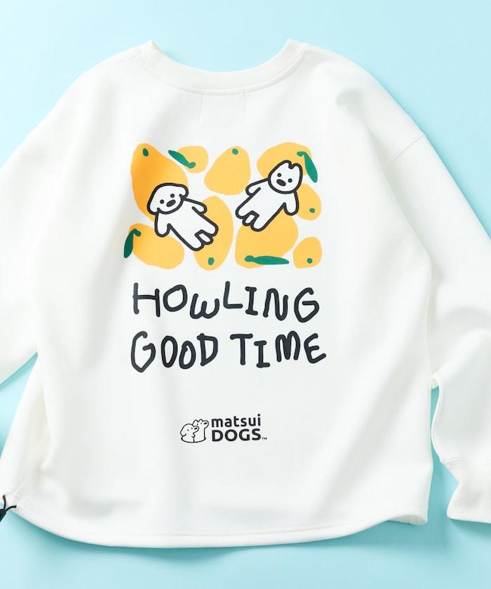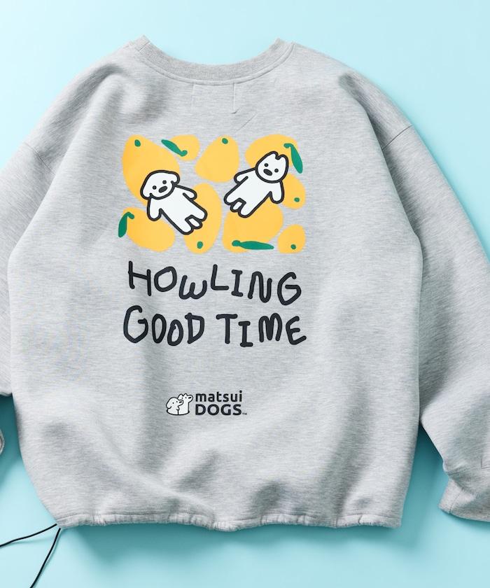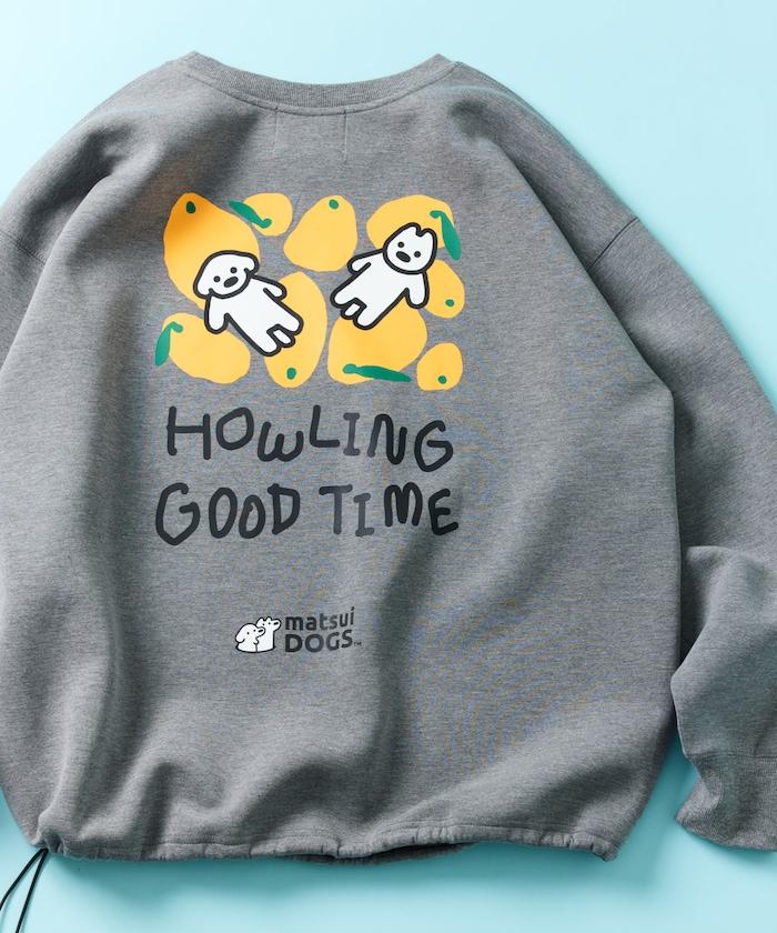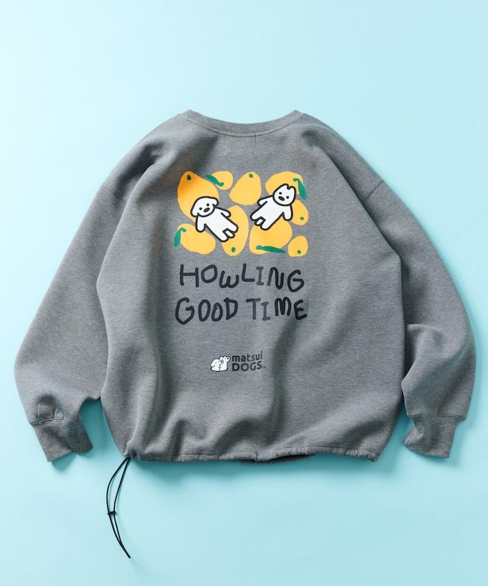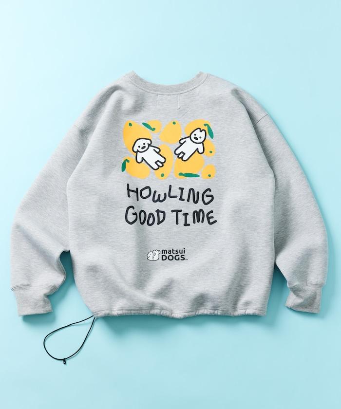 這款特別定製運動衫的背面印有醒目的檸檬圖案和 "HOWLING GOOD TIME "字樣,"HOWLING GOOD TIME "是 "嚎叫的狗 "和 "美好時光 "的諧音。