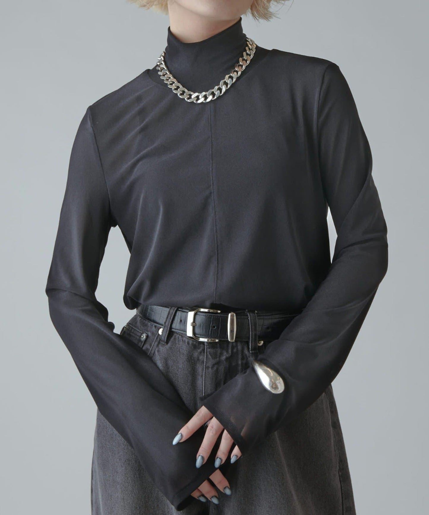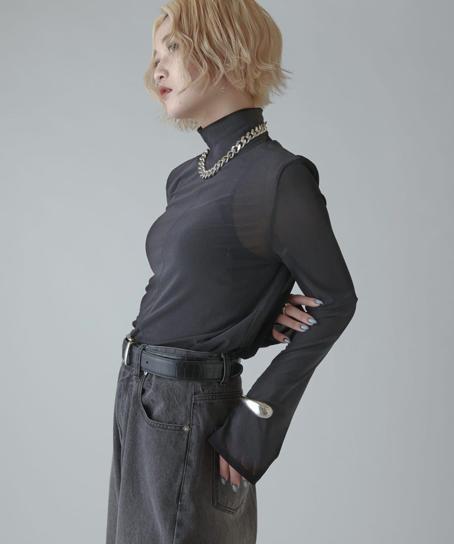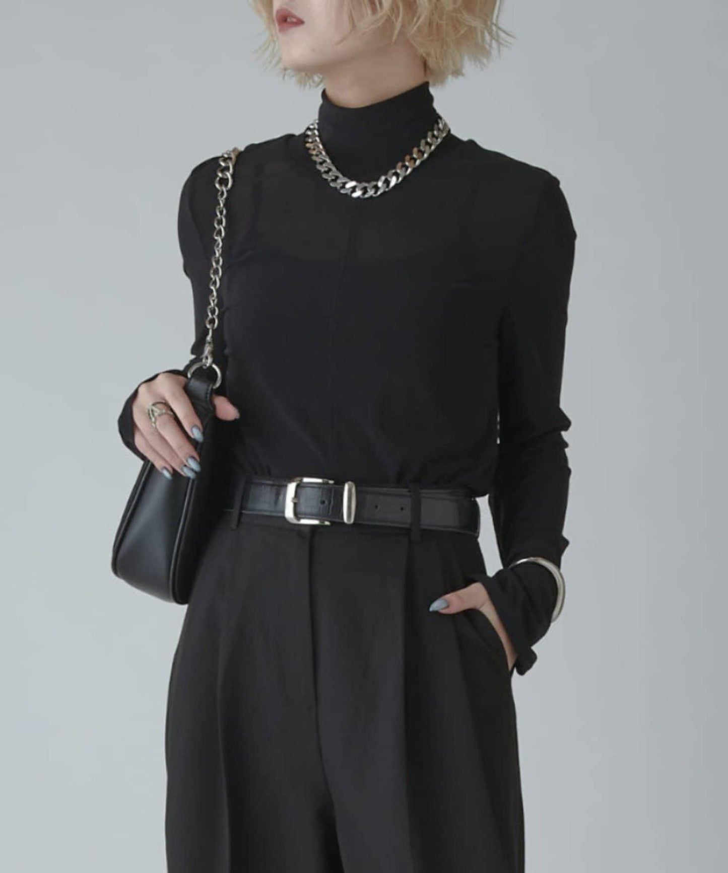 模擬領口的高度恰到好處,搭配項鍊也很不錯。